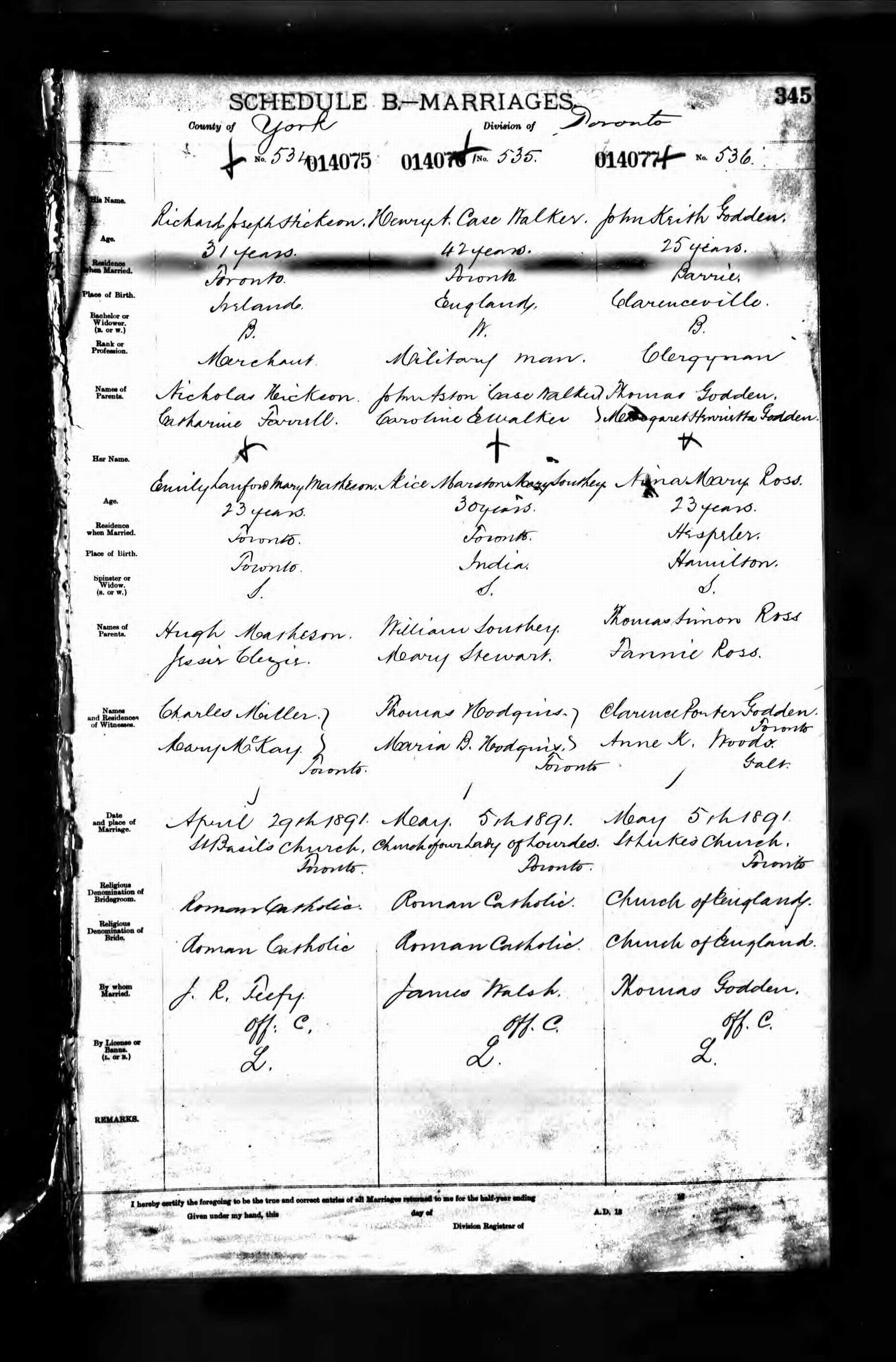 John married Nina Mary ROSS at St Lukes Church Toronto on 5 May 1891.