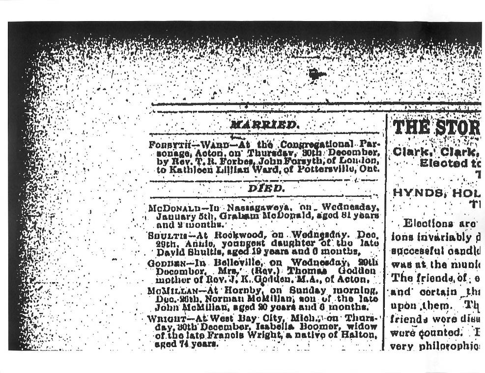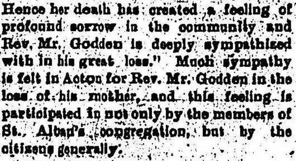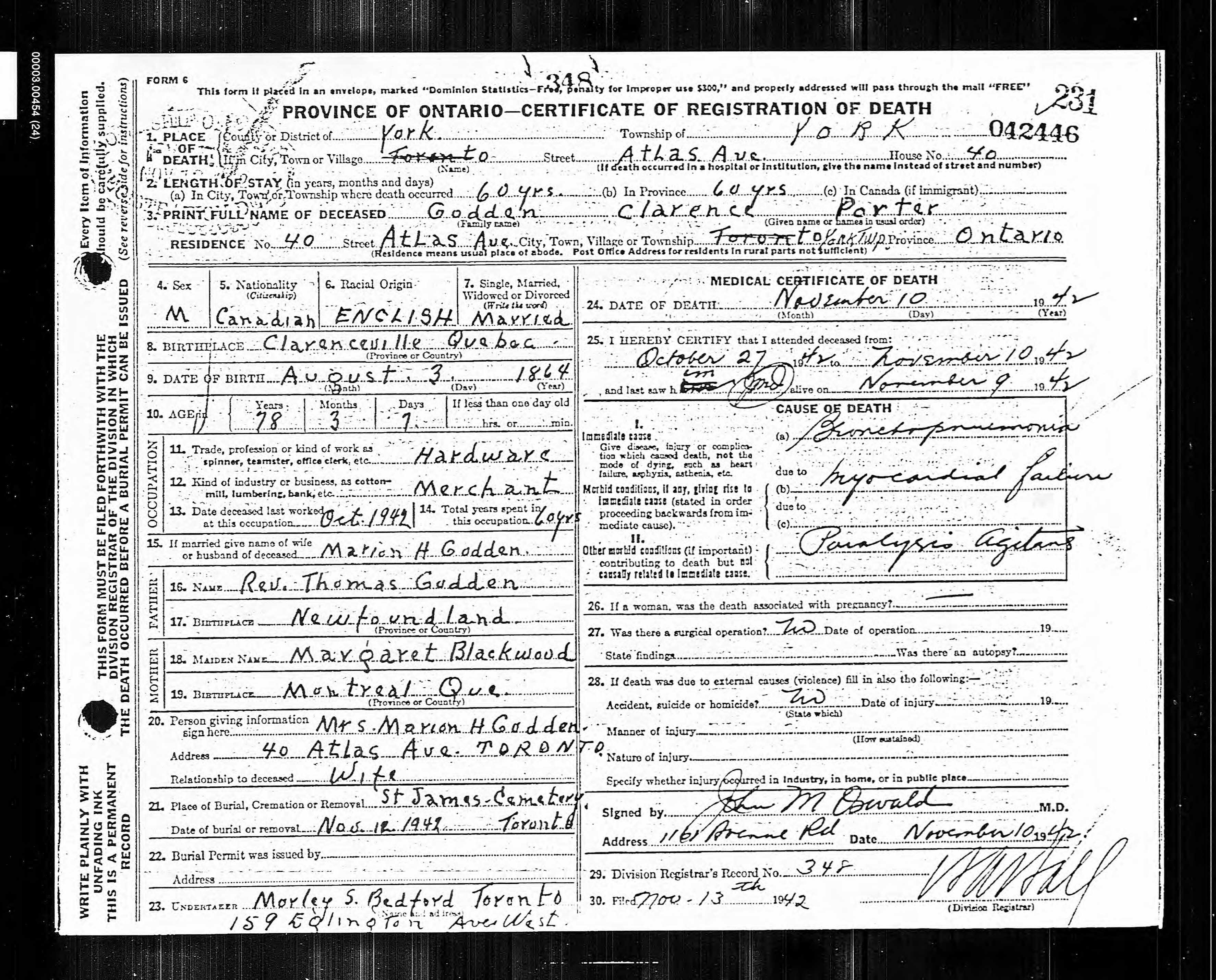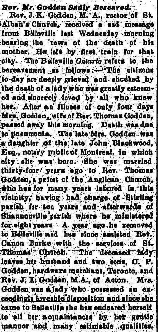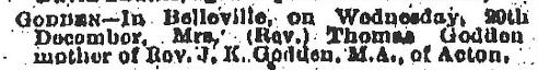 After Margaret's death, Thomas GODDEN remained at Belleville before moving to St John's Newfoundland. He was aged 62 and of his two sons, Clarence Porter was a successful hardware merchant in Toronto