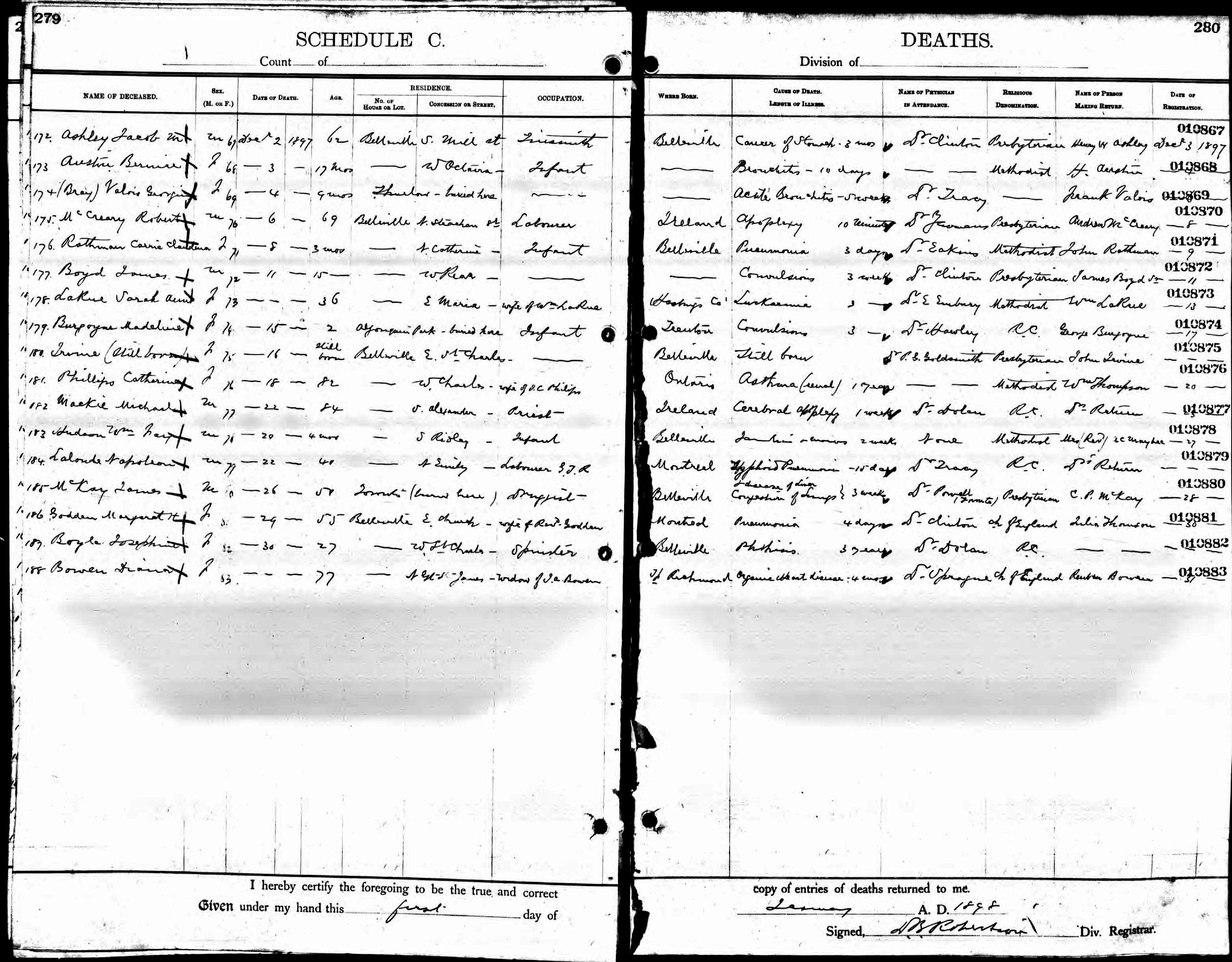 Margaret Henrietta died of pneumonia in Belleville, Ontario on 29 December 1897, aged 55 years.