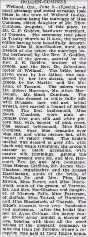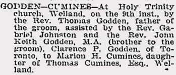Clarence Porter married Marion Horton CUMINES at Trinity Church, Welland, Ontario on 9 June 1897 in what appears to have been