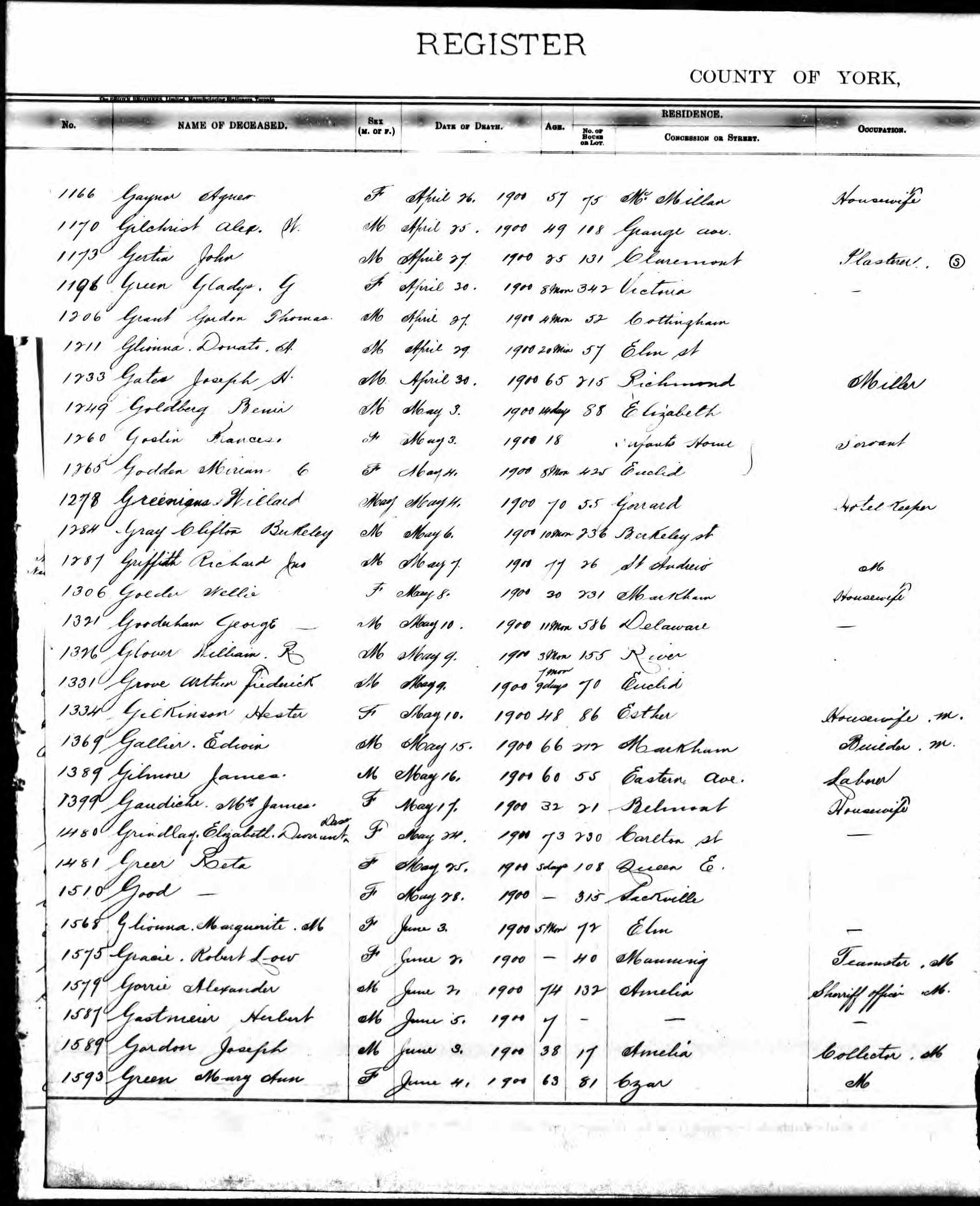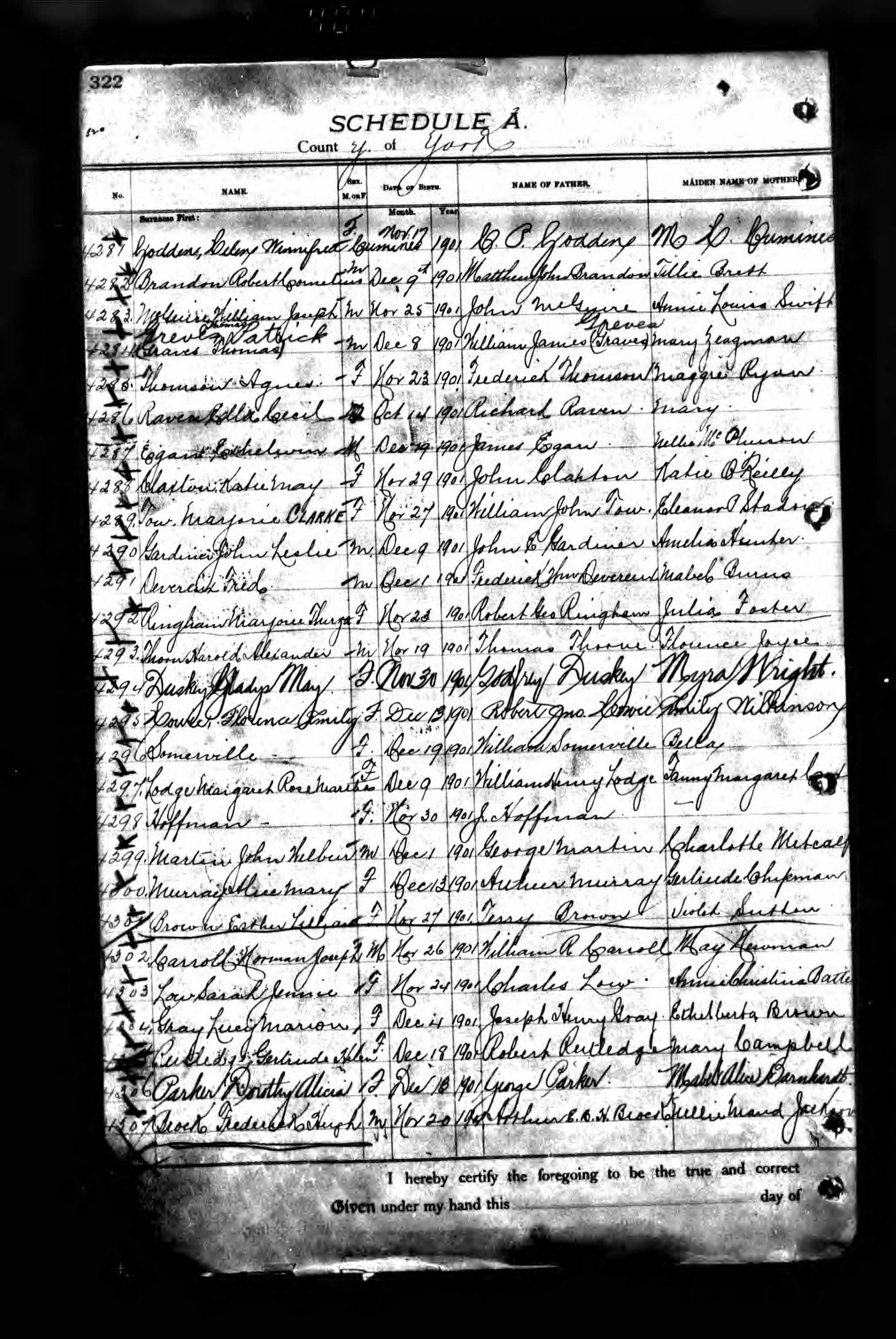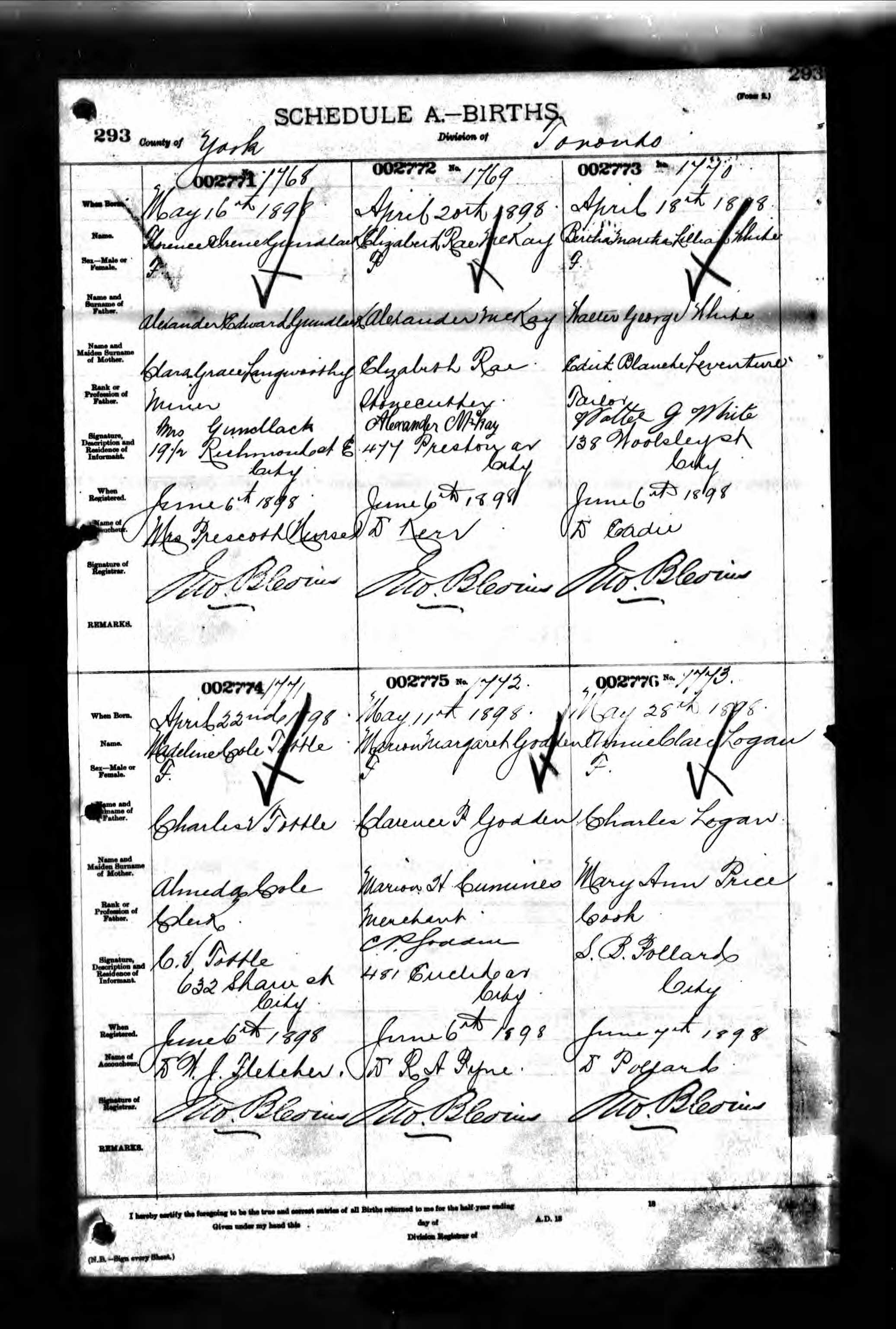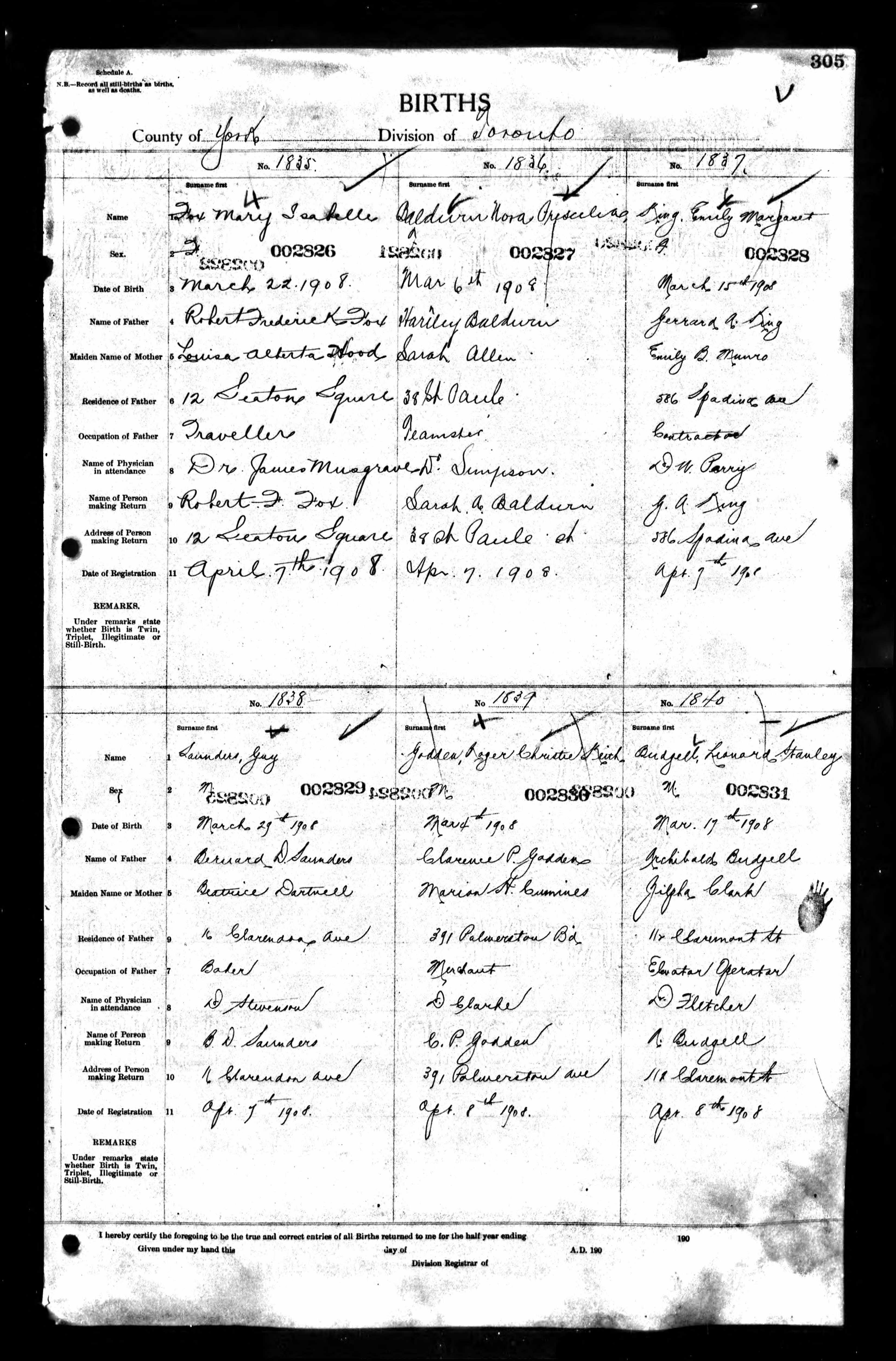 1908 birth for Roger GODDEN, at 391 Palmerston Bld, Toronto |