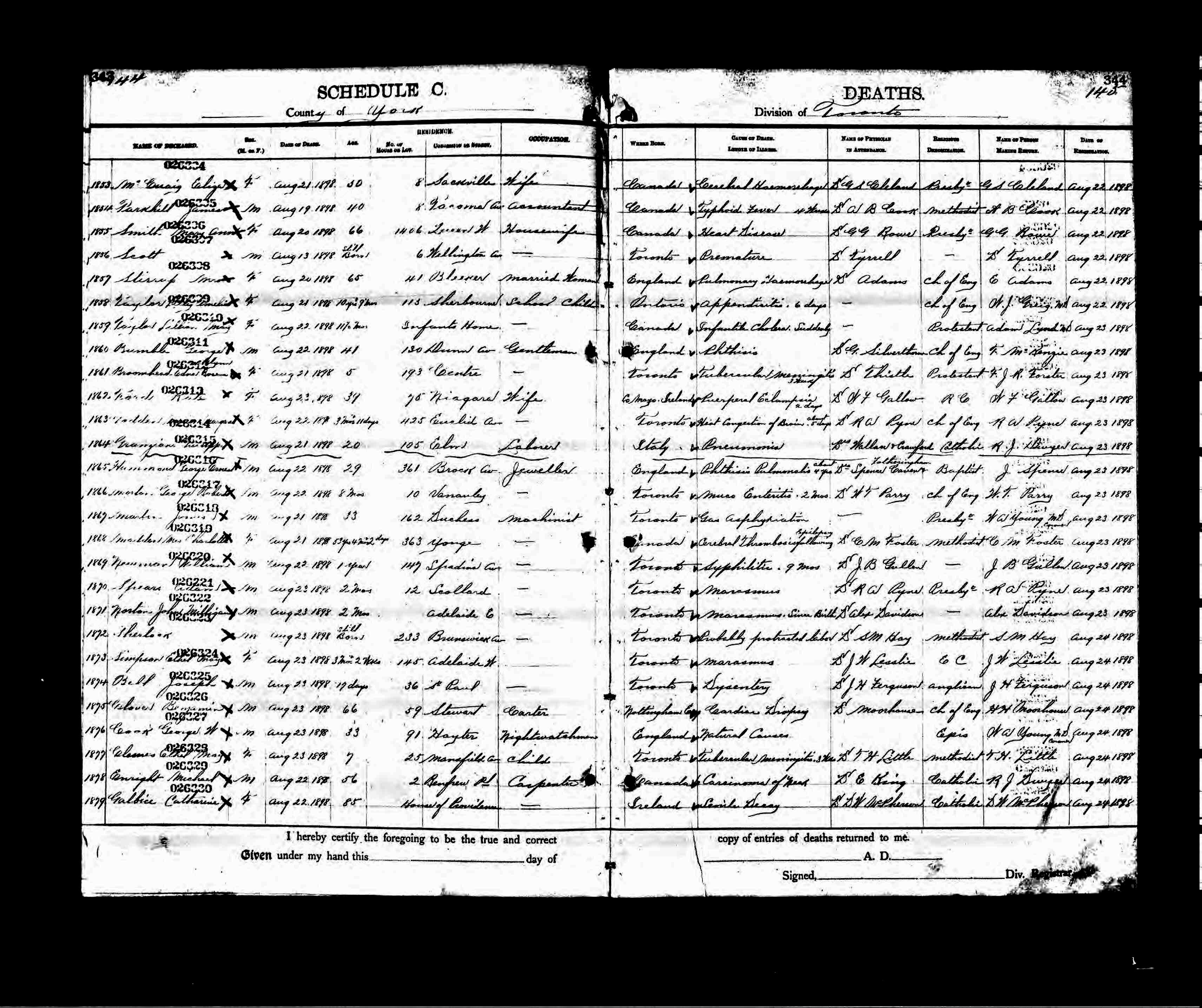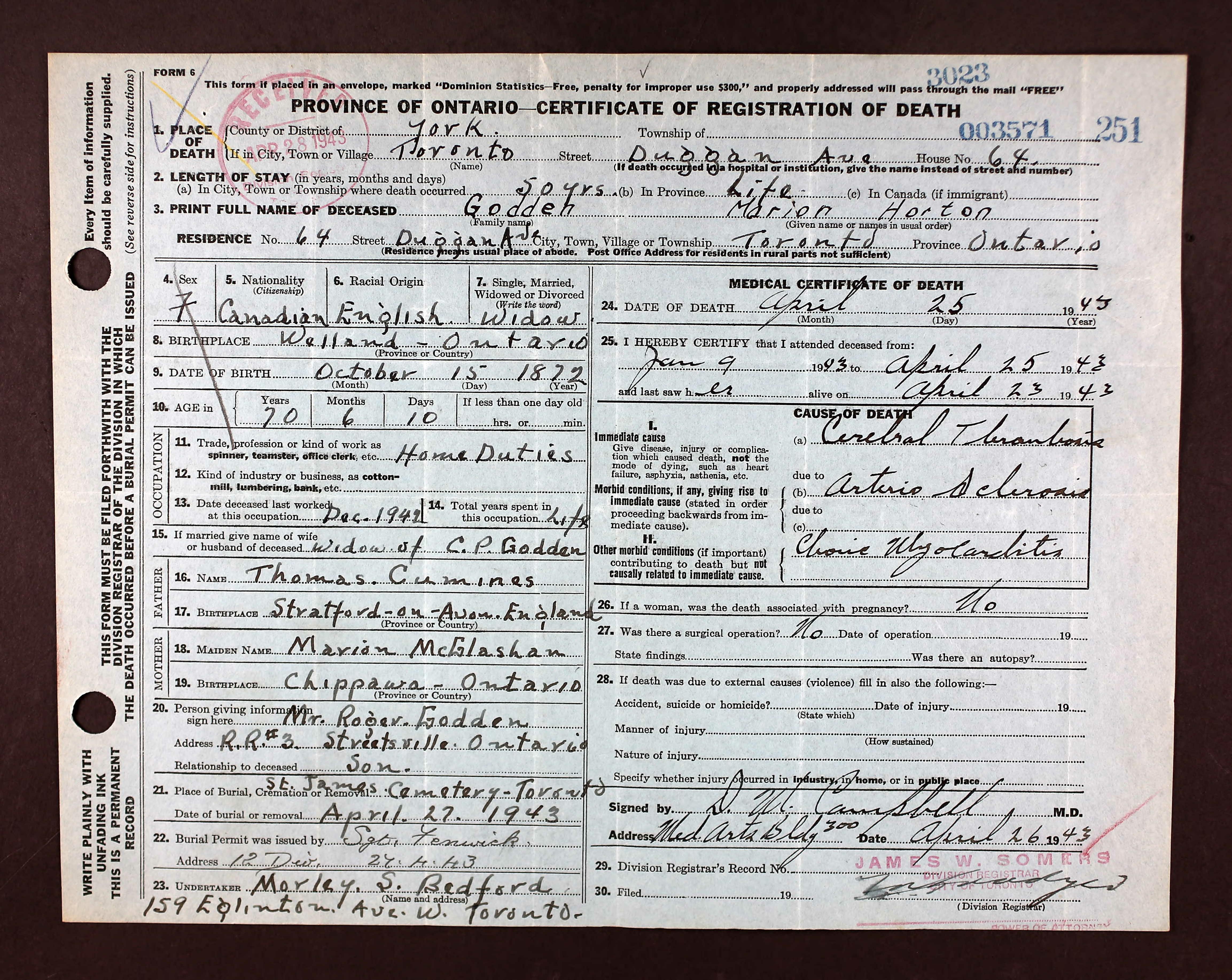 Clarence died in York, Toronto on 10 November 1942, aged 78. His wife Marion died the following year on 25 April 1943. Both are