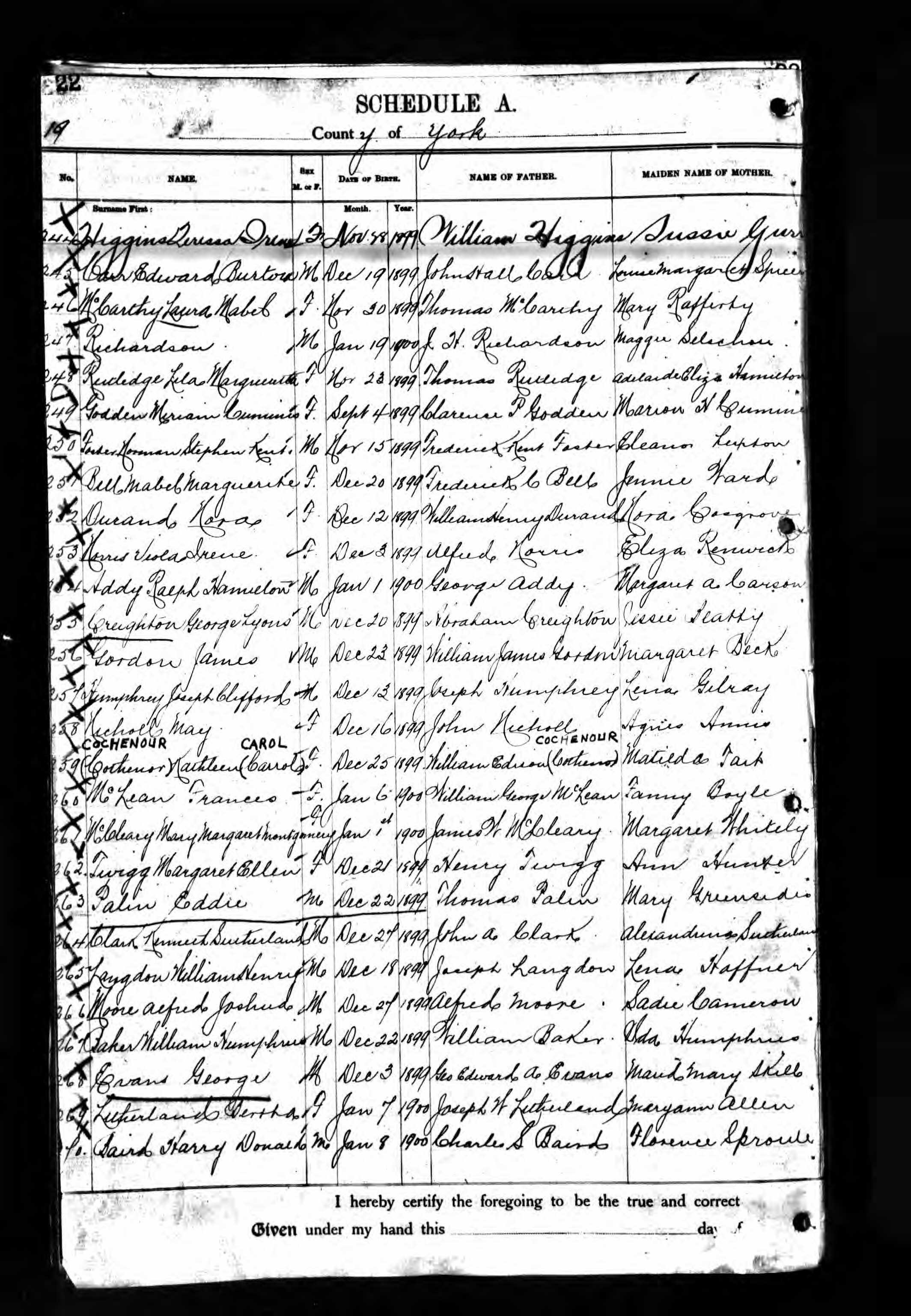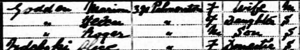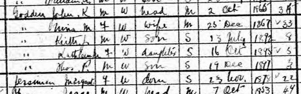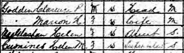 1901 census record for Clarence and Marion GODDEN, living with Helen MacGlashan and Helen CUMMINES. Note that 2 doors away lived Clarence's sisters Jane PORTER and Mary GODDEN |