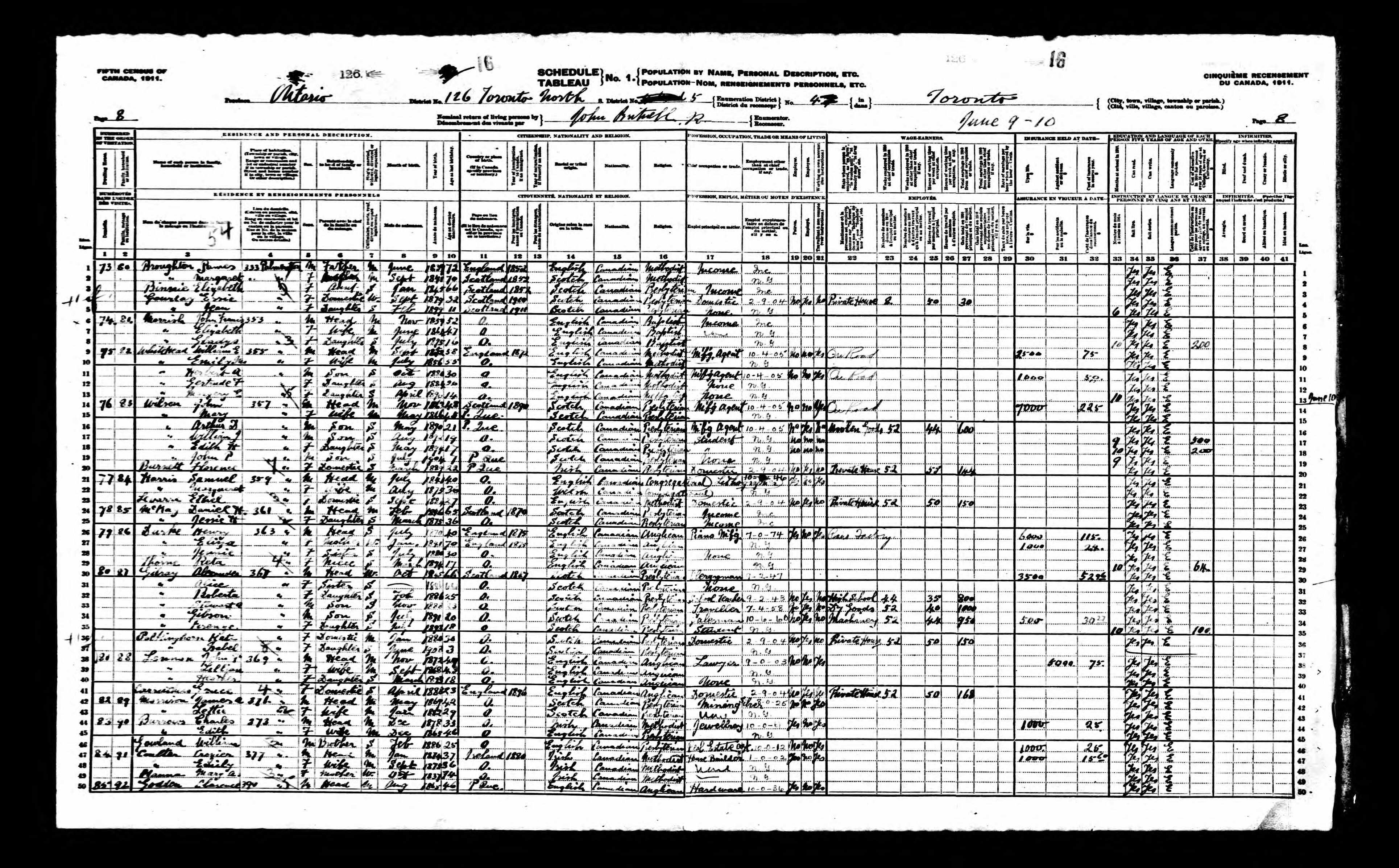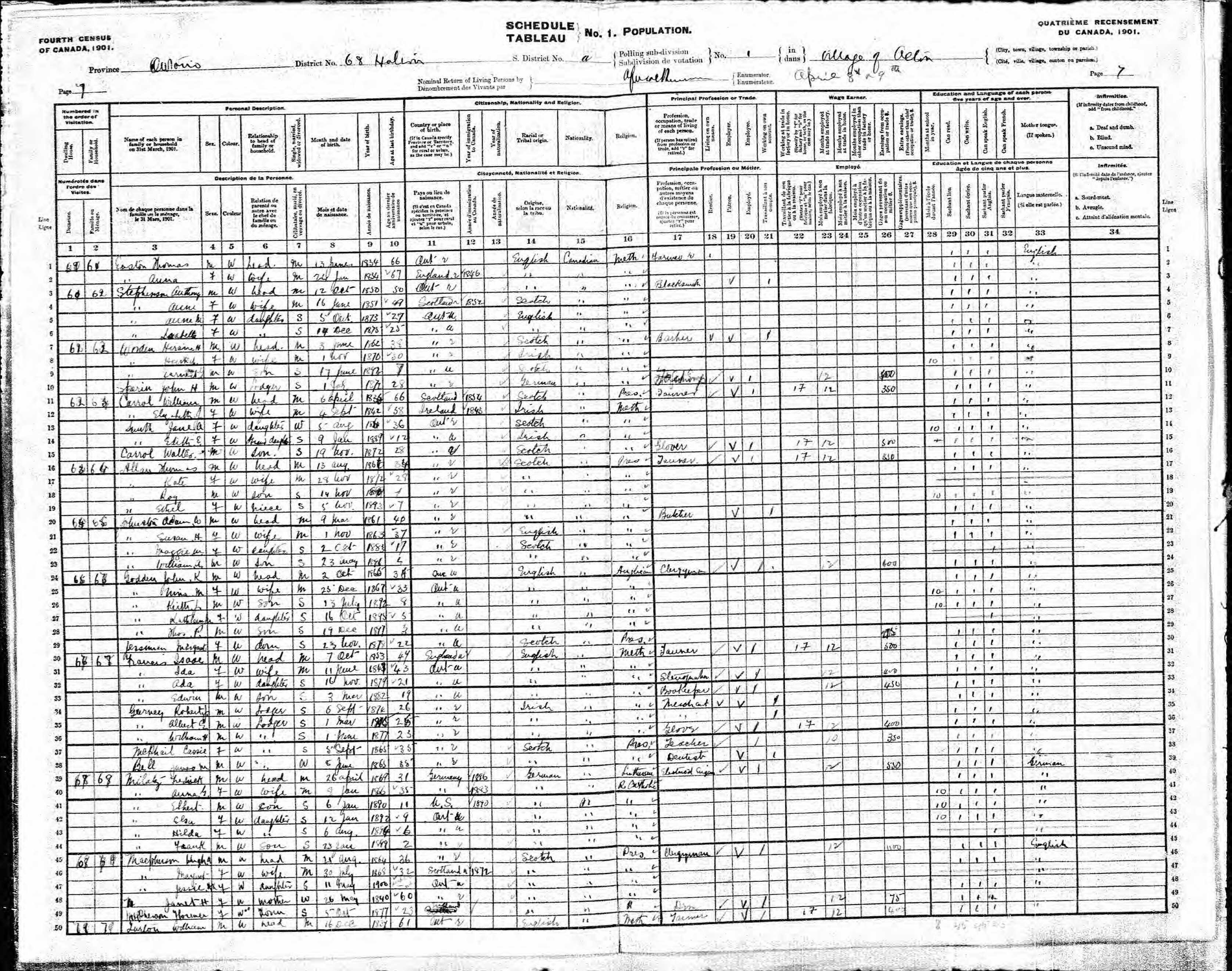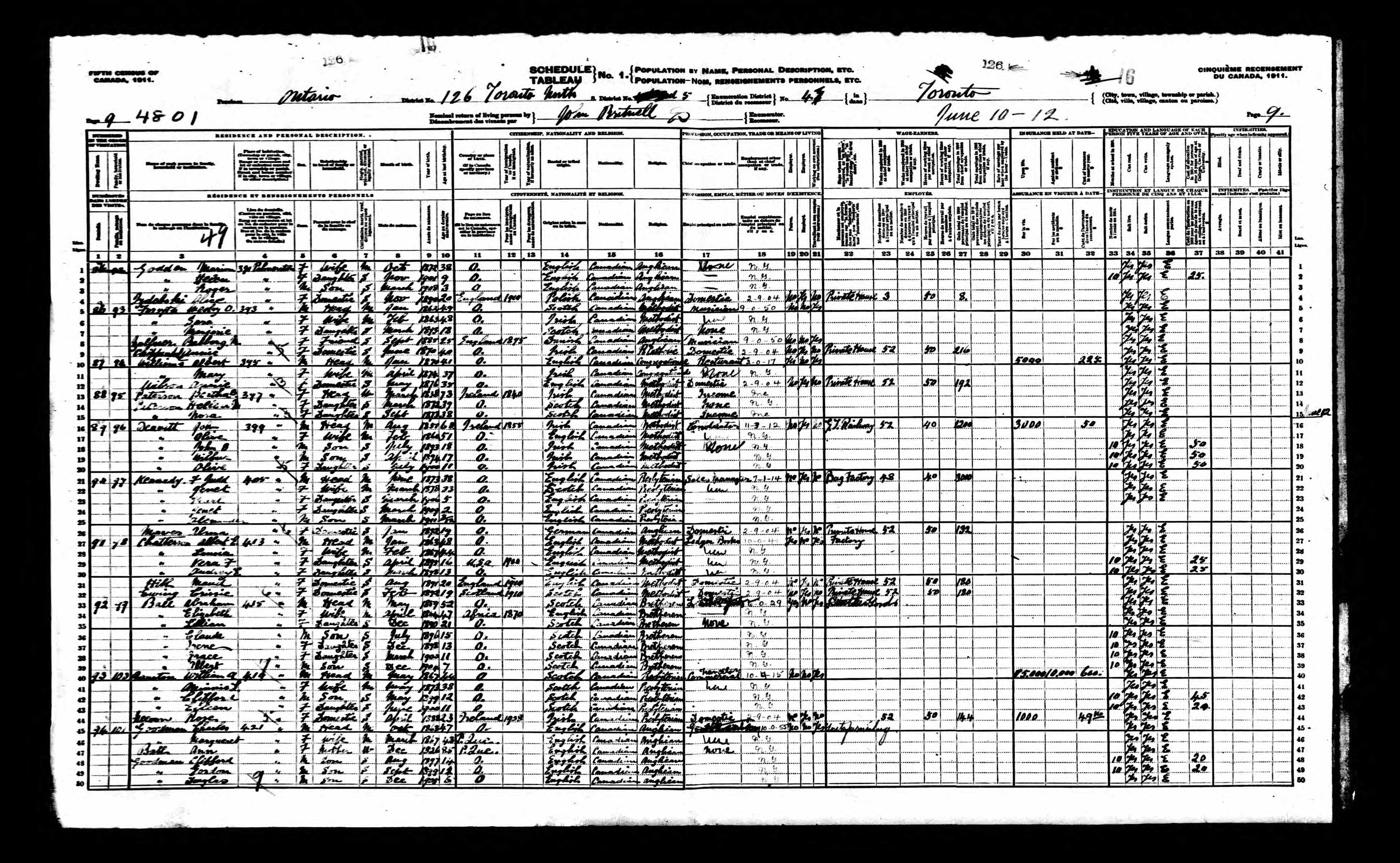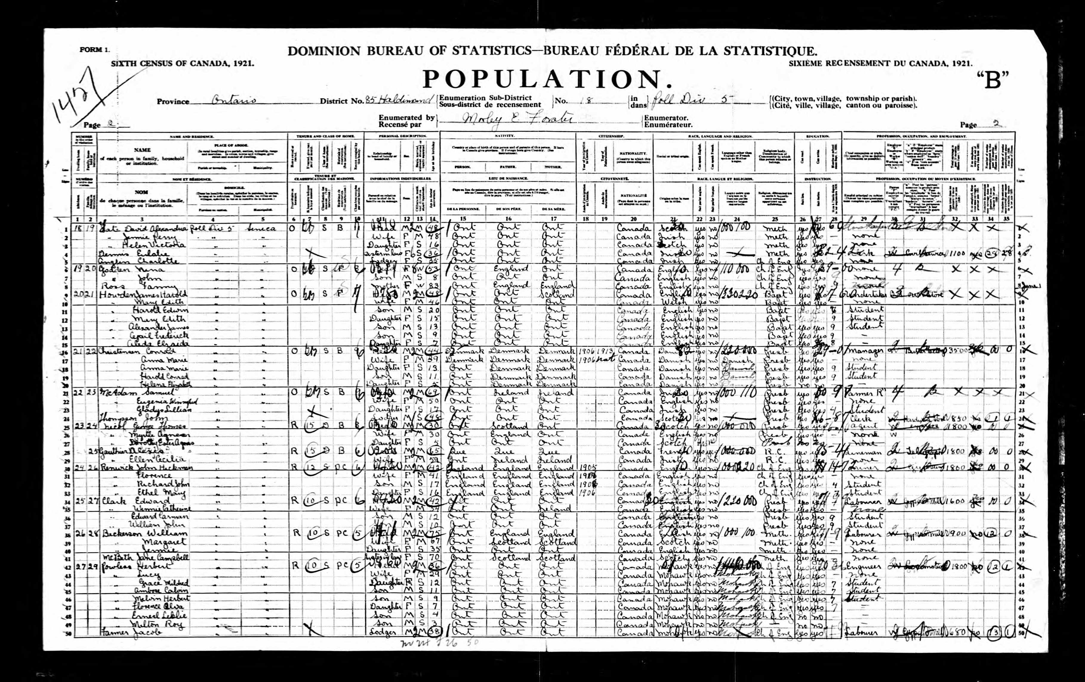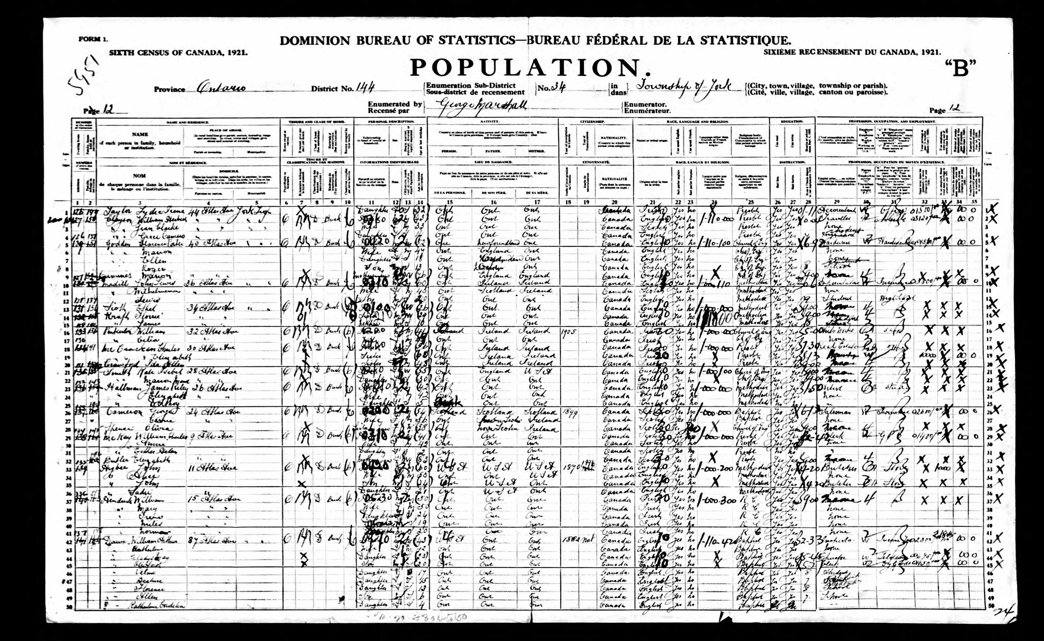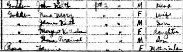 1921 census record for Clarence and Marion GODDEN, living with Helen MacGlashan and Helen CUMMINES. Note that 2 doors away lived Clarence's sisters Jane PORTER and Mary GODDEN |