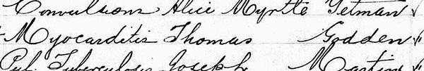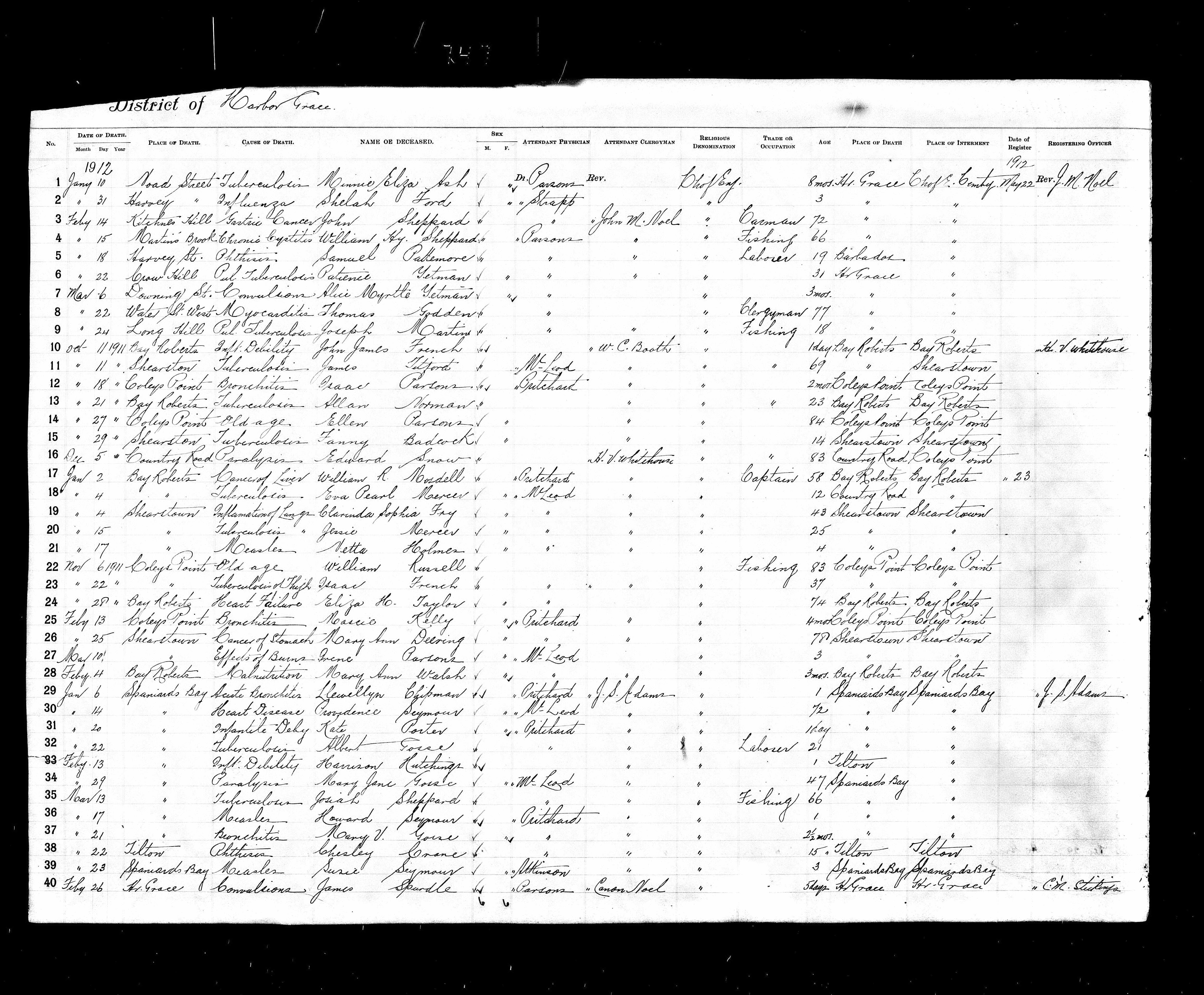 Thomas GODDEN died at his home at Water St West, Harbour Grace, Newfoundland on 22 March 1912. He was buried at the local St Paul's Church cemetery.