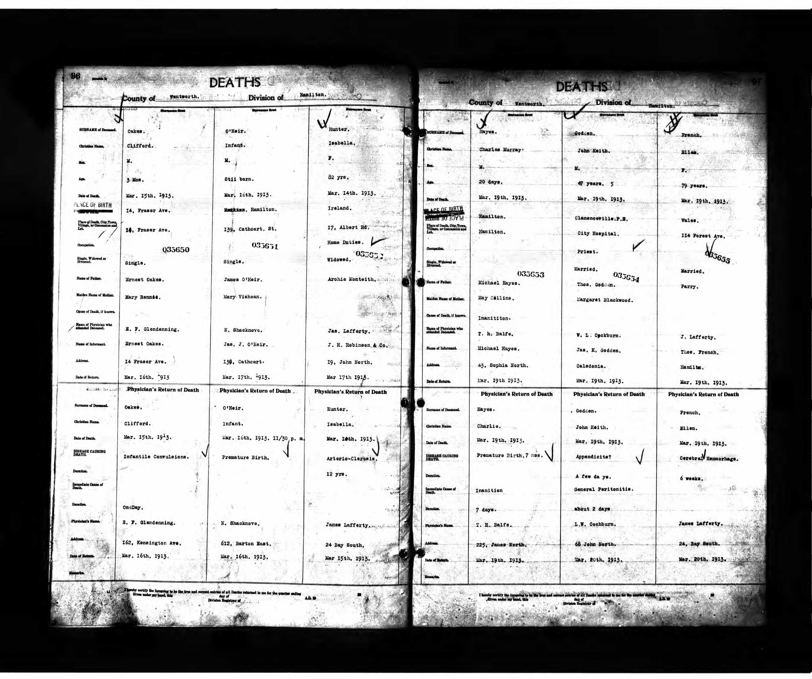 John Keith died 19 March 1913 at the hospital in Hamilton Ontario, Canada. He had been admitted with appendicitis.