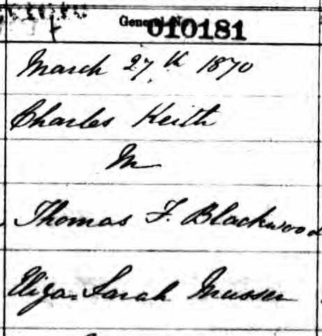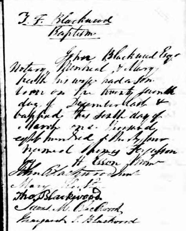 The Family of Rev Dr Daniel KEITHThomas Fergusson BLACKWOOD (1833-1896) oldest son of John BLACKWOOD and Mary KEITHThomas Ferguson BLACKWOOD was the oldest child of Mary KEITH and John BLACKWOOD. Mary already had a daughter (Jane) from her brief marriage to William PORTER see Mary's story here).