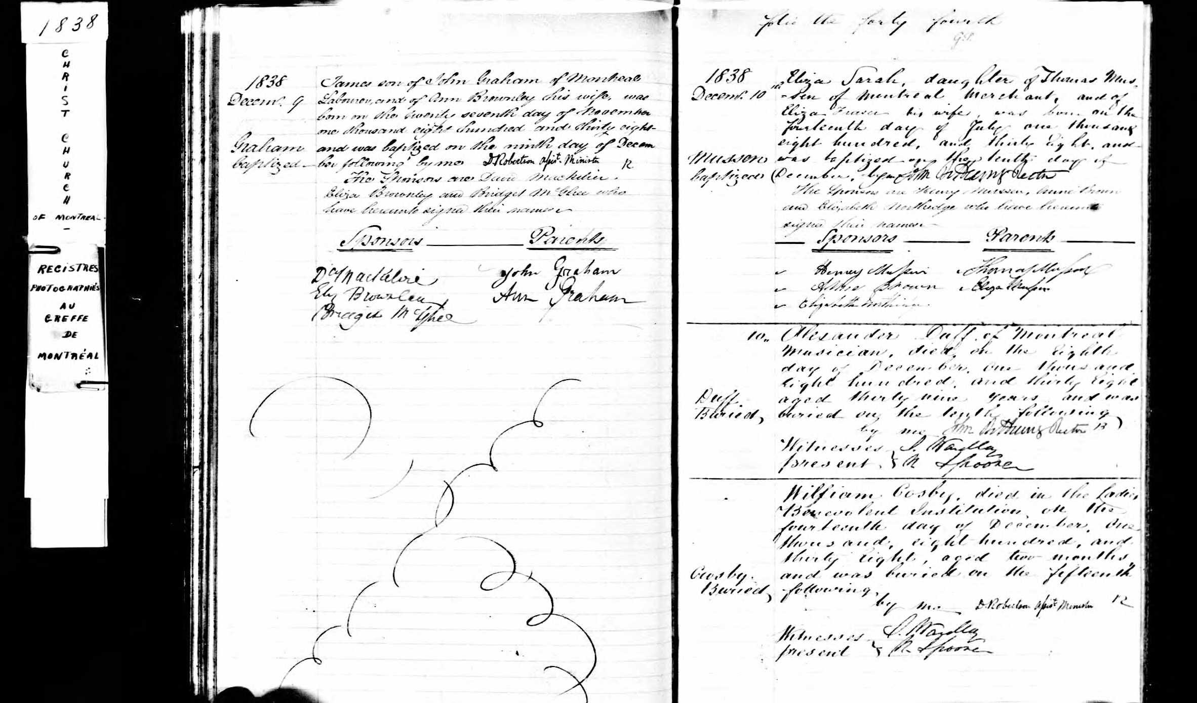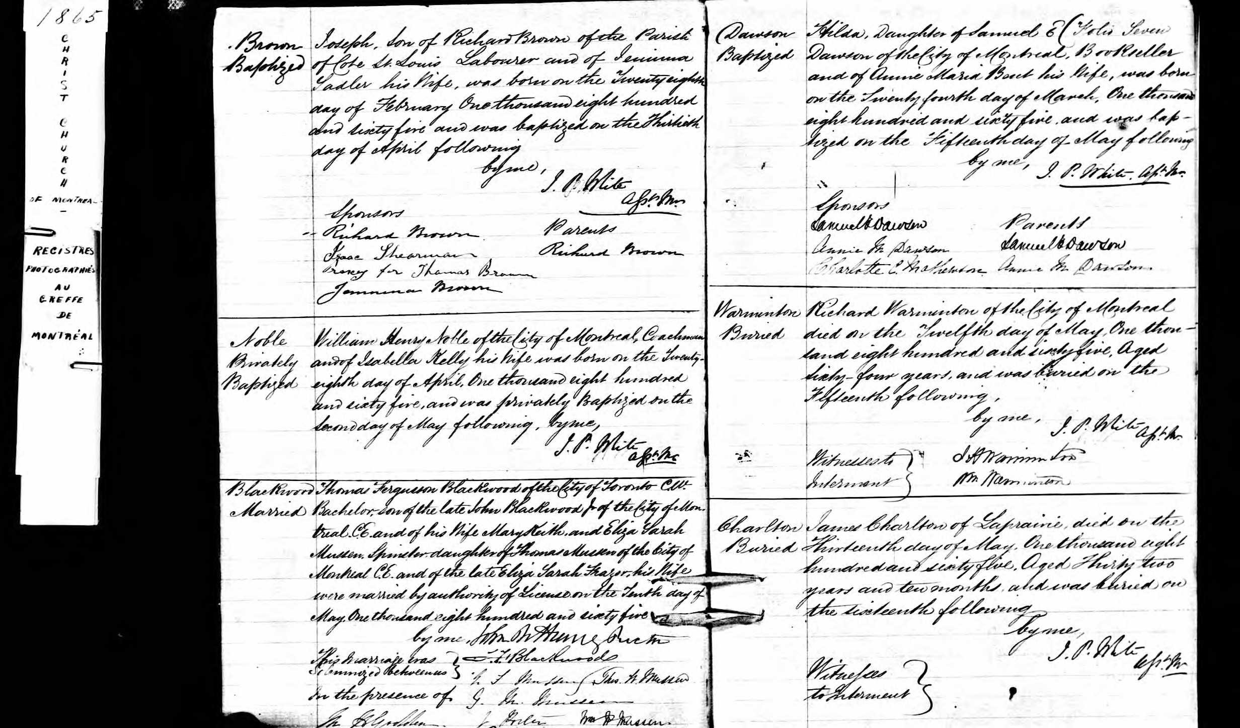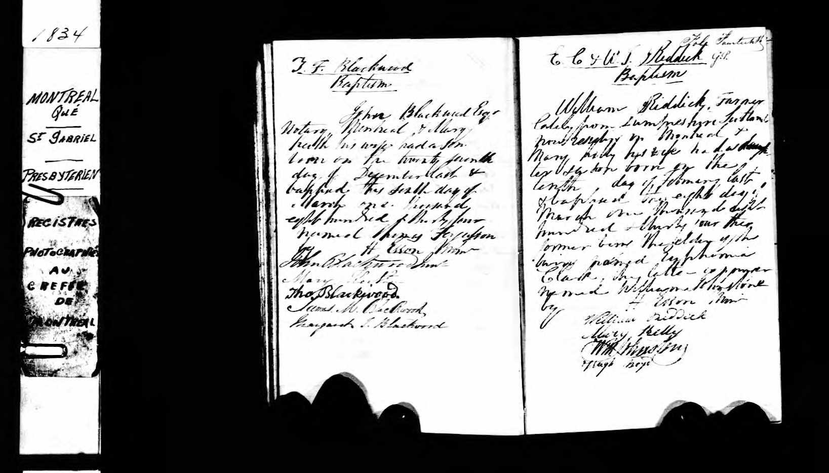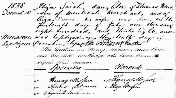 Birth in MontrealThomas Ferguson was born 27 December 1833 in Montreal, Canada and baptised at the Protestant St. Gabriel Church in Montreal on 6 March 1834. The witnesses to the baptism were Thomas BLACKWOOD (Junior), Mary KEITH, Thomas BLACKWOOD, James BLACKWOOD and Margaret BLACKWOOD.