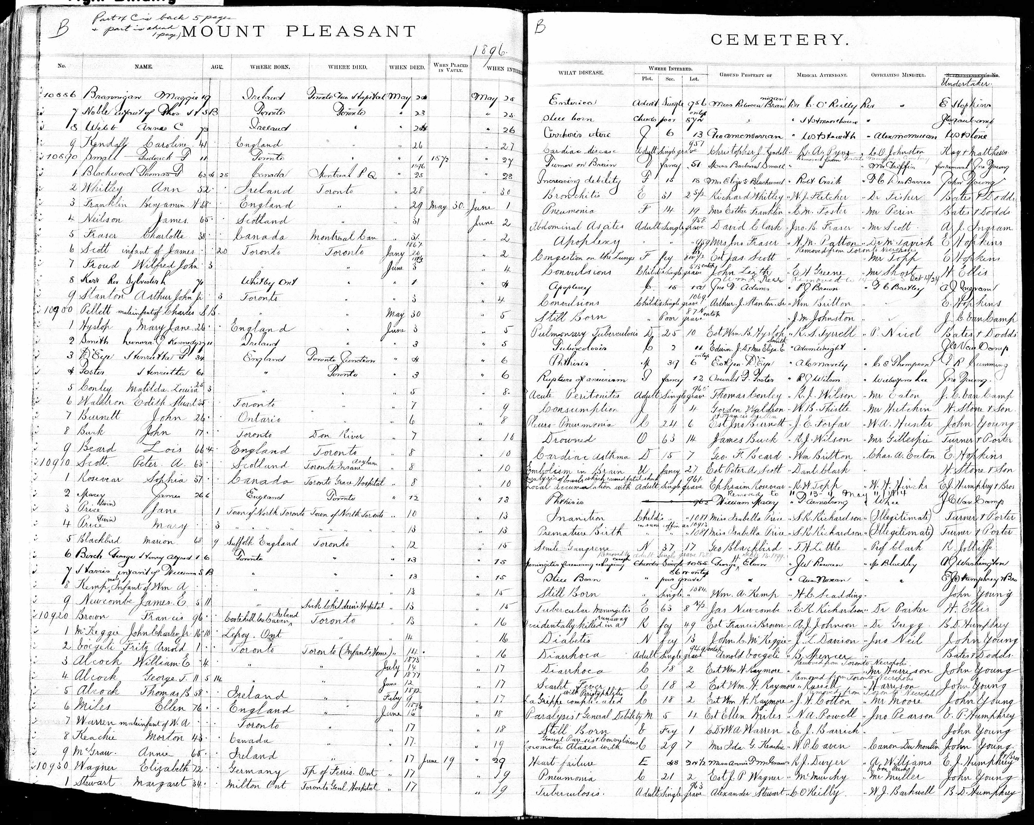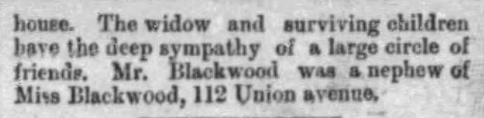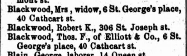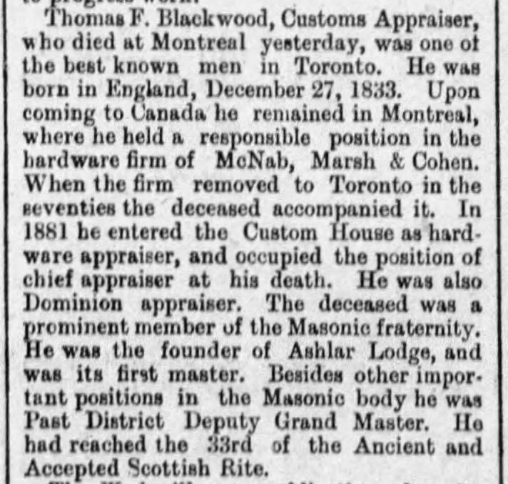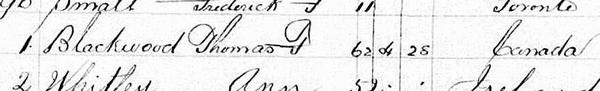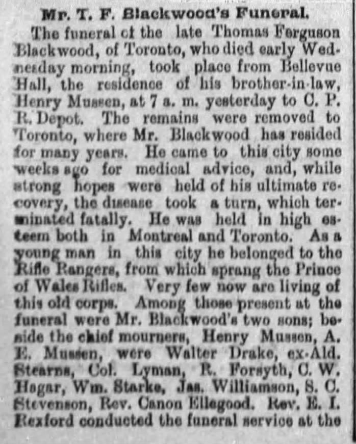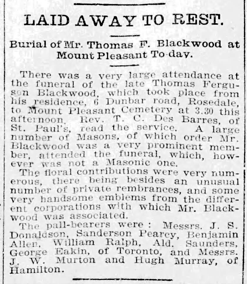 Census recordsThe census records for Canada are unusual in that they did not record residential addresses until 1911. Death of Thomas BLACKWOODThomas died on 25 May 1896 of "increasing debility", although the newspapers reported the cause of death was "cancer". He had travelled to Montreal for medical treatment but died there. His body was transported back to Toronto for the funeral and he was buried in the Mt Pleasant Cemetery, Toronto, plot F15/18.