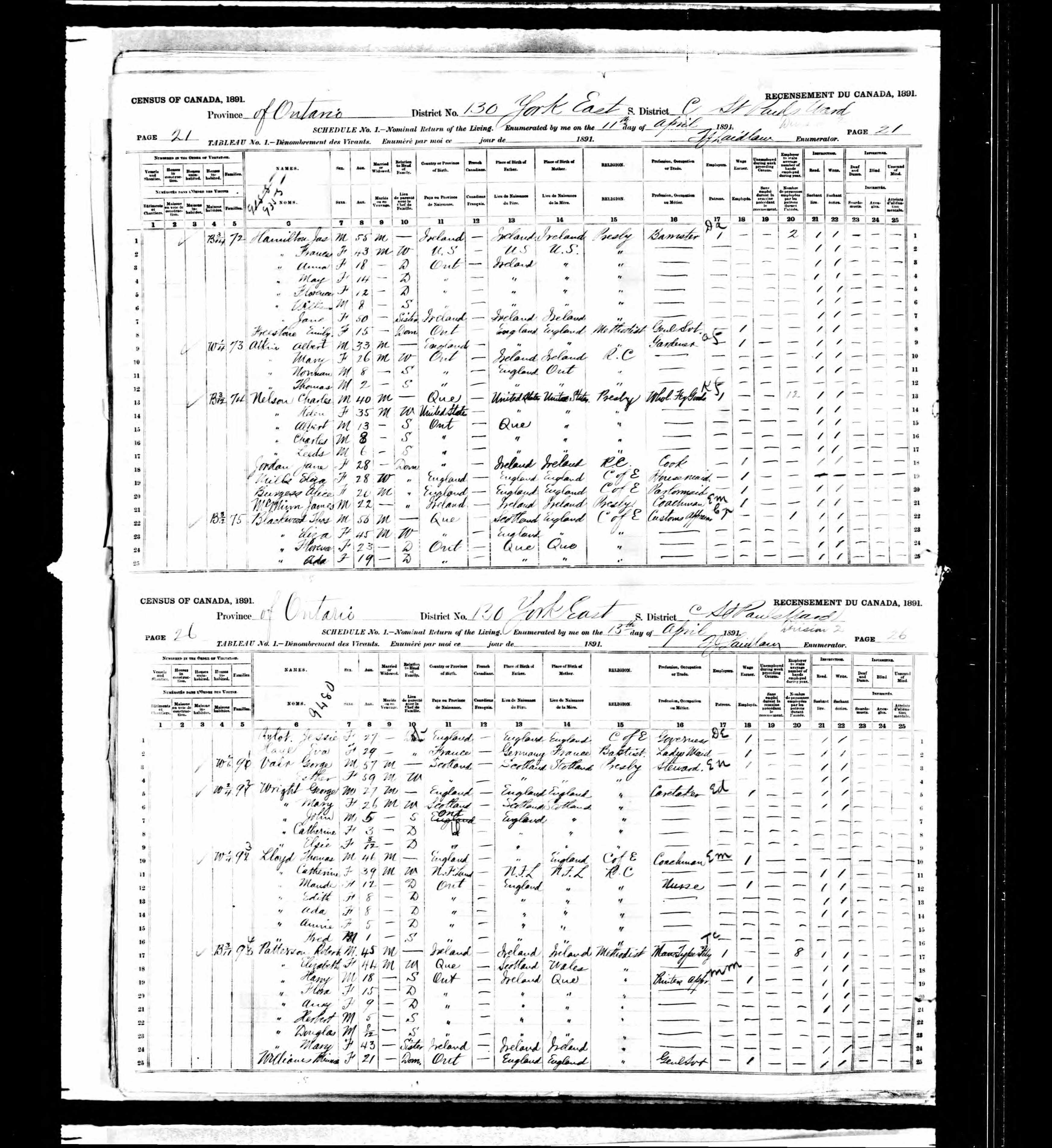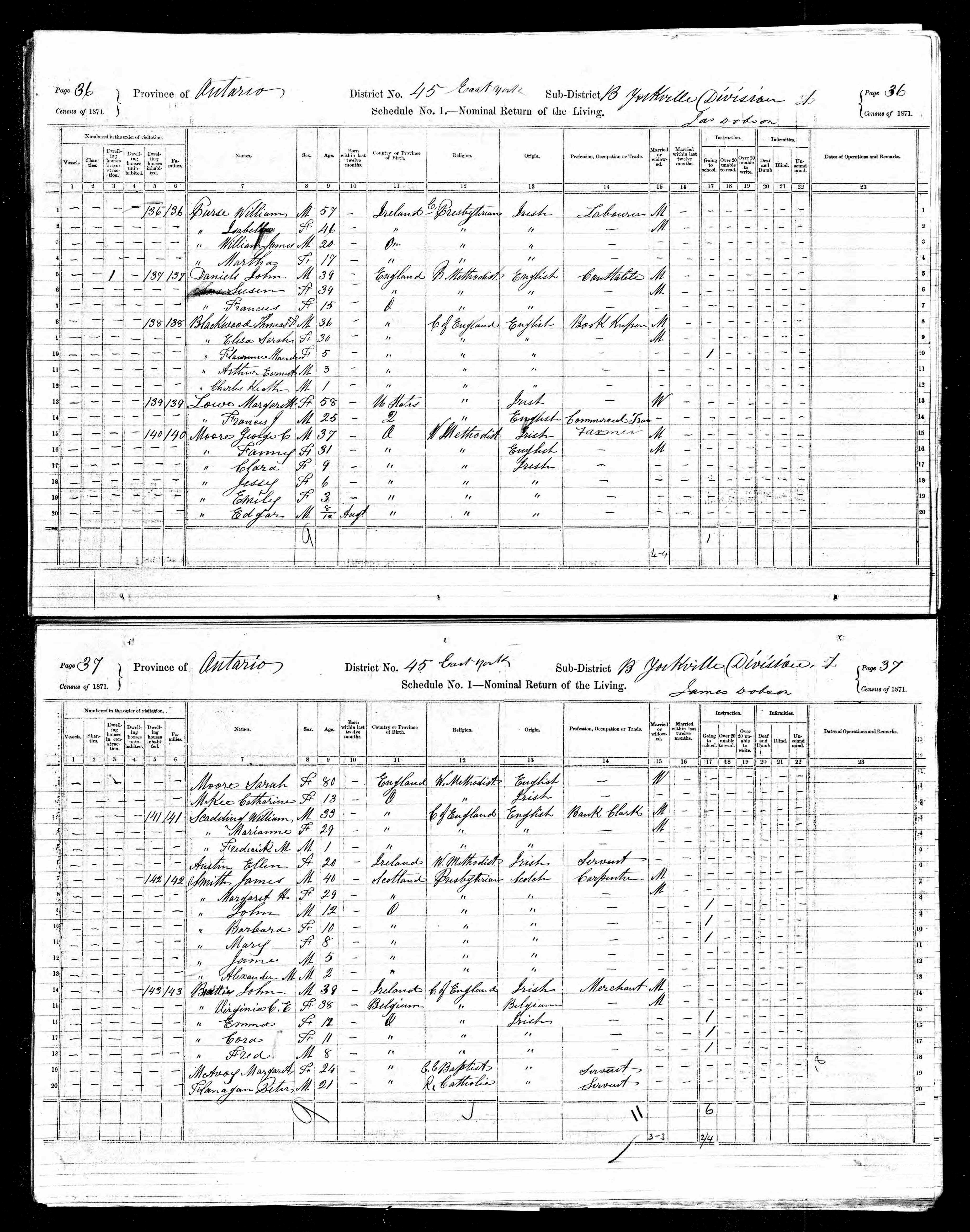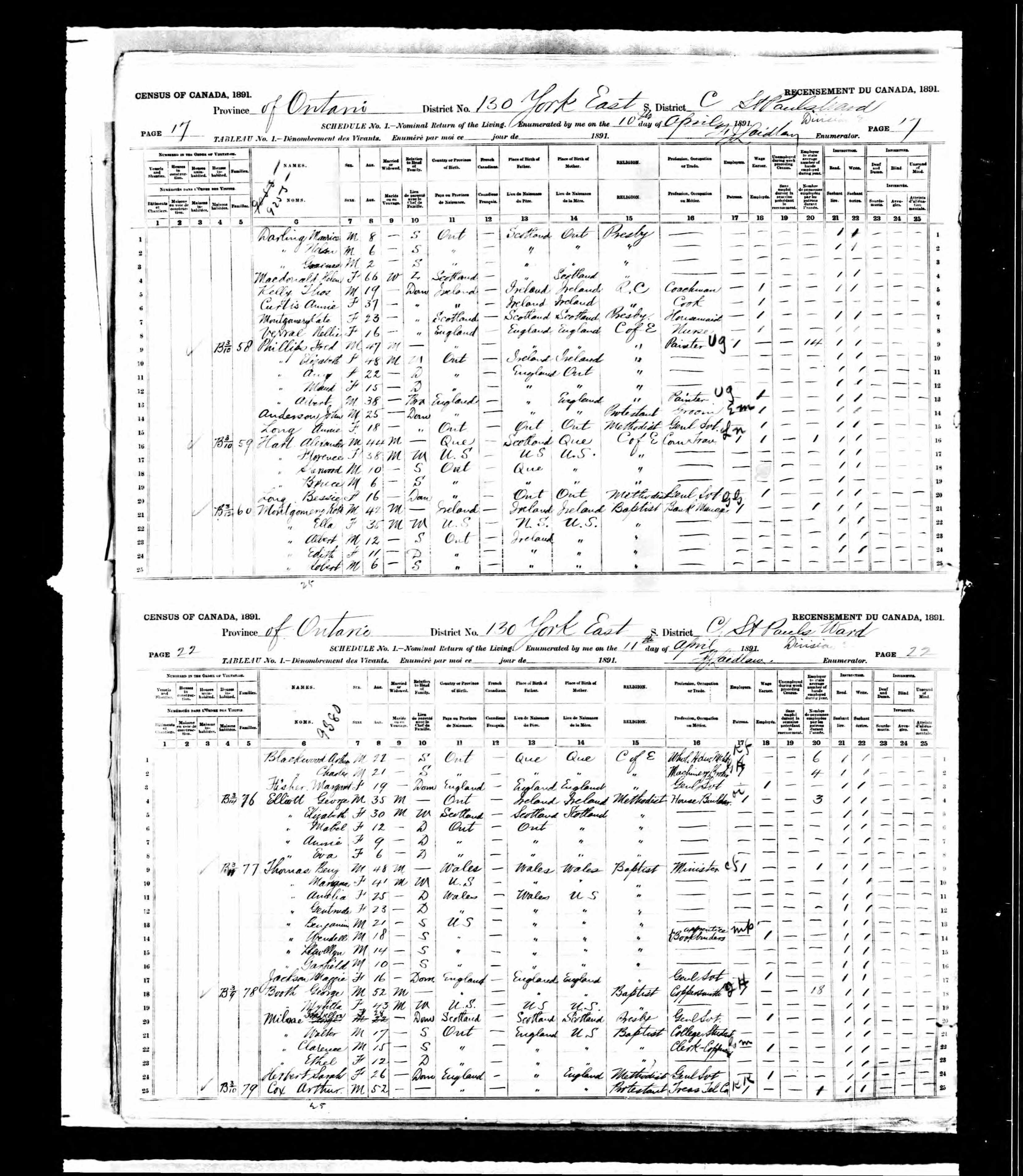 Census recordsThe census records for Canada are unusual in that they did not record residential addresses until 1911. Death of Thomas BLACKWOODThomas died on 25 May 1896 of "increasing debility", although the newspapers reported the cause of death was "cancer". He had travelled to Montreal for medical treatment but died there. His body was transported back to Toronto for the funeral and he was buried in the Mt Pleasant Cemetery, Toronto, plot F15/18.