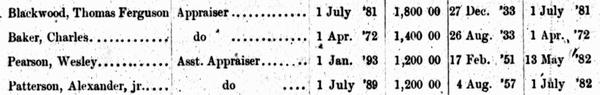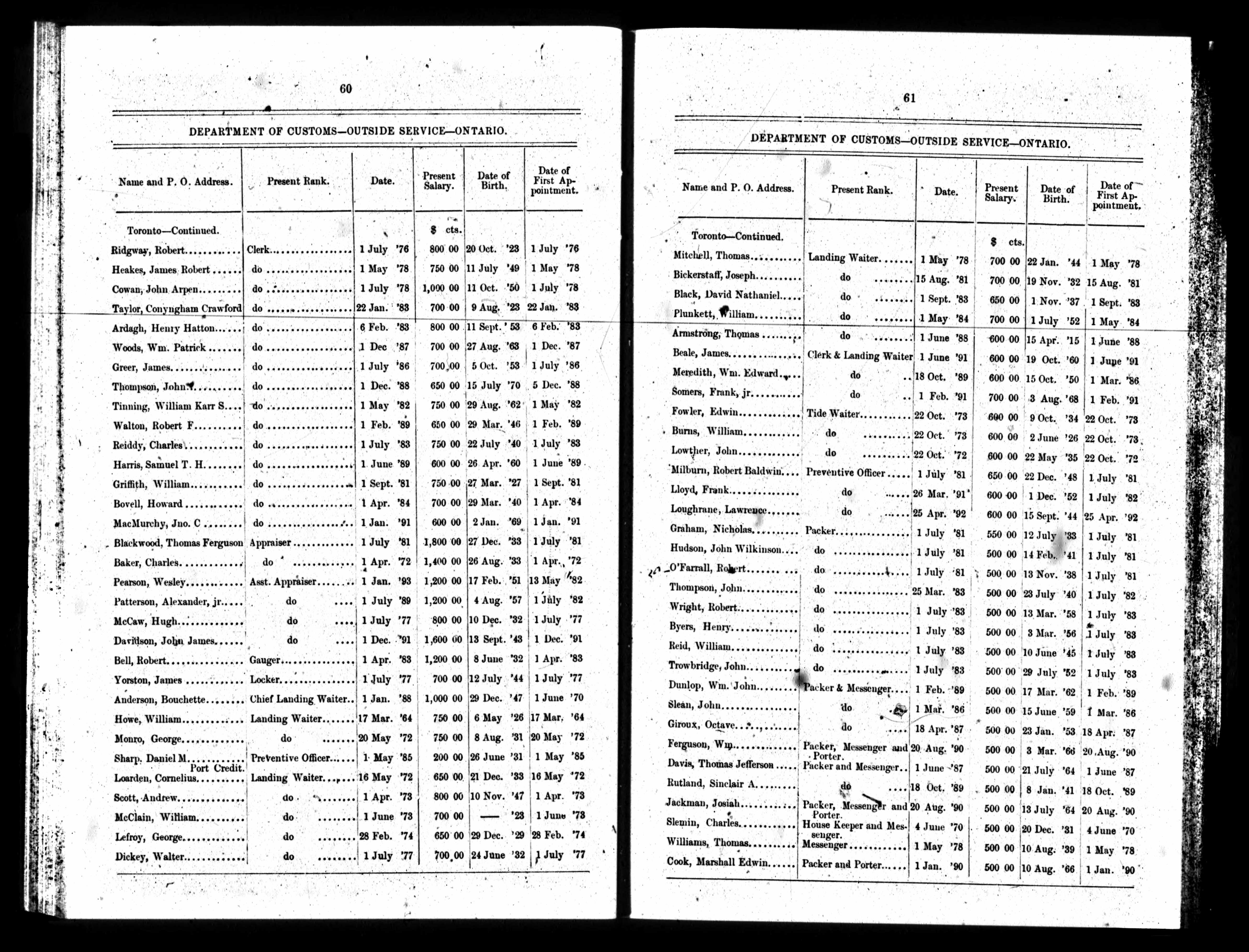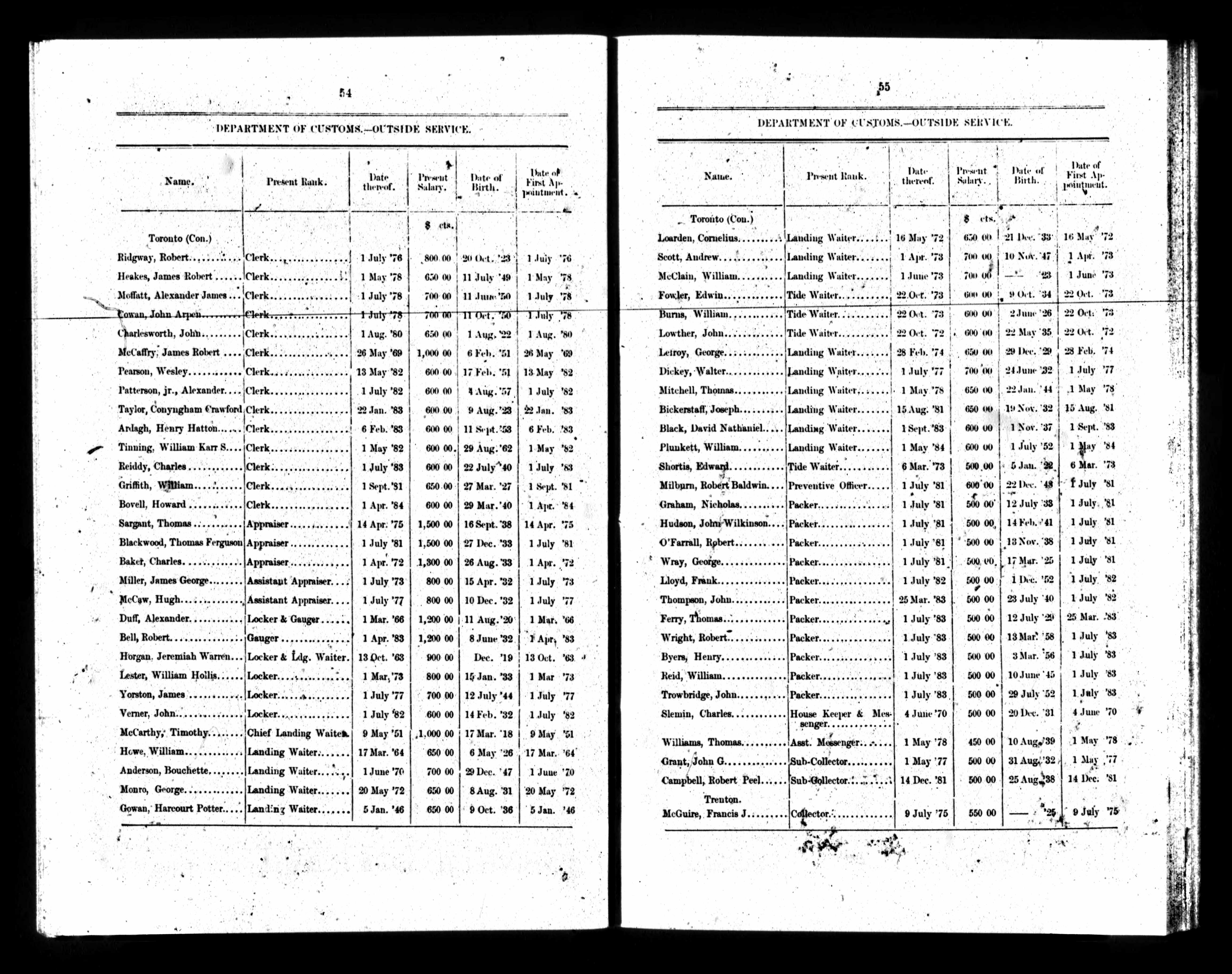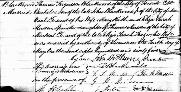 Marriage to Eliza Sarah MUSSENThomas married Eliza Sarah MUSSEN on 10 May 1865 at Christ Church Cathedral, Montreal. Sarah had been born in Montreal on 14 July 1838 and baptised on 10 December 1838 to Thomas MUSSEN and Eliza Sara (FRASER). Thomas was a shop owner selling haberdashery and dry goods. Work RecordsShortly after their marriage Thomas and Eliza moved to Toronto, living in Jarvis St. In 1874 they were living at William St, Yorkville, Toronto and Thomas was working as a manager for J. MacNab & Co (dry goods merchant). In 1878 he was now a "broker" living at 16 Front St East. The census records for 1871 tell us Thomas worked as a bookkeeper, but on 1 July 1881 he joined the Civil Service as a Customs Appraiser on a salary of $CAD1500 per year. By 1895 his salary had risen to $1800 (about $CAD50,000 today. Note that on the list Mr Charles Baker had been in the job for 9 years longer than Thomas but his rise was only $100.