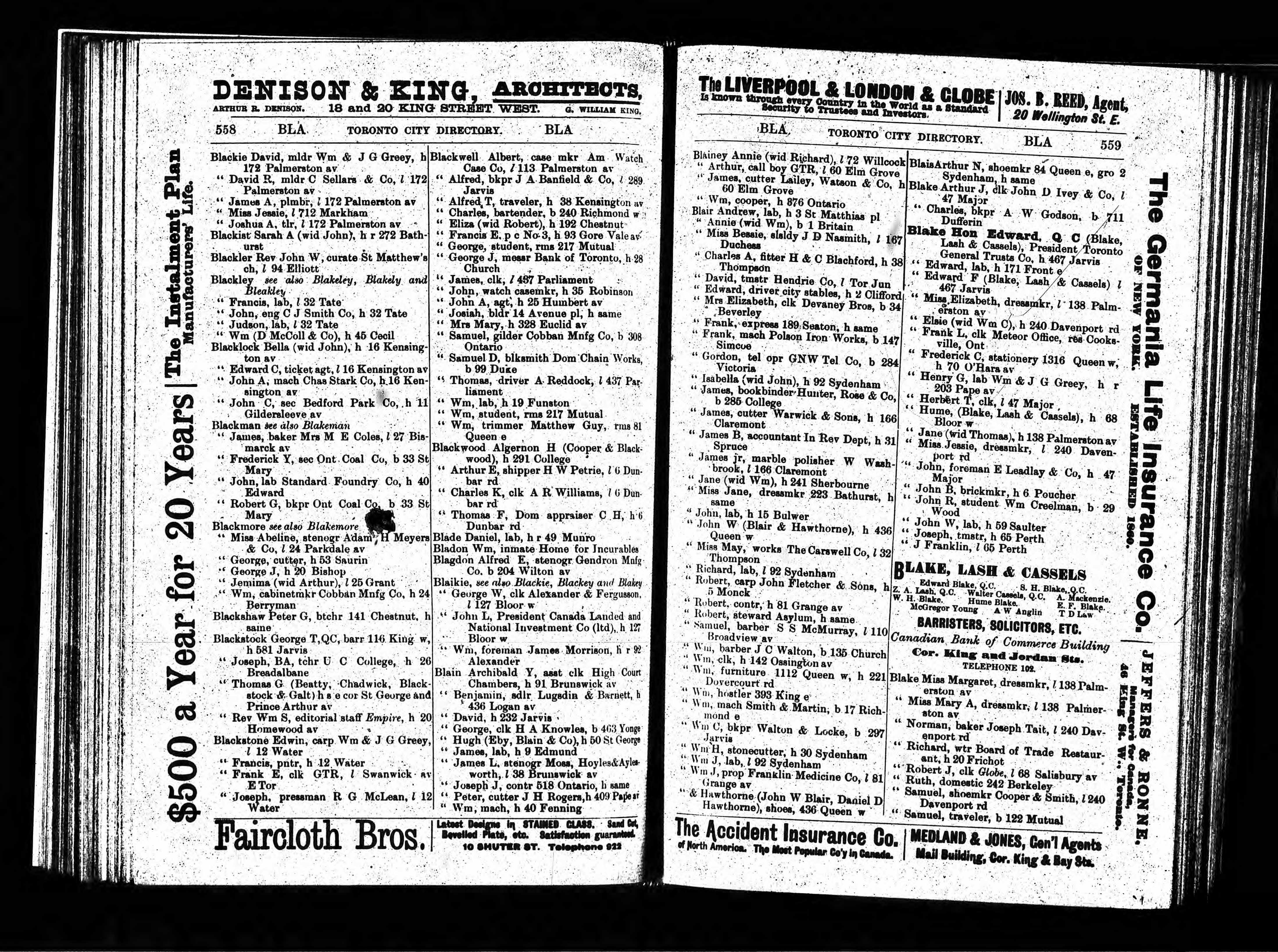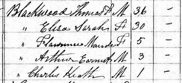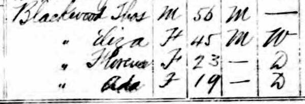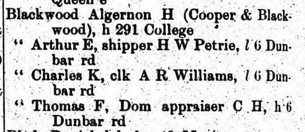Later life of Eliza Sarah BLACKWOODAfter Thomas died Eliza remained in Toronto with the children. In 1892 the family was living at 6 Dunbar Rd, where son Arthur was a shipper with HW Petrie and Charles was a clerk with AR WIlliams, but in 1895, just before Thomas died, both were "students" at the same address.