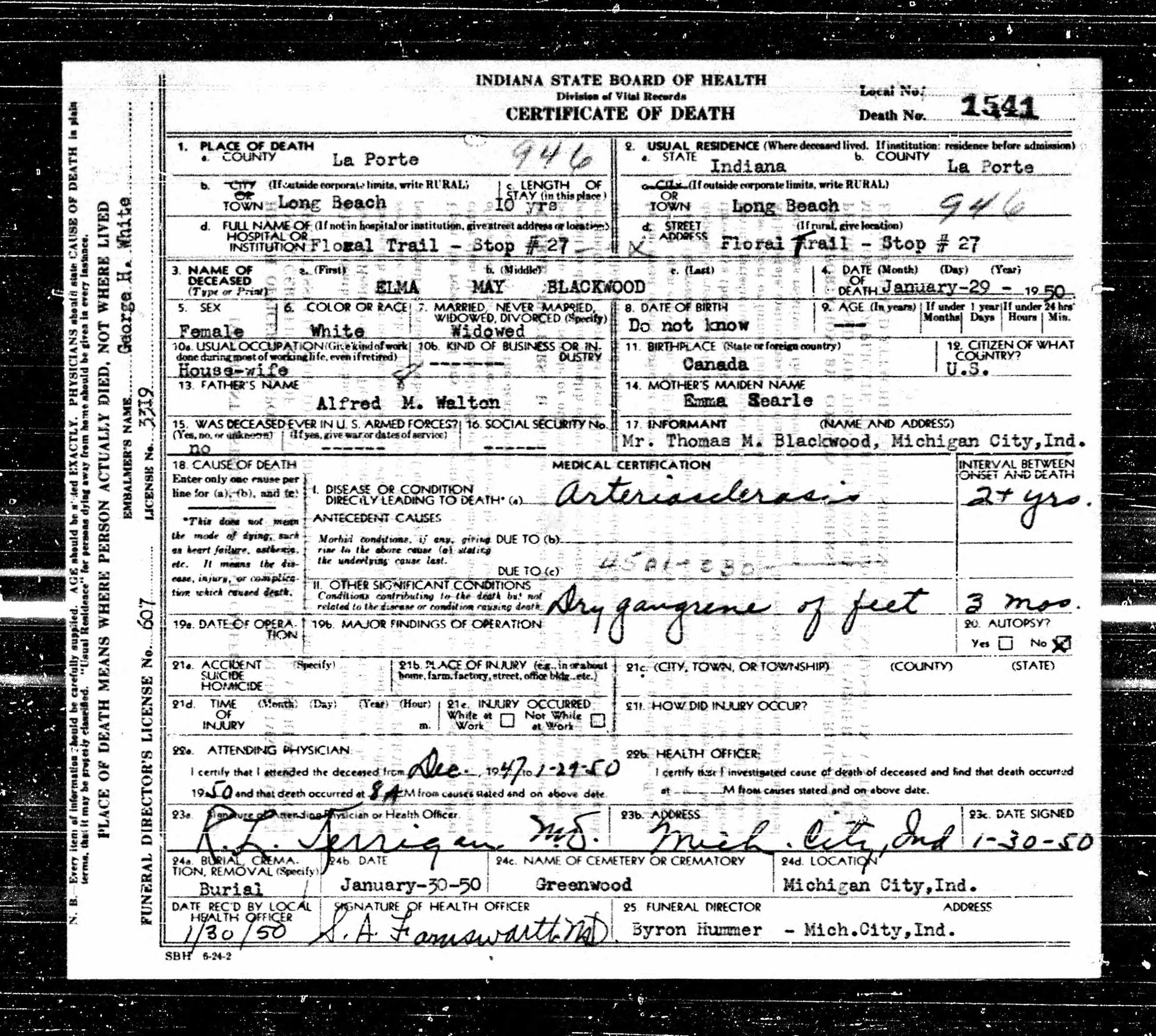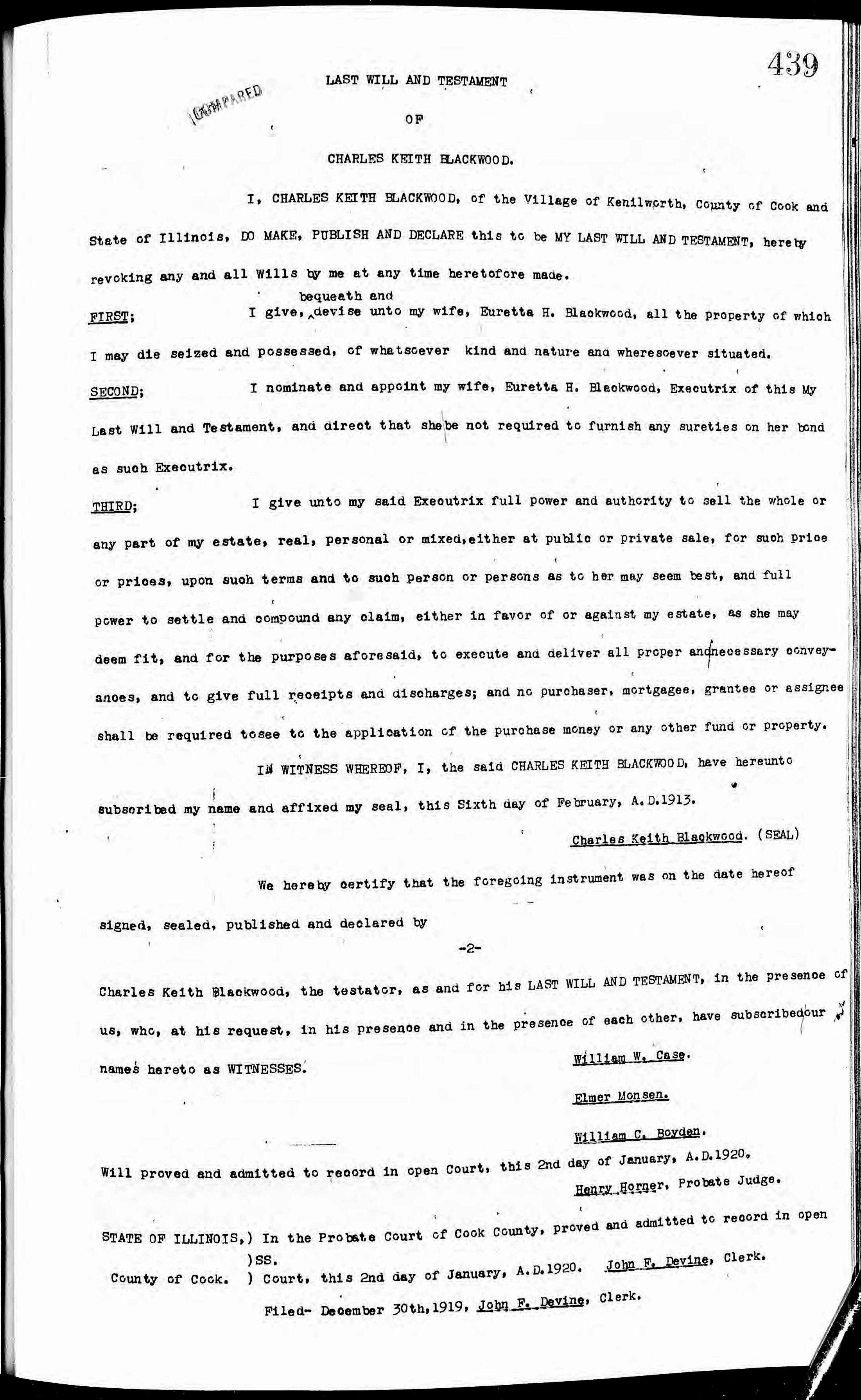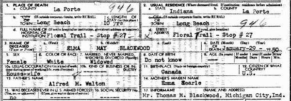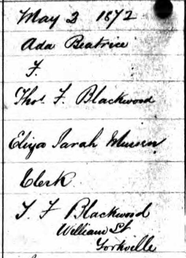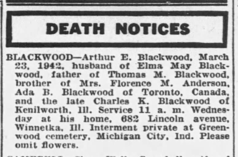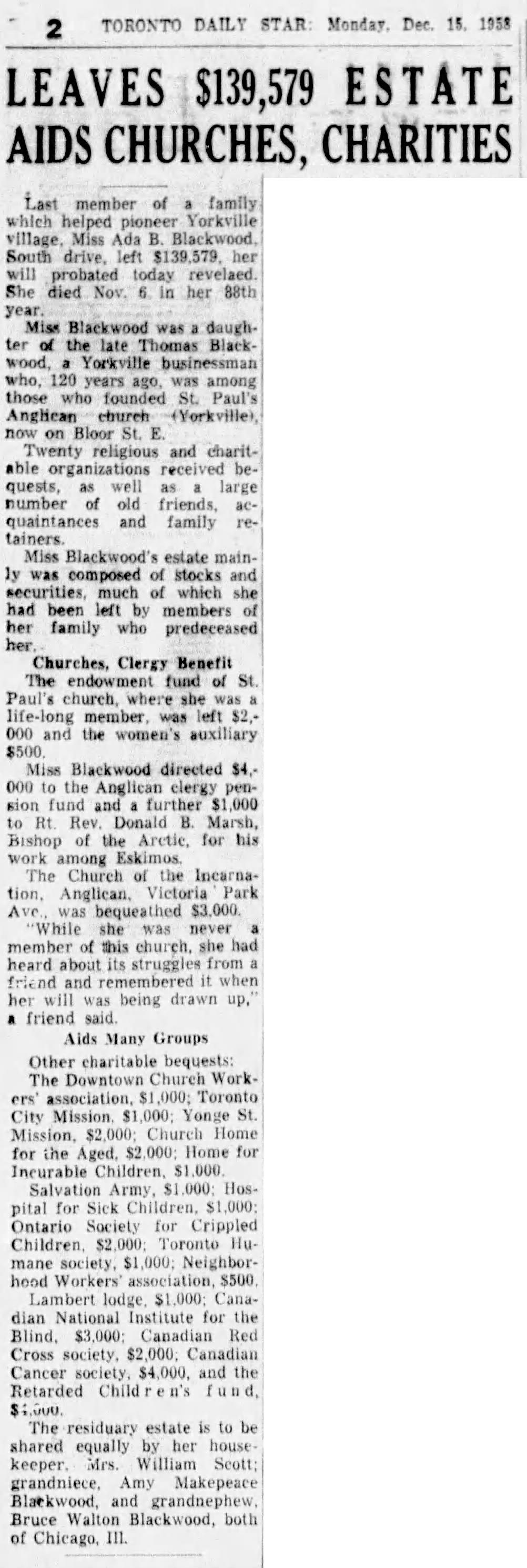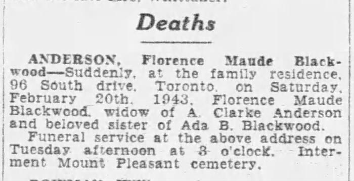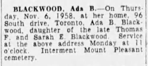 Death of Ada Beatrice BLACKWOODAda Beatrice died at 96 South Drive, Toronto on 6 November 1958. Her body was interred at the Mount Pleasant Cemetery, Toronto. She left a legacy of nearly $140,000, that went to various charities and to her grand-niece Amy Makepeace BLACKWOOD (later HALBERT) and gran-nephew Bruce Walton BLACKWOOD.