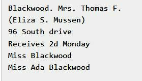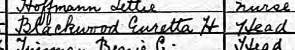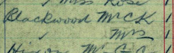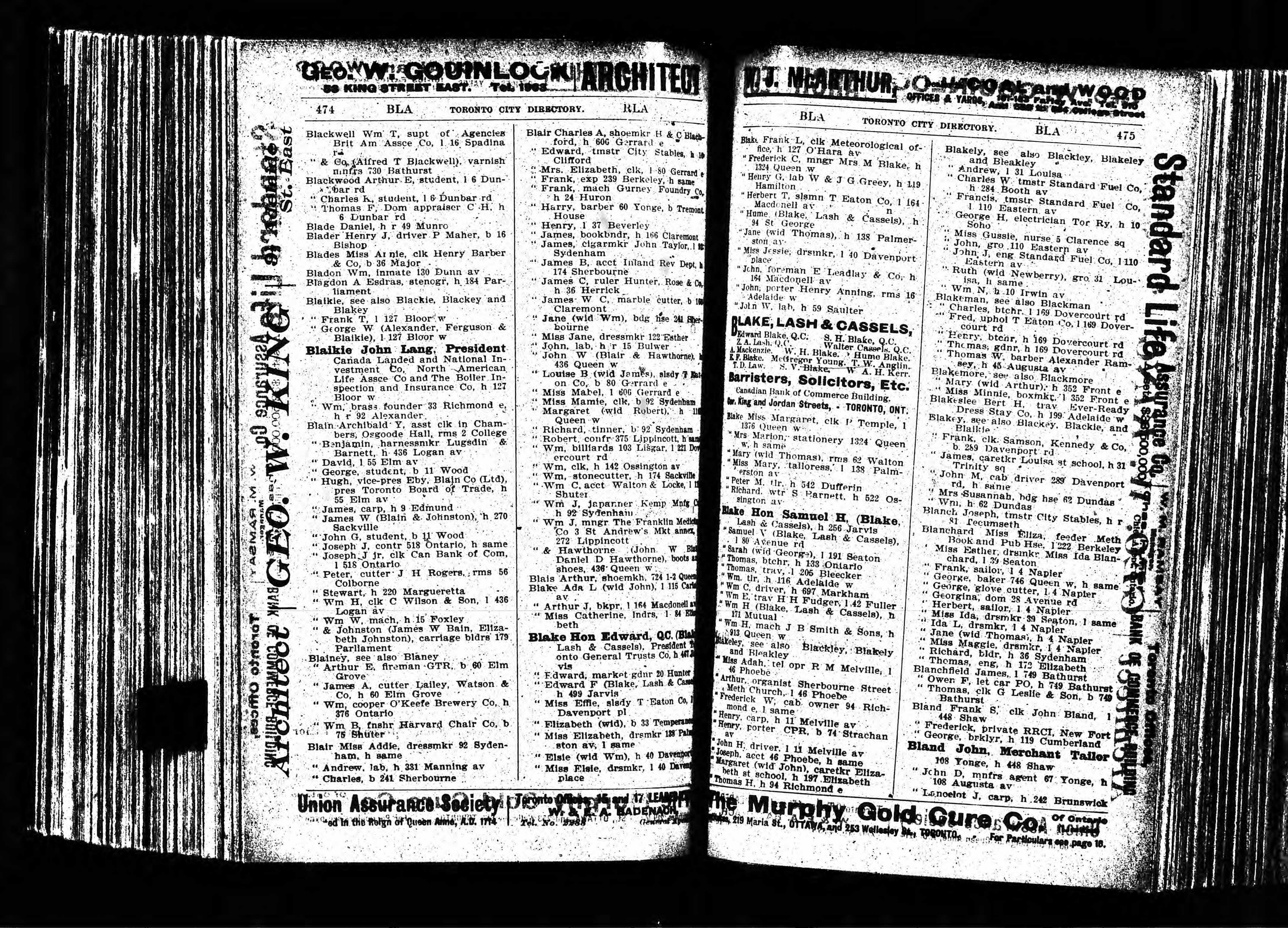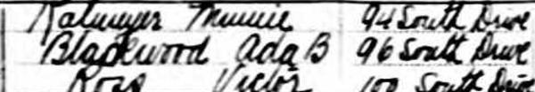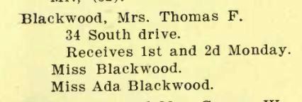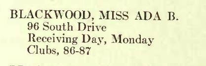 Ada Beatrice BLACKWOODAda was born at William St, Yorkville in Toronto on 2 May 1872. She is recorded in the 1891, 1901 and 1911 Canadian censuses with her parents. In 1911 they wre living at 96 South Drive, Toronto. She is alone in the 1921 census at 96 South Dr and is shown as the owner. Ada lived here nearly all of her life. She appears to have inherited the house from her mother when she died in 1915. Ada, as with her mother, was a member of the Torontonian Society, a grouping of the older families in Toronto. She is recorded in their "Blue Book":