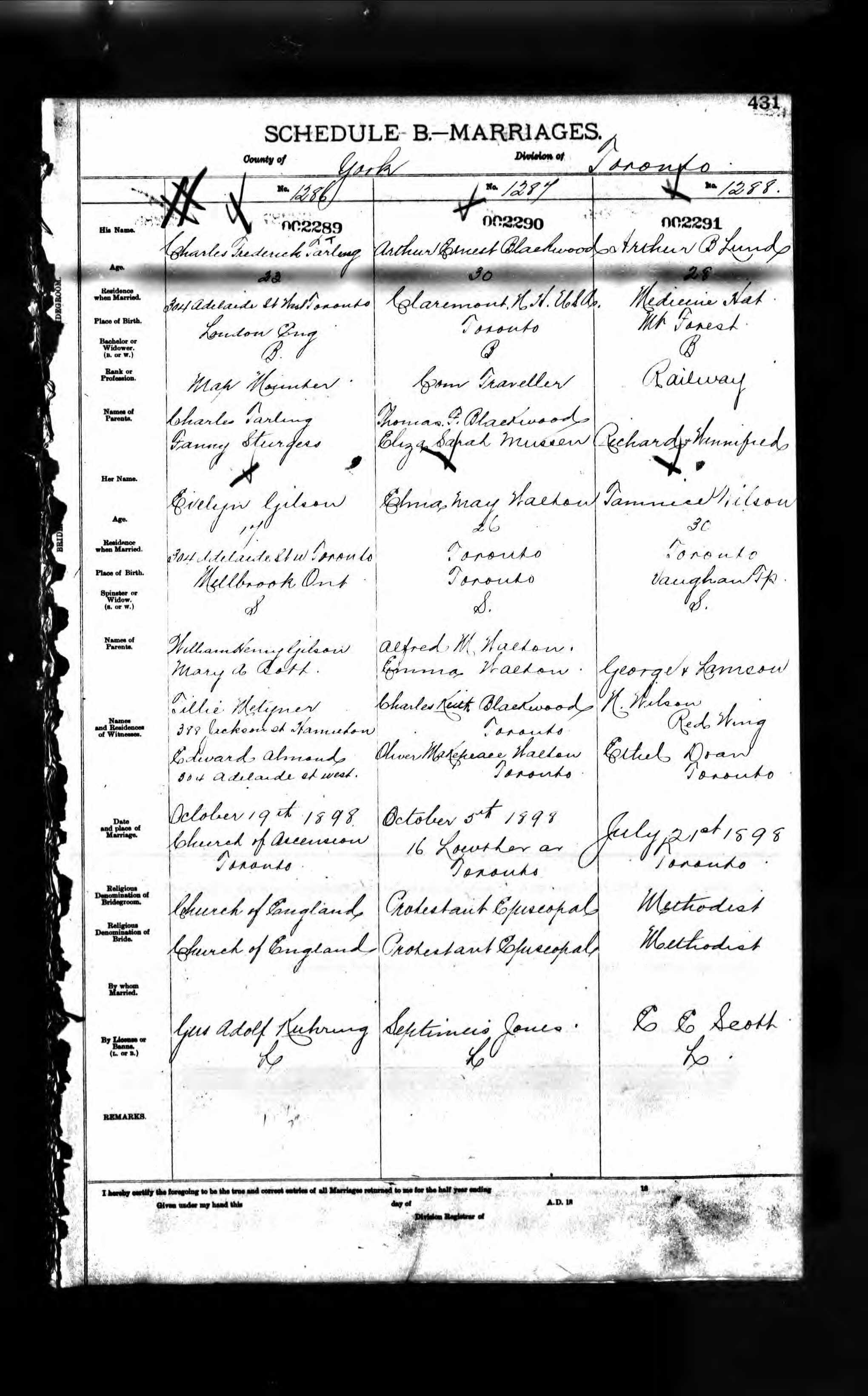 In the 1895 Toronto City Directory, Arthur, Charles and their father Thomas were living at 6 Dunbar Rd. Arthur married Elma May WALTON in Toronto on 5 October 1898.