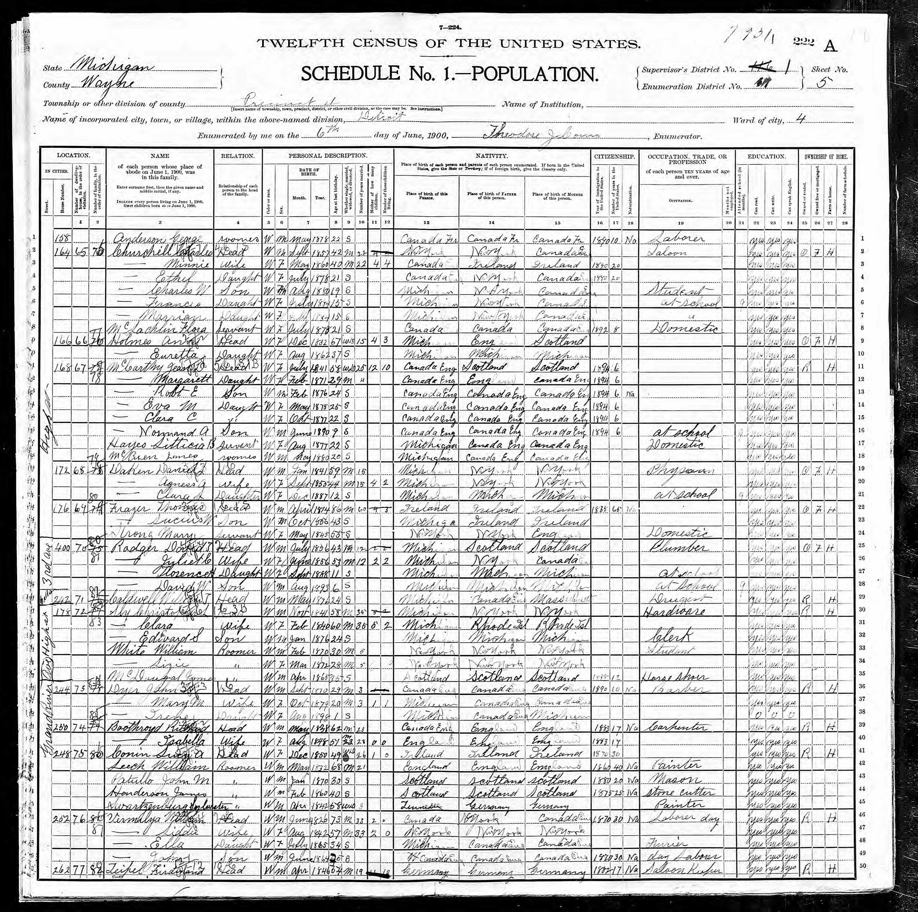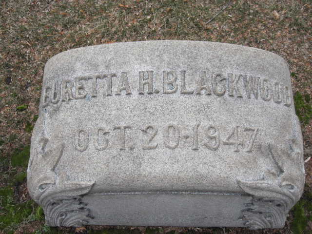 After Charles died Euretta contined to live in Detroit. At some stage around 1923 she moved to Pasadena in California. She is listed in the City Directory for 1923 through to 1939 living at 196 Bellefontaine St, Pasadena. She also travelled extensively, with shipping records for various overseas trips. In the 1930 census her details are overwritten with "travelling in Europe". Euretta Blackwood died in Pasadena, California on 20 October 1947. It is not clear from the records where she was buried, but there is a memorial to her in the family plot at Elmwood Cemetery, Detroit.