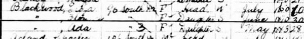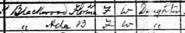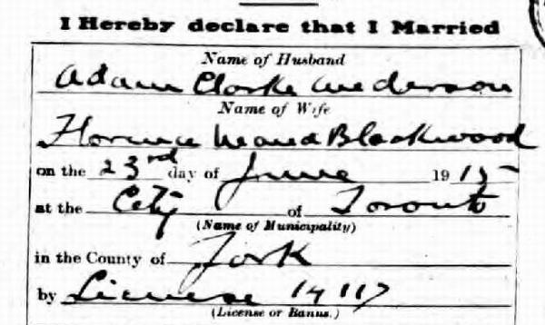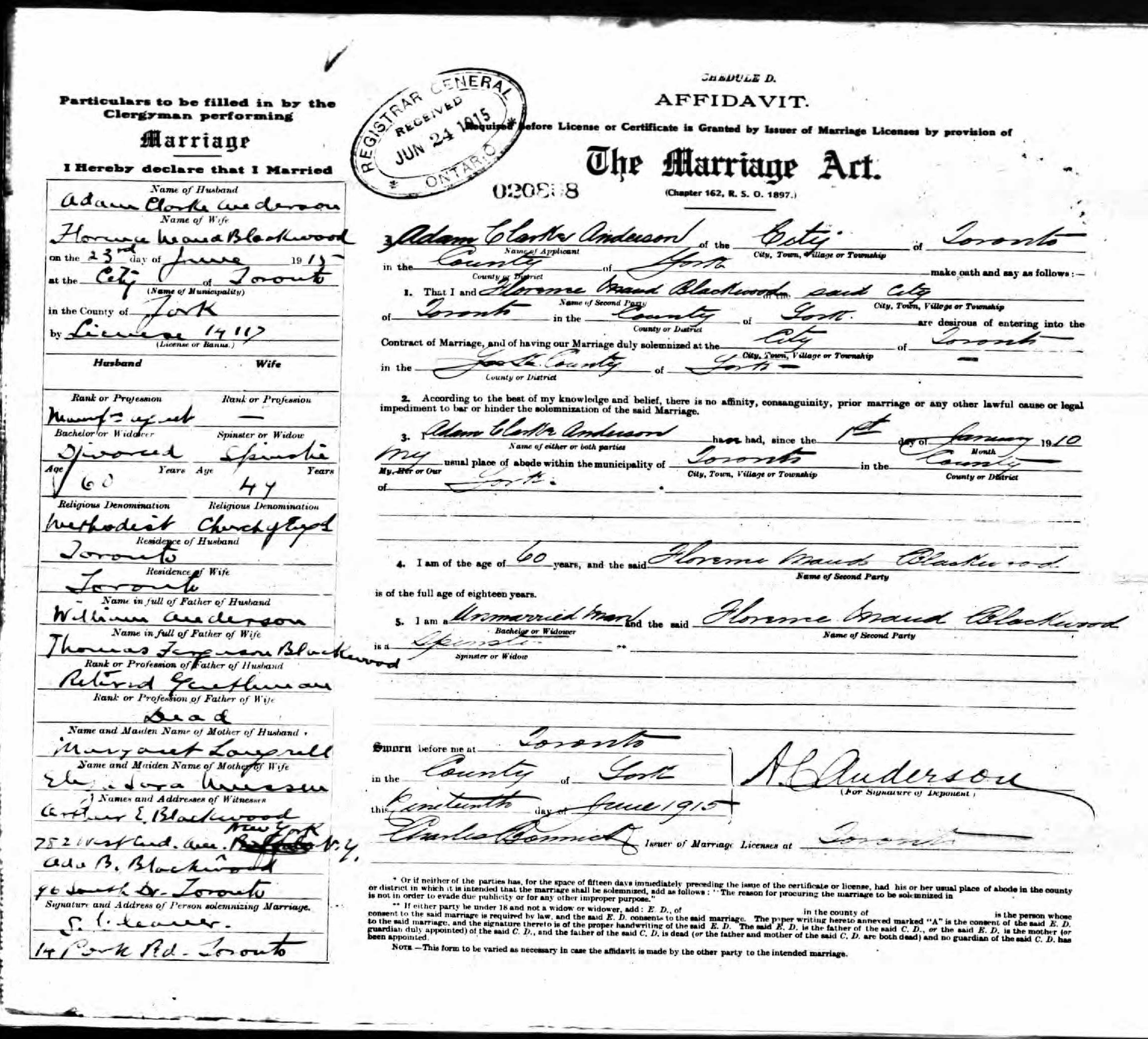 The Children of Thomas BLACKWOOD and Eliza Sarah MUSSENFlorence Maude BLACKWOOD (1867-1943)Florence Maude was born 23 June 1867 according to the census returns, although the 1901 census gives the year as 1872, which is wrong. She was living with her parents at the time of the 1881, 1891, 1901 and 1911. Florence eventually married Adam Clarke ANDERSON in Toronto on 23 June 1915. This was her 48th birthday and about 6 weeks before her mother died. Adam was aged 60 and divorced. The couple did not have any children.