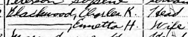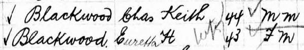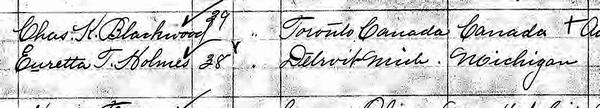 Charles Keith BLACKWOODCharles Keith was born 27 March 1870 in Toronto, the third child of Thomas and Eliza. Charles became an accountant and joined the Sullivan Machinery Company with his father. He married Euretta T HOLMES in Detroit on 12 June 1901. HIs age was given as 39 and hers as 38. There is some discrepencies in her year of birth. The records range from 1859 to 1864, with the 1870 and 1880 census giving her age as 10 and 20 respectively, consistent with another record giving her date of birth as 8 August 1859.