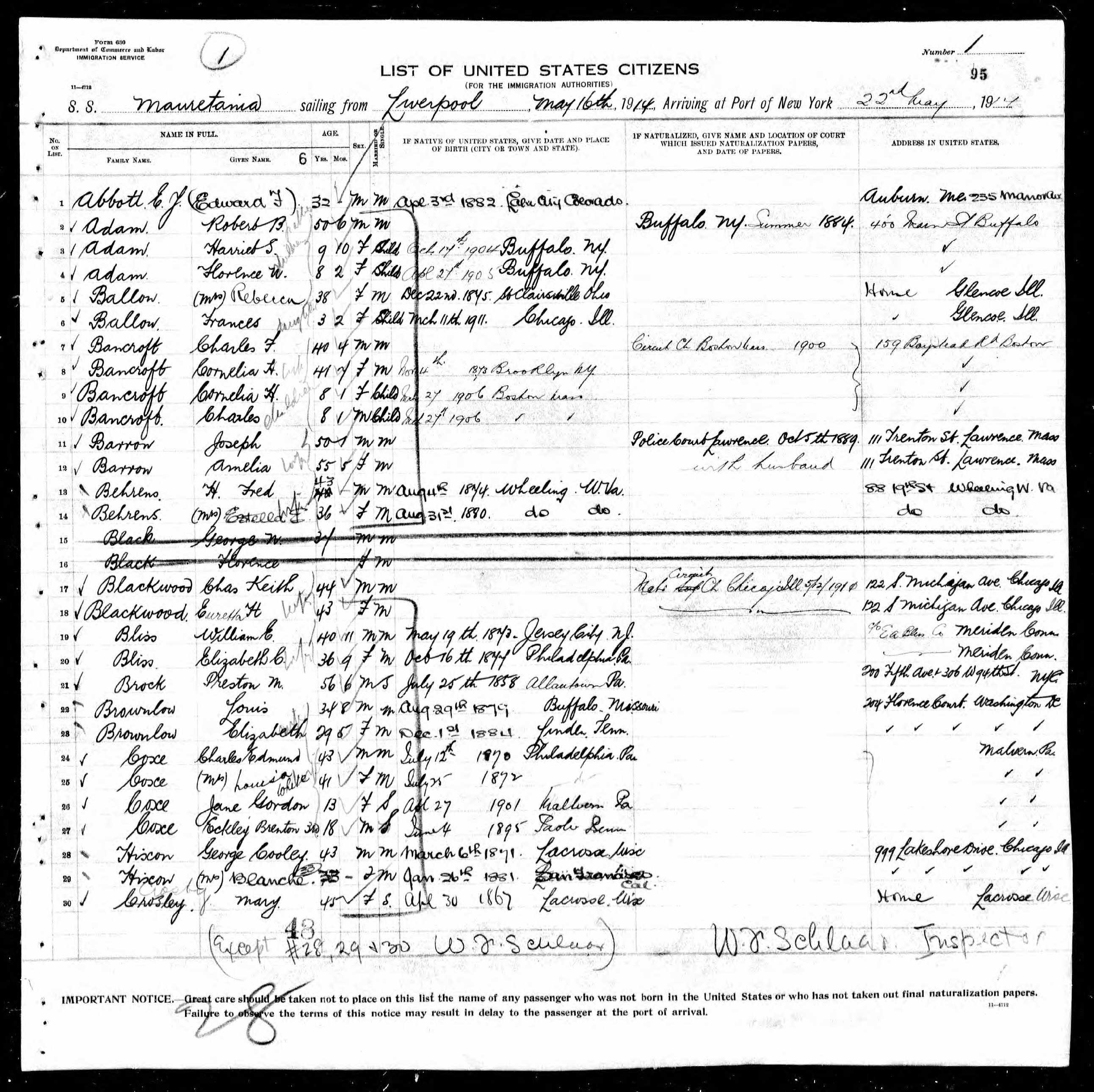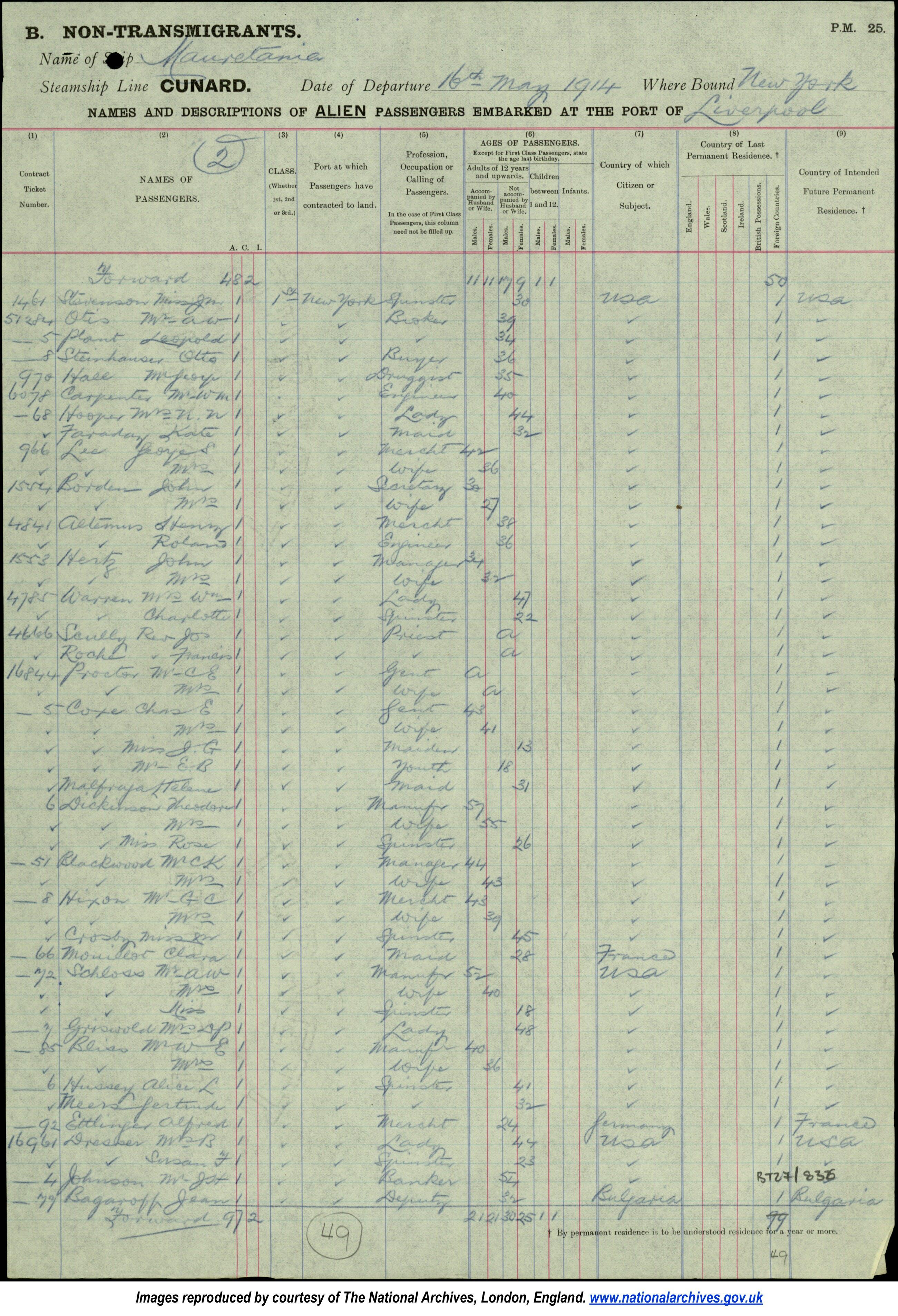 It would appear that Charles and Euretta did not have any children. He became a naturalised US citizen in 1902. He applied for a US passport in 1904 and again in 1917. Charles and Euretta travelled to Britain in 1914. They returned from Liverpool to New York on the Mauretania, departing 16 May and arriving on 22 May. Note that war was declared on 4 August 1914.