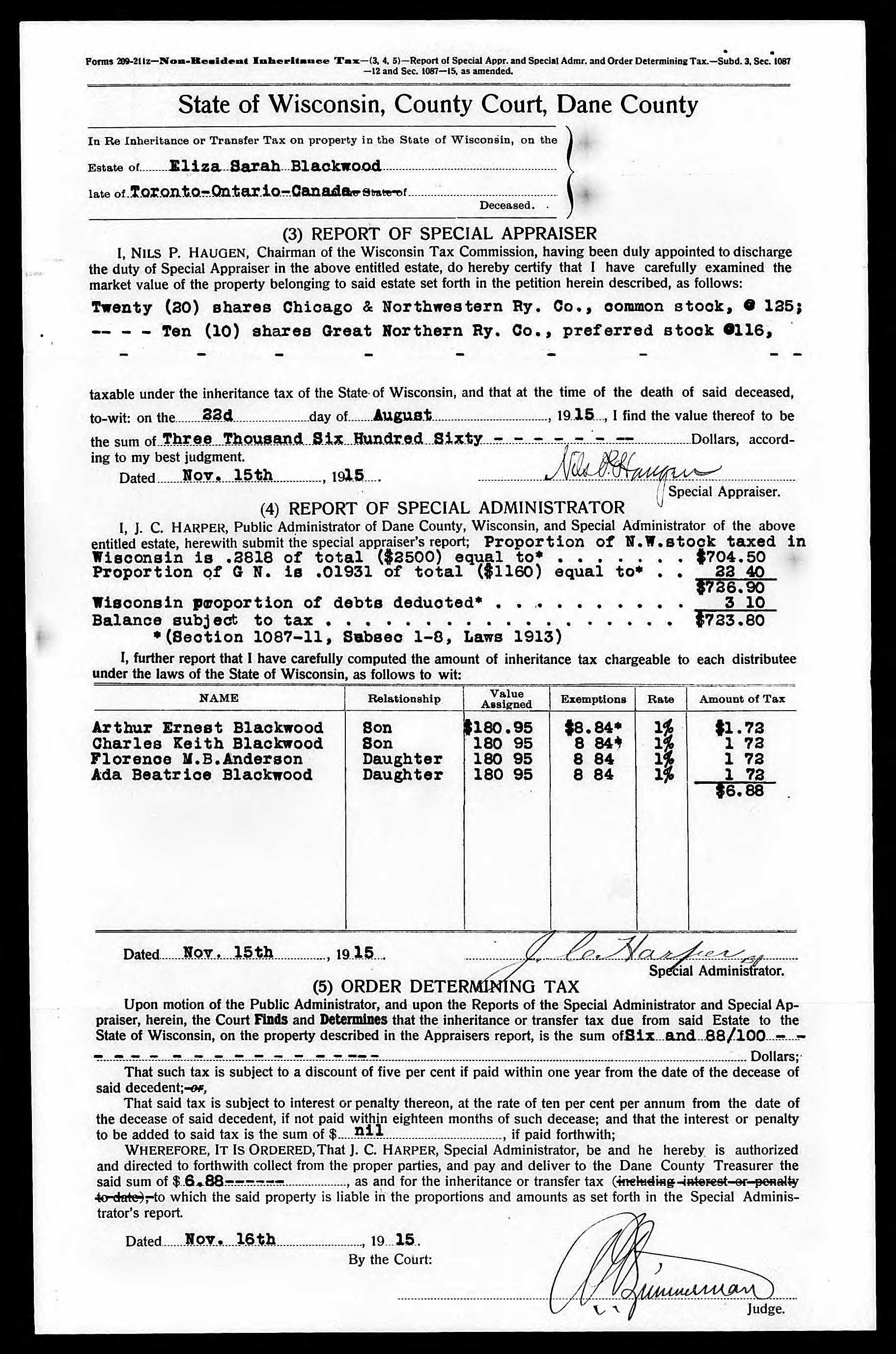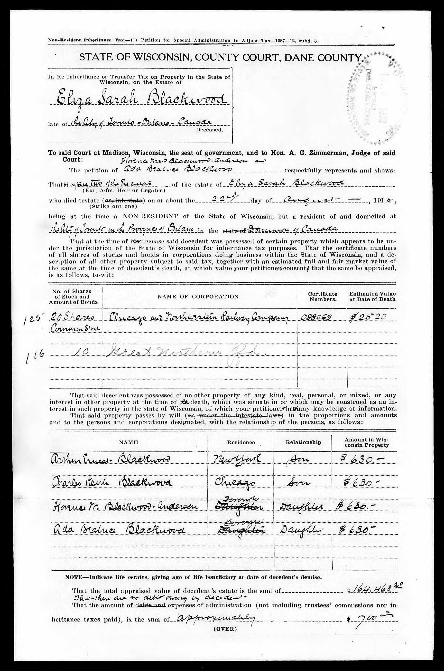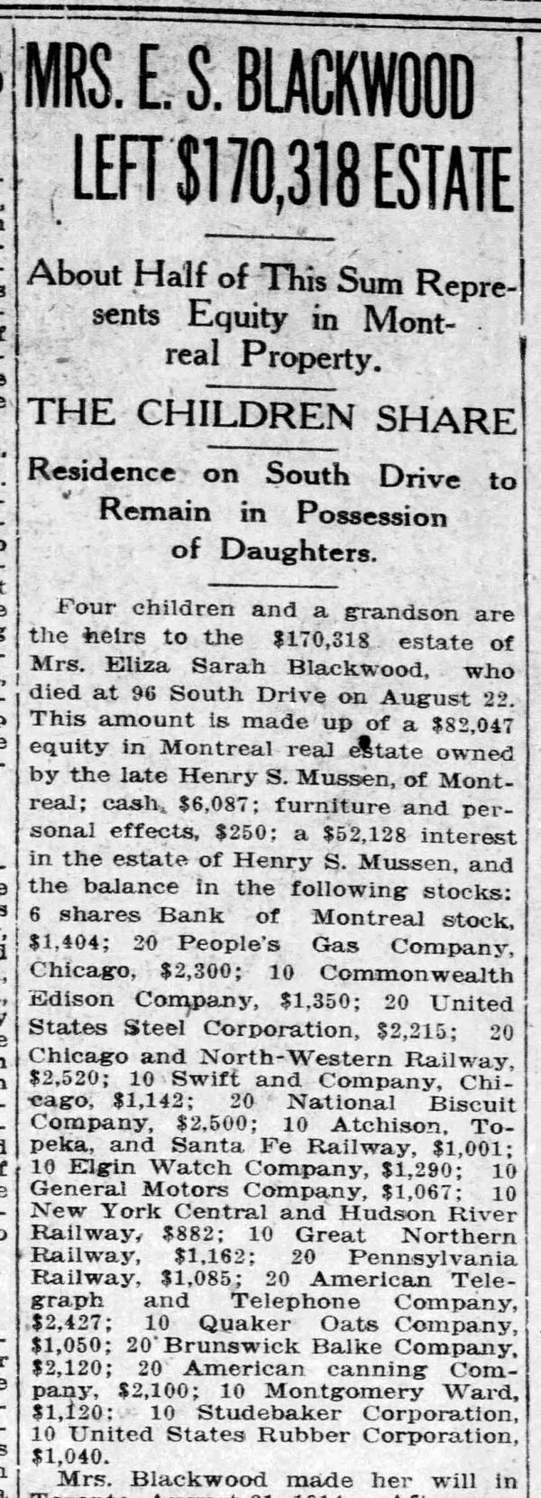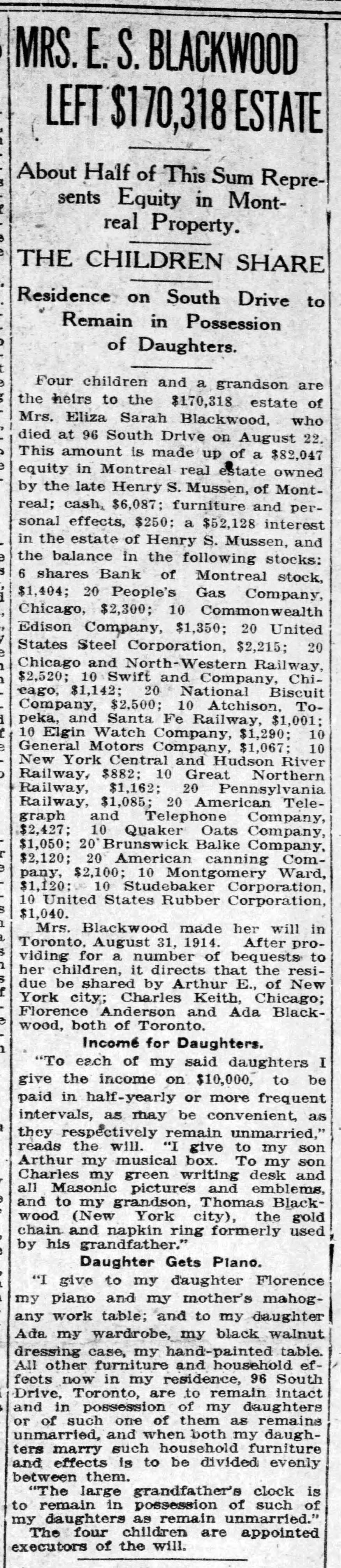 By the time of the 1901 census Arthur and Thomas had left home. Eliza Sarah died on 22 August 1915 at her family home of 96 South Drive, Toronto. She may have been buried in the Mt Pleasant Cemetery, Toronto, but her death is recorded on the MUSSEN family tomb in the Cimitiere Mont-Royal in Montreal. Her Will was proved in Toronto. It proved to be of considerable interest to the local paper, no doubr because Eliza BLACKWOOD and her daughters were well known in Toronto society. Eliza was survived by her four children: Florence Maude (who had married Adam Anderson about 6 weeks prior), Arthur Ernest (now resident in New York), Charles Keith (living in Chicago) and Ada Beatrice (living in Toronto). Settling her Will would have presented difficulties if the paperwork created by her ownership of 20 shares in the Chicago and 10 shares in the Great Northern railroads was a guide. Her estate was estimated at $164,463.20. The four children were assessed for Inheritance tax in Wisconsin and had to pay $6.88 each but this was discounted by 5% to $6.54 after the examination of Special Administrator J.C. Harper.