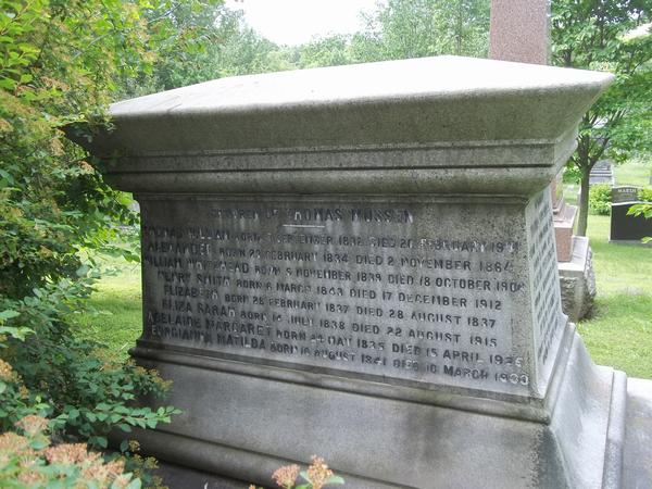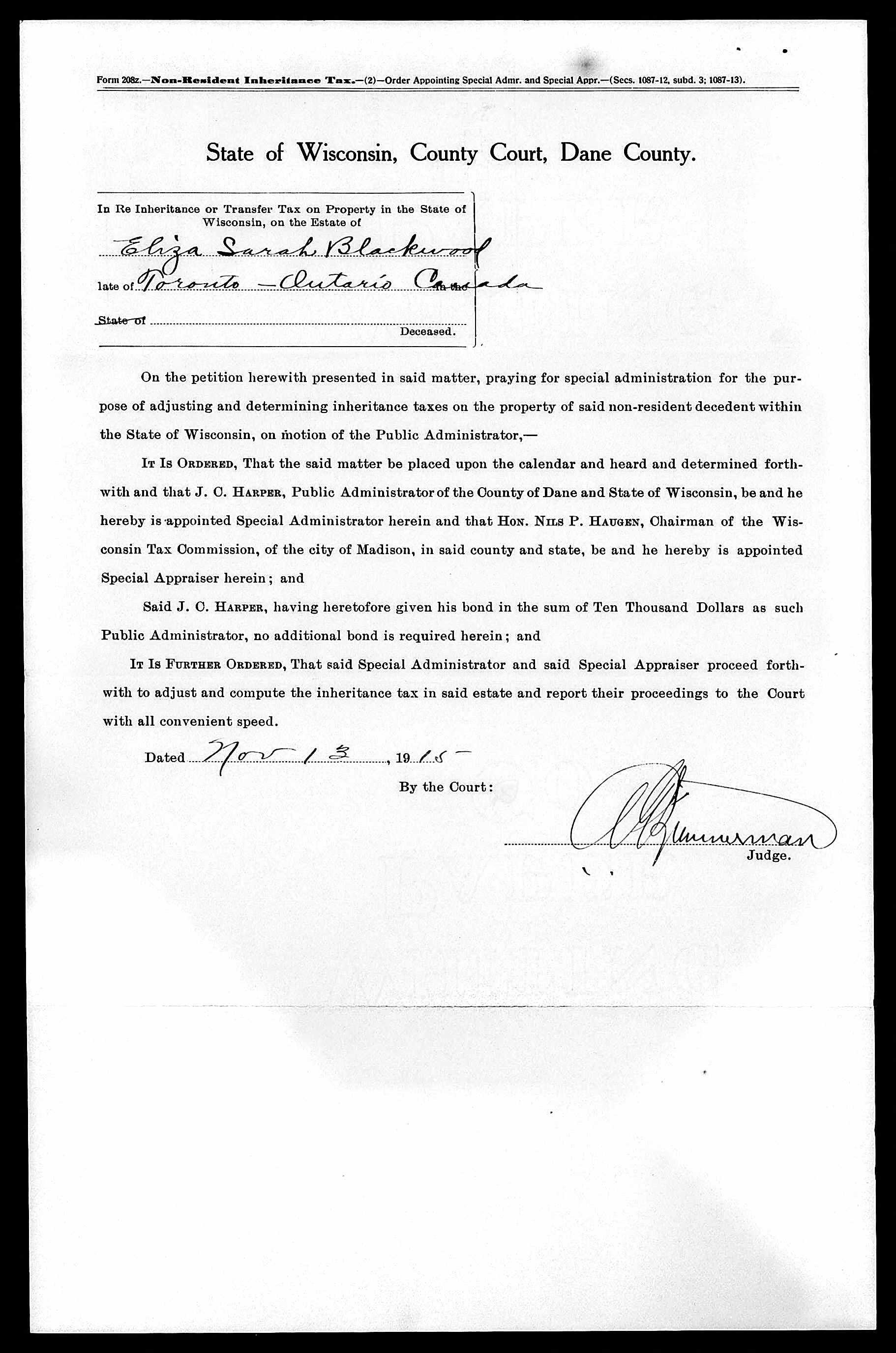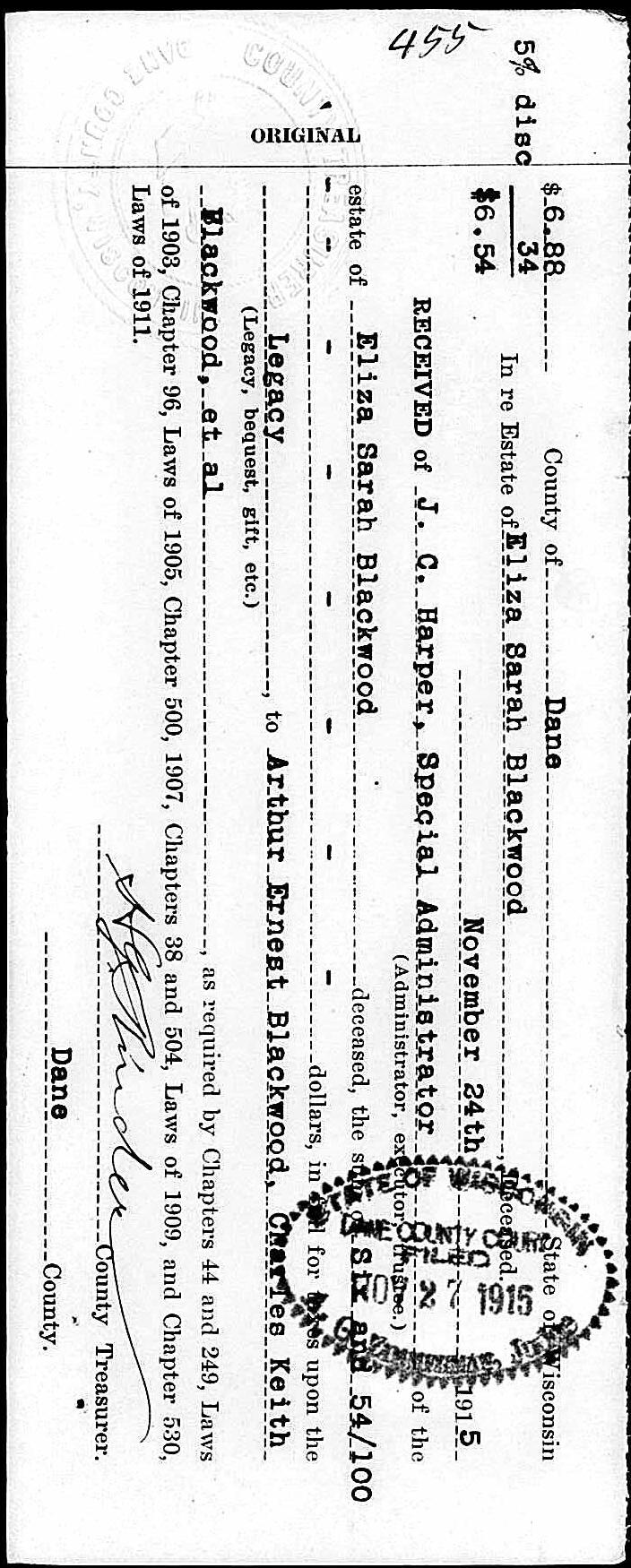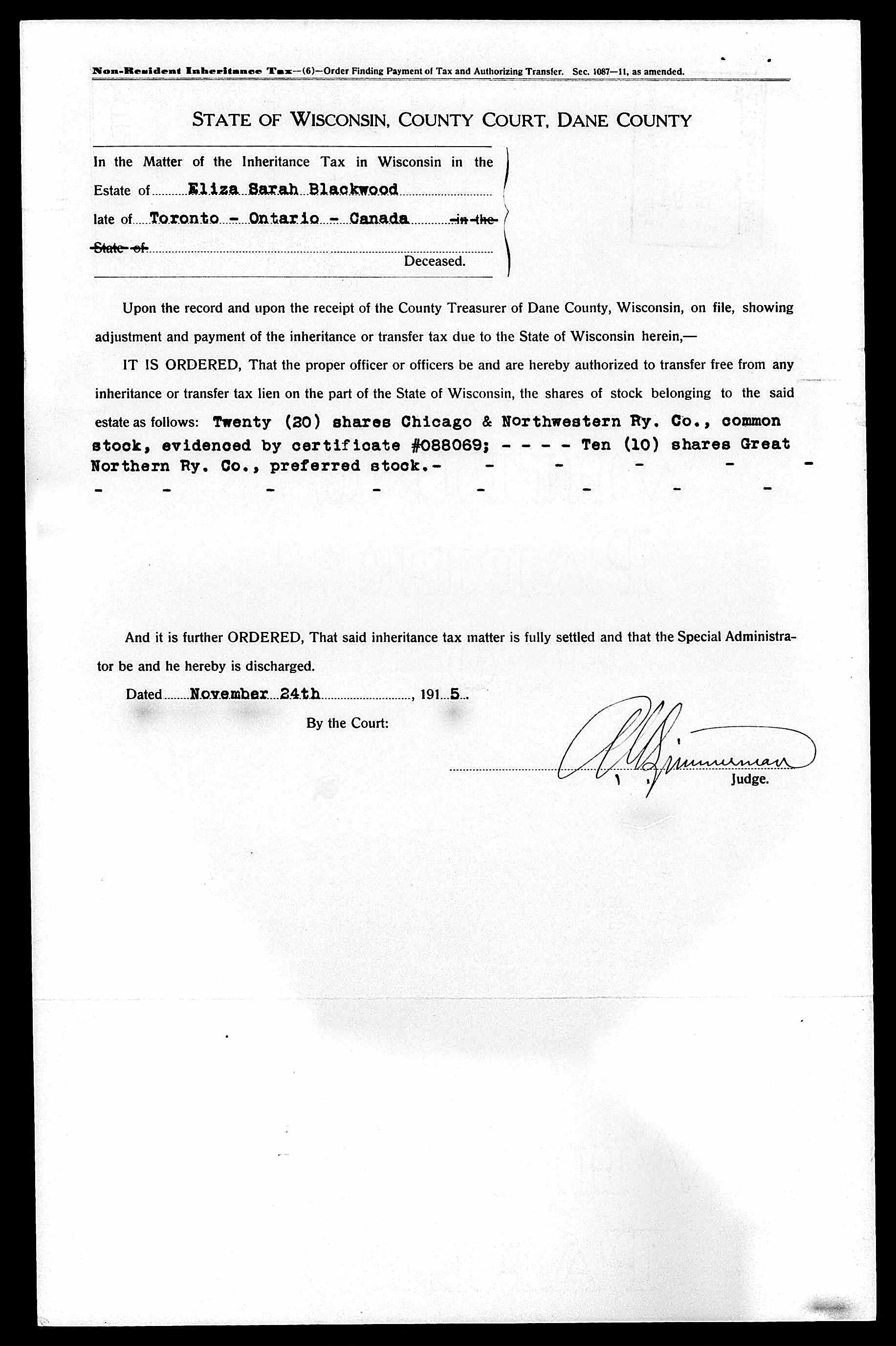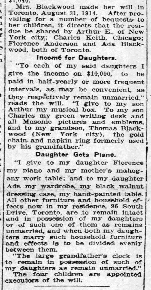 By the time of the 1901 census Arthur and Thomas had left home. Eliza Sarah died on 22 August 1915 at her family home of 96 South Drive, Toronto. She may have been buried in the Mt Pleasant Cemetery, Toronto, but her death is recorded on the MUSSEN family tomb in the Cimitiere Mont-Royal in Montreal. Her Will was proved in Toronto. It proved to be of considerable interest to the local paper, no doubr because Eliza BLACKWOOD and her daughters were well known in Toronto society. Eliza was survived by her four children: Florence Maude (who had married Adam Anderson about 6 weeks prior), Arthur Ernest (now resident in New York), Charles Keith (living in Chicago) and Ada Beatrice (living in Toronto). Settling her Will would have presented difficulties if the paperwork created by her ownership of 20 shares in the Chicago and 10 shares in the Great Northern railroads was a guide. Her estate was estimated at $164,463.20. The four children were assessed for Inheritance tax in Wisconsin and had to pay $6.88 each but this was discounted by 5% to $6.54 after the examination of Special Administrator J.C. Harper.