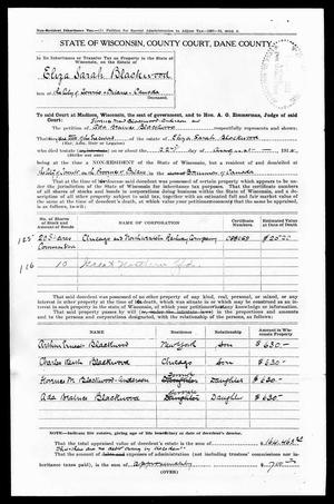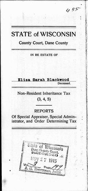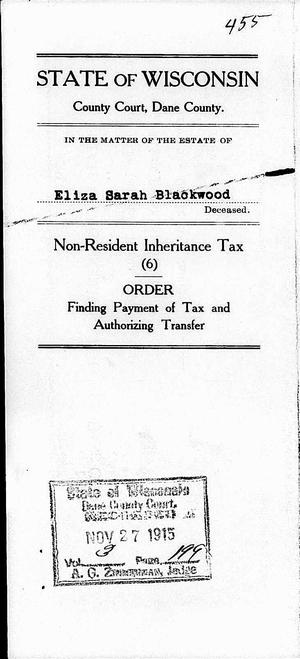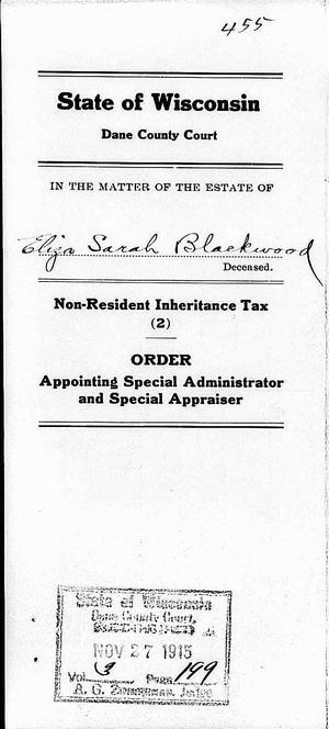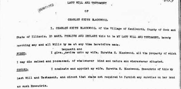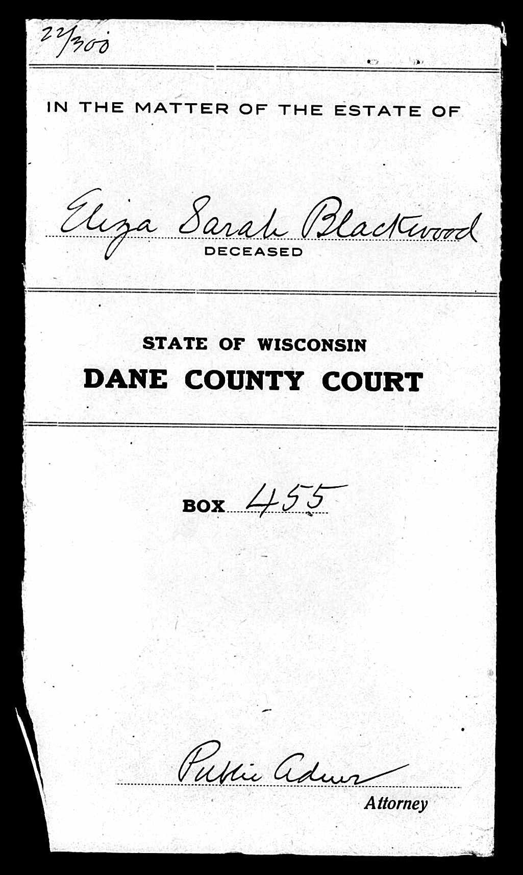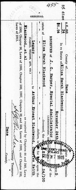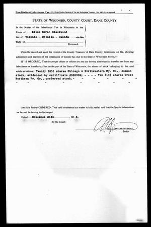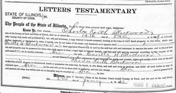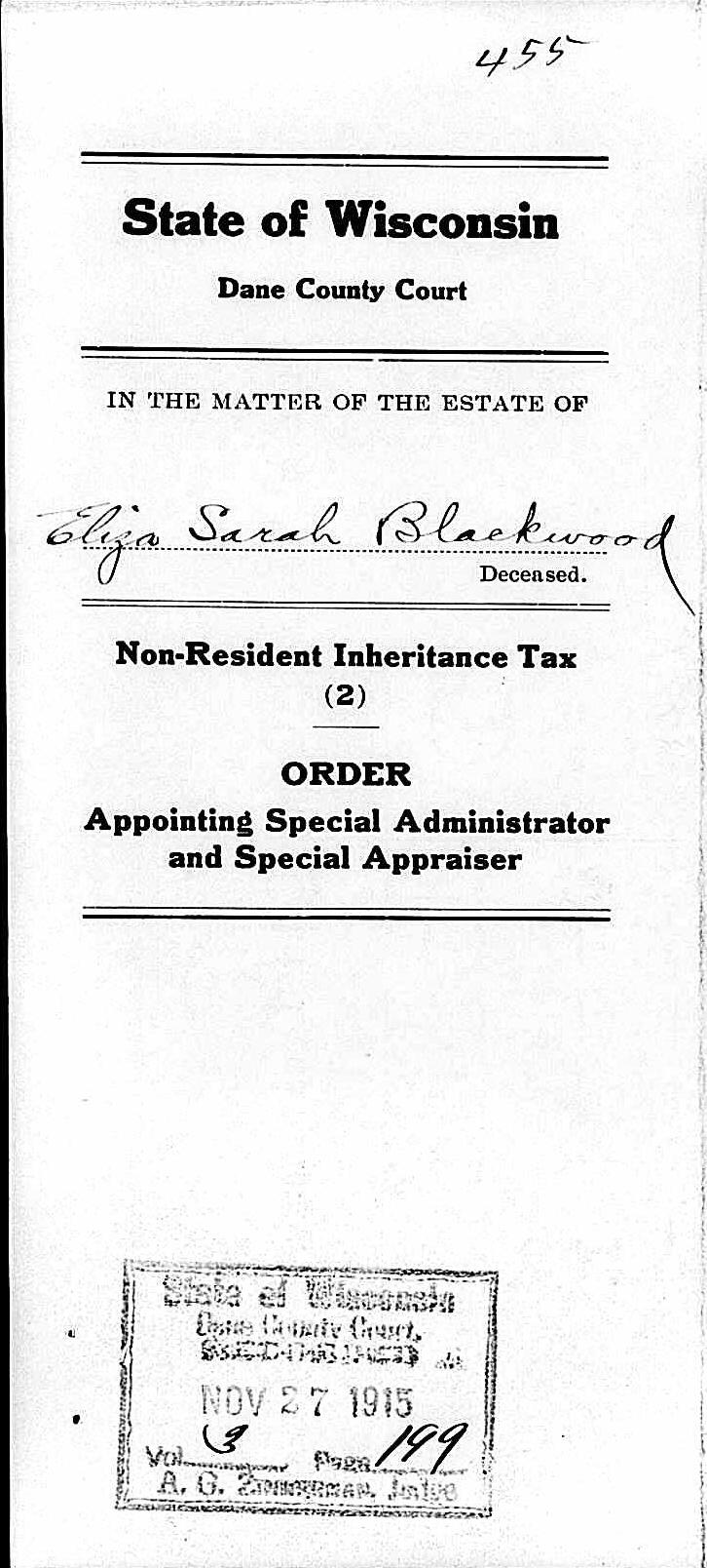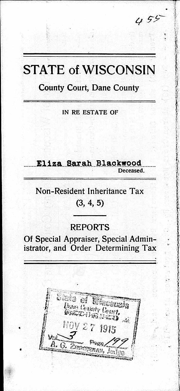 By the time of the 1901 census Arthur and Thomas had left home. Eliza Sarah died on 22 August 1915 at her family home of 96 South Drive, Toronto. She may have been buried in the Mt Pleasant Cemetery, Toronto, but her death is recorded on the MUSSEN family tomb in the Cimitiere Mont-Royal in Montreal. Her Will was proved in Toronto. It proved to be of considerable interest to the local paper, no doubr because Eliza BLACKWOOD and her daughters were well known in Toronto society. Eliza was survived by her four children: Florence Maude (who had married Adam Anderson about 6 weeks prior), Arthur Ernest (now resident in New York), Charles Keith (living in Chicago) and Ada Beatrice (living in Toronto). Settling her Will would have presented difficulties if the paperwork created by her ownership of 20 shares in the Chicago and 10 shares in the Great Northern railroads was a guide. Her estate was estimated at $164,463.20. The four children were assessed for Inheritance tax in Wisconsin and had to pay $6.88 each but this was discounted by 5% to $6.54 after the examination of Special Administrator J.C. Harper.