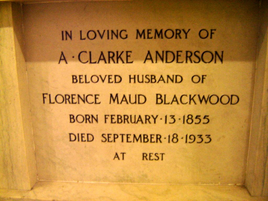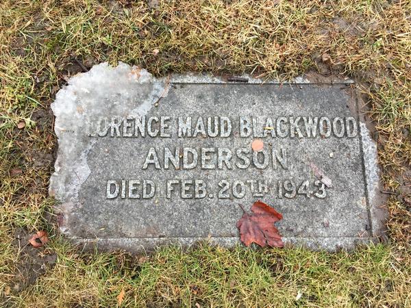 Adam was the son of William ANDERSON and Margaret (LANGRALL). He was born 13 February 1853 and baptised 28 April 1863 in the Wesleyan Baptist Chapel, Toronto. Adam died in Toronto on 18 September 1933, aged 78. He was buried in the Mt Pleasant Cemetery in north Toronto in the family mausoluem Row 61 level D. After Adam died, Florence went to live with her sister Ada Beatrice in the family home at 96 South Drive. Florence died at 96 South Drive on 20 February 1943 and was also buried in the Mt Pleasant Cemetery, alongside other BLACKWOOD graves and near the grave of William McMASTER.