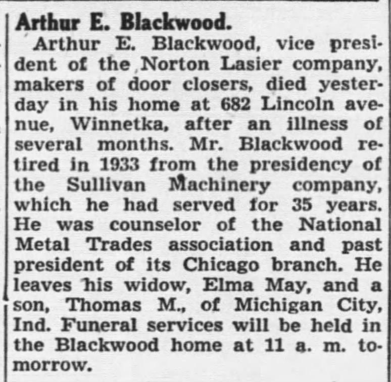 Shortly after marriage the couple moved to New York where their son Thomas Makepeace was born on 12 July 1899. The family are in the 1900 US census living in Tenafly Road, Englewood, New York. Young Thomas was 10 months old and the family employed a servant Margaret Rynn aged 19 and from Ireland. Shortly after the 1920 census Arthur and Elma moved to Evanston, Illinois. They are in the 1922 directory living at 682 Lincoln Ave, Winnetka, Illinois, which is where they lived for the rest of their lives. Arthur became a naturalized American citizen on 12 January 1926. In the 1935 directory, Arthur is listed as the Vice-President of Sullivan Machinery Co, and his son Thomas, also living at 682 Lincoln Ave, was the manager. In fact Arthur had been appointed the President (i.e. CEO) of the Sullivan Machinery Company in January 1929 upon the sudden death (on 10 November 1928 from peritonitis) of the president Frederick K. Copeland. Arthur died on 23 March 1942 and was buried 2 days later. He was buried at Greenwood Cemetery, Michigan City, Indiana rather