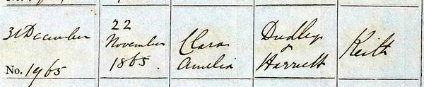 Clara Amelia was born 22 November 1865 and baptised on 31 December 1865 at St Paul, Cleveland St, Sydney.