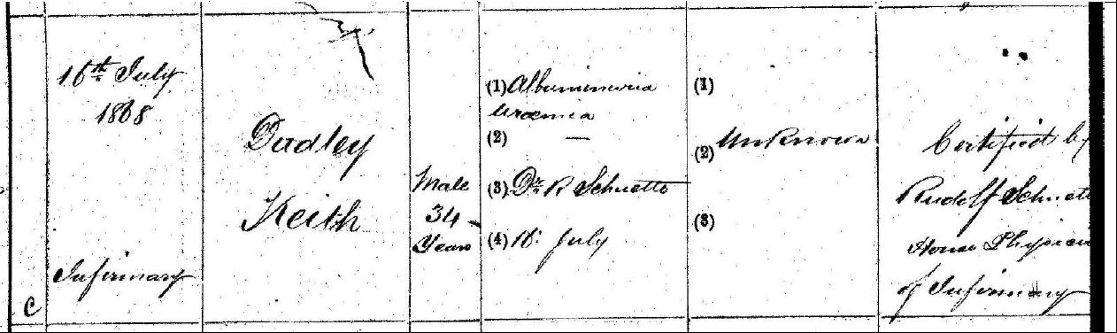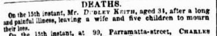 Dudley died in Sydney on 16 July 1868, as recorded in the Sydney Morning Herald. He too died of a long and painful