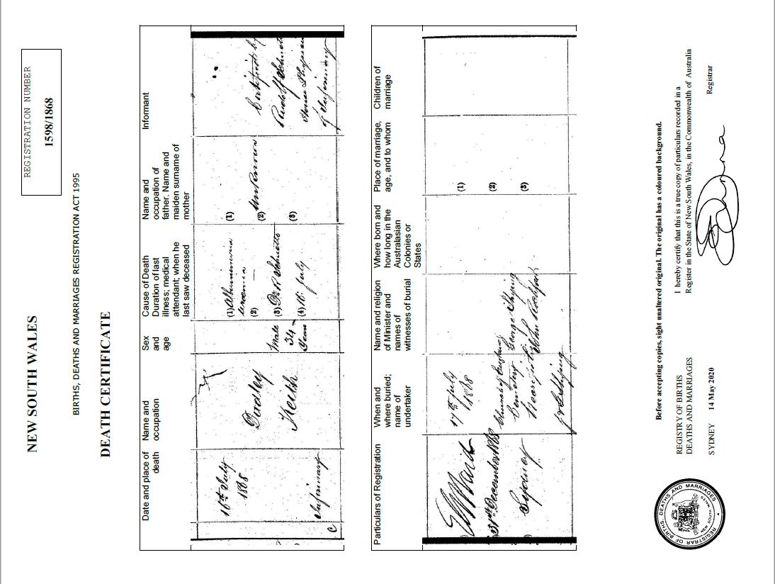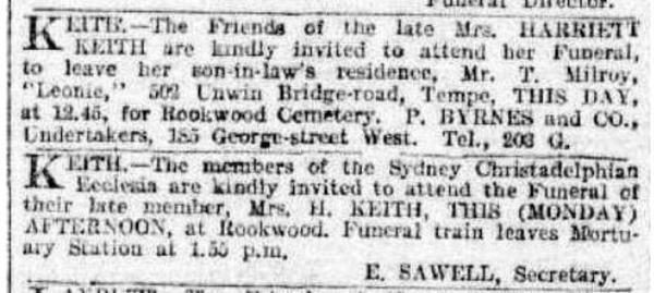 Harriett KEITH died 3 February 1912 at the home of her son-in-law, 502 Unwin Bridge Rd, Tempe, Sydney. Fortunately the