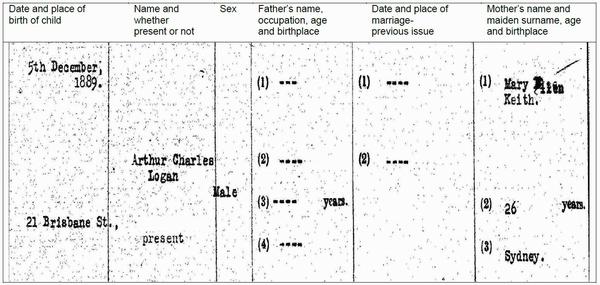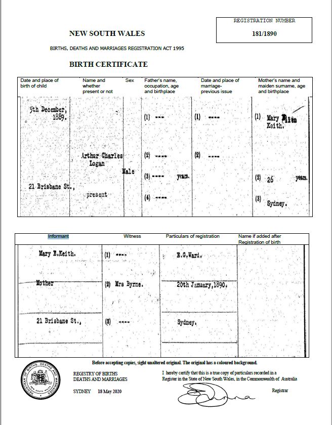 In 1889 Mary Ellen had a son, recorded in the NSW birth records as Arthur Charles Logan KEITH,