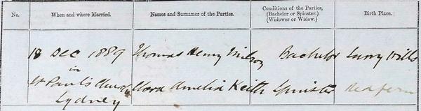 1889 marriage of Clara Amelia KEITH to Thomas MILROY. |
