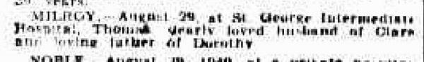Thomas Henry MILROY died at St George Intermediate Hospital in Sydney, late of 20 Beach St Kogarah, on 29 August 1940.