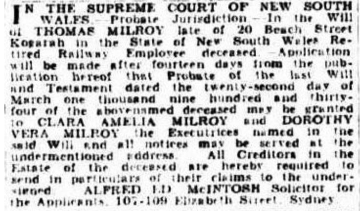 Probate notice in the SMH 3 October 1940 for Thomas MILROY. |