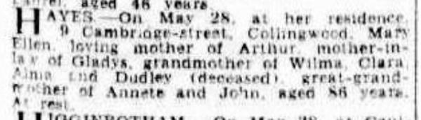 Death notice in The Age 29 May 1946 for Mary Ellen KEITH/HAYES. |