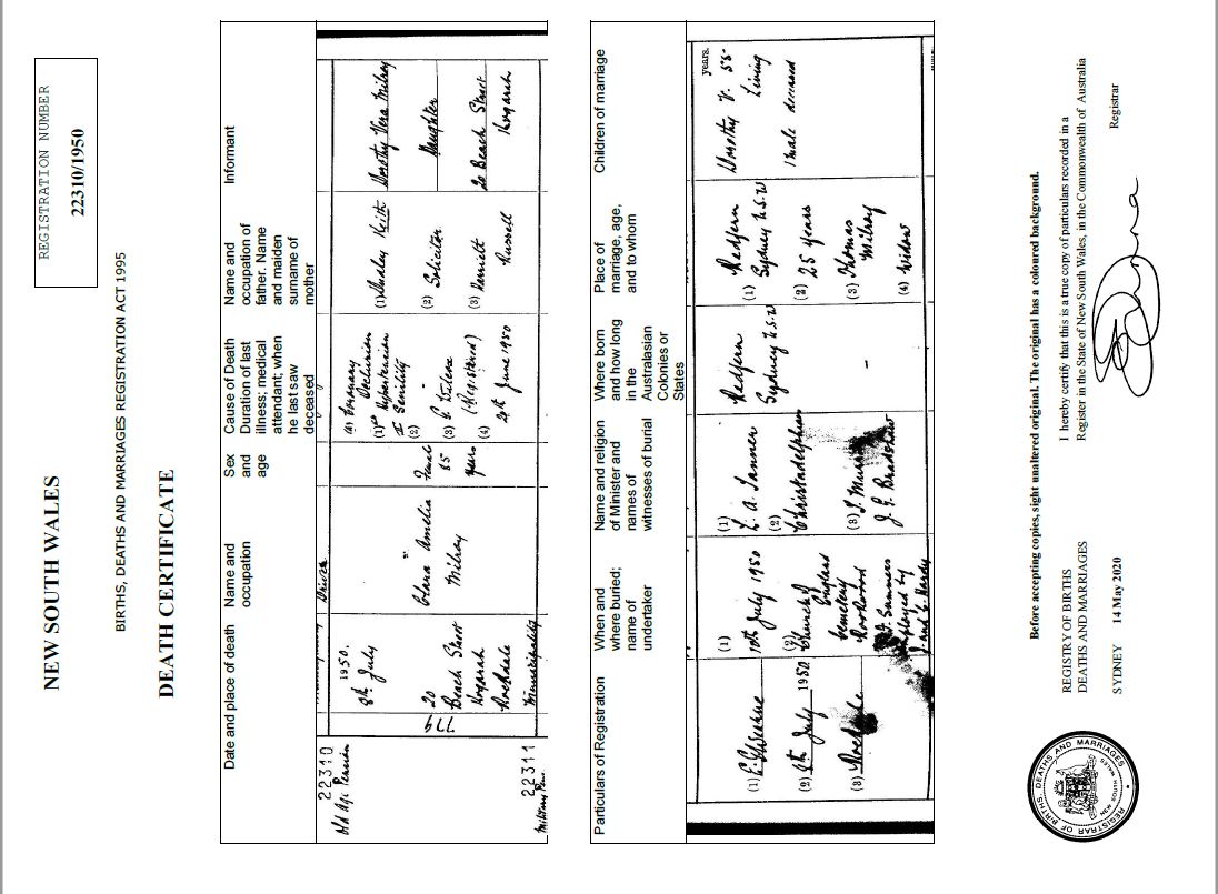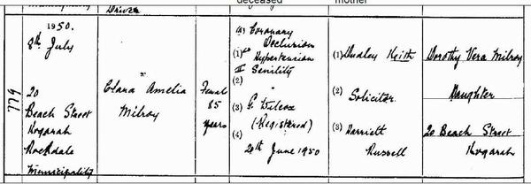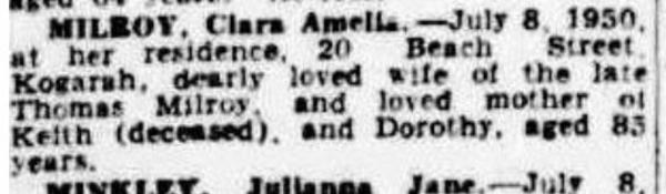Clara Amelia MILROY (née KEITH) died at 20 Beach St, Kogarah on 8 July 1950.