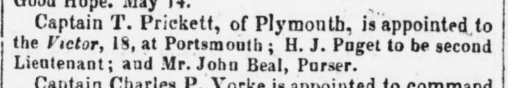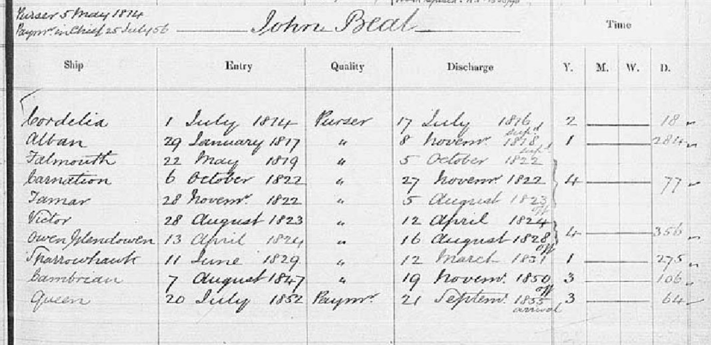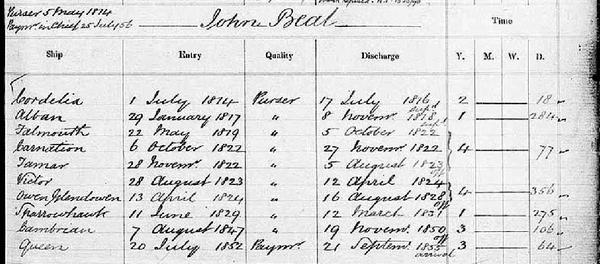 What became of John BEAL?John BEAL went back to sea on 7 August 1847, joining the HMS Cambrian as purser for a term of over 3 years. The ship was a fifth rate wooden sailing warship of 36 guns, built in 1841. It was under the command of Captain James PLUMRIDGE and sailed for the West Indies. He was back in Exeter by late 1851.