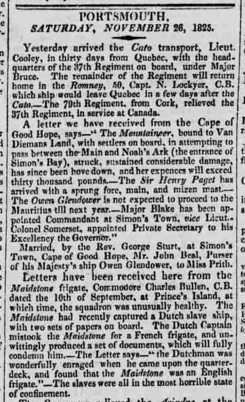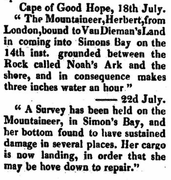 Based on the information we have currently, I suggest Susan was likely to have been a twin sister to Edward Joseph, so born May 1801. This would agree with the census record. Otherwise she was probably born near the end of 1799 or early 1800 but this would have given only around 600 days between the births of Mary and Susan and between Susan and Edward. All the other options seem unlikely unless Susan was several weeks premature. Whether a twin to Edward or born 10 months prior, Susan would have been born at Church Lane, Bristol. An extensive search of all the Bristol parish registers has not located a baptism for Susan, or for her sisters except Frances. Susan would have accompanied her parents when they moved to Kent House, Hammersmith, London in around 1809 and survived the disease that killed her father and two siblings in early 1811. We presume she travelled to Canada with her mother in 1816 and returned with her to England, probably back to Bristol before 1824. Her mother died in Bristol in 1824 when Susan was probably only 17 years old. Departure for Van Diemen's Land (Australia)We do know that on 25 April 1825 Edward Joseph KEITH and his new wife Ann boarded the ship Mountaineer in Portsmouth, bound for Van Dieman's Land (Tasmania) and then on to Sydney, via Cape Town. We also know that Edward with Ann and two of his sisters (Fanny and Jessica) eventually arrived in Sydney. On its way into Cape Town on 14 July 1825 the ship struck a rock and was badly damaged. Its cargo would need to be unloaded so repairs could be carried out. The passengers would be stuck in Cape Town for nearly 3 months. It appeared that Edward Joseph had a problem on his hands - three very eligible teenage sisters who had nothing to do but attract the attention of the well-to-do gentlemen of the Cape Town society. The sisters were accompanied by Edwards's wife Ann (aged 32) and their housekeeper Mrs Saunders. The problems with the Mountaineer were reported in Lloyd's List in London and provincial newspapers.