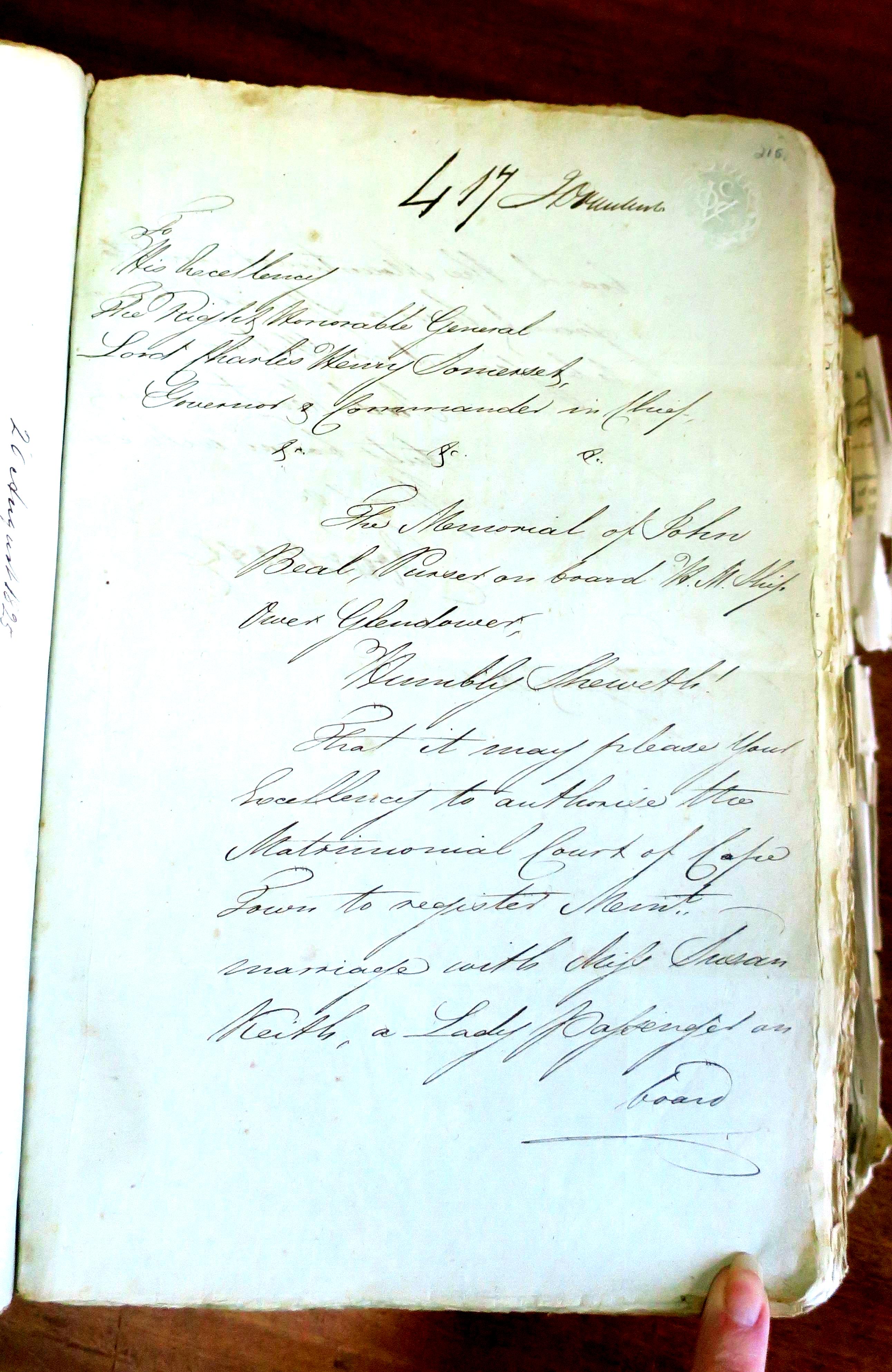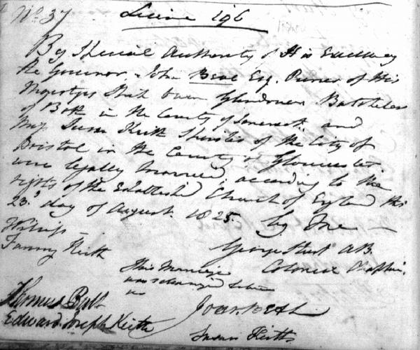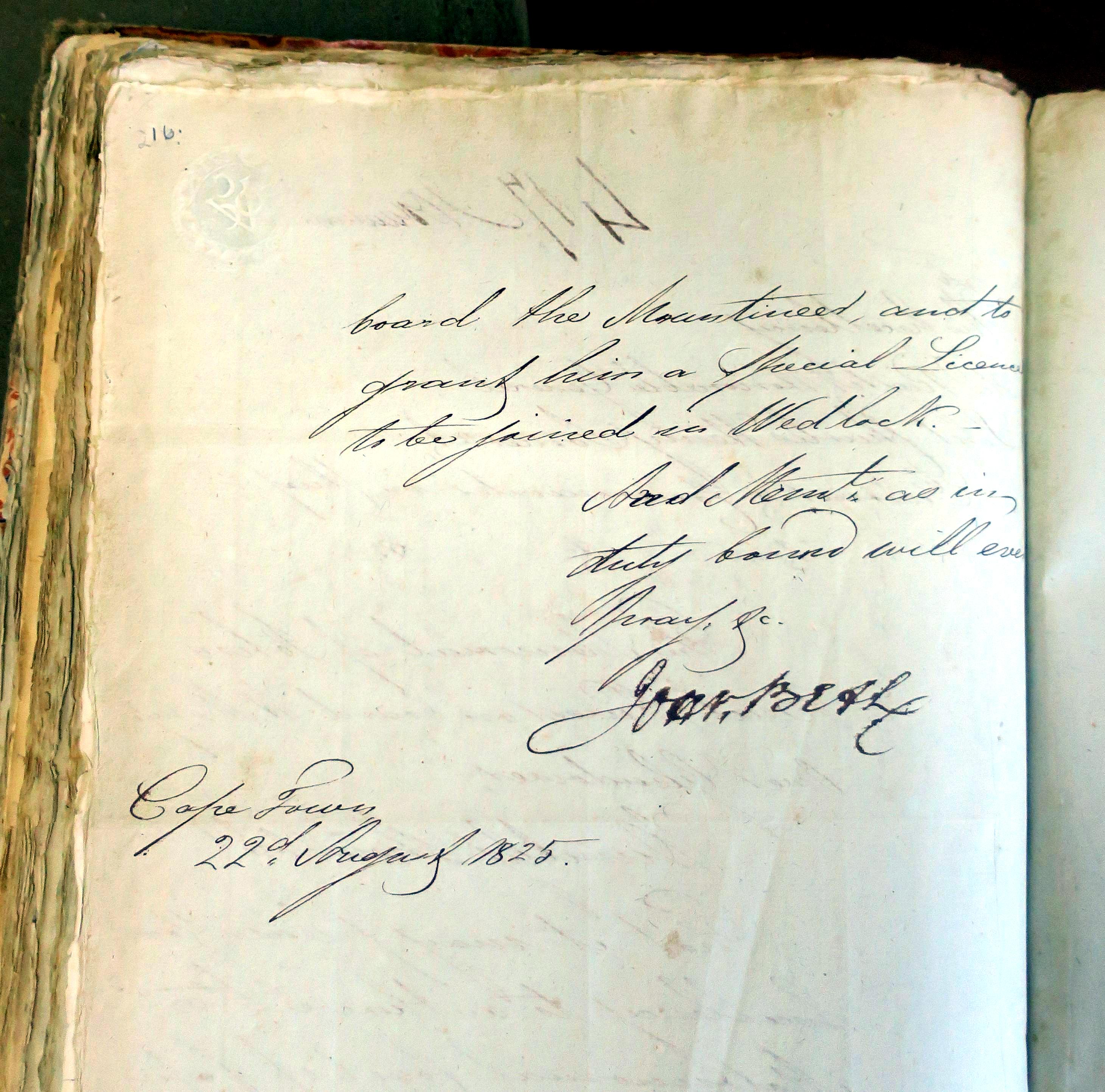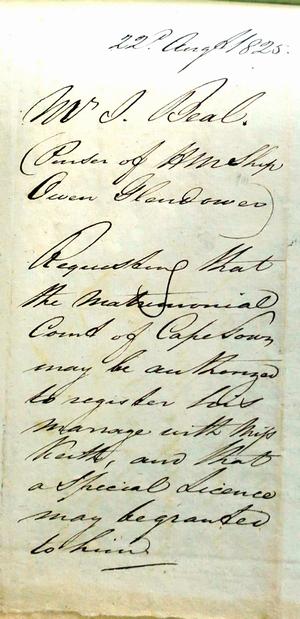 The newspaper report mentions that a "Miss Prith" had married a John BEAL, purser on board His Majesty's Ship Owen Glendower, Miss PRITH being a mis-transcription of KEITH. Following up this reference has produced two vital documents - John BEAL's application for a special marriage licence, and the marriage record itself. Together they confirm that John BEAL did indeed marry Susan KEITH, and that Susan was a passenger on board the Mountaineer, thus confirming she was Edward's sister. Marriage of Susan KEITH to John BEAL Esq, Purser in the Royal NavyJust 39 days after the ship Mountaineer arrived in Cape Town with a hole in its hull, a John BEAL Esq petitioned the local Governor and Matrimonial Court for permission to marry. The marriage licence (number 196) was granted, so the next day, on 23 August 1825 Susan KEITH married John BEAL in the Colonial Church at Simon's Town. The service was conducted by the Rev. George STURT, Colonial Chaplin. Importantly, the witnesses included Fanny KEITH and Edward Joseph KEITH, Susan's sister and brother. So Edward now had one sister off his hands, two more to go. It would appear that Fanny had become enamoured with the dashing Dr Robert Montgomery MARTIN, fresh off a voyage of discovery around Africa. He followed Fanny to Sydney and married her on 13 November 1826. Only Jessica, aged 16, escaped the marriage suitors in Cape Town. She never did marry. Return to BritainJohn BEAL and the Owen Glendower remained on the Africa station until early 1828 when they returned to Britain. Susan would have lived in Simon's Town during this period, with John away at sea for days to months at a time. John was paid off from the ship on 16 August 1828 after a term of almost 5 years. he then would have been on shore (in Exeter) until his next appointment on the Sparrowhawk on 11 June 1829. He was paid off again on 12 March 1831. Birth of their daughter Sophia Jesse (Jessica) BEAL in 1829We do not know how or when Susan arrived back in England. Presumably she travelled back from Cape Town on a commercial ship rather than on one of His Majesty's warships, although as an officer John could have sought the captain's permission to have Susan onboard but the dates associated with the next event in their lives suggests otherwise. Their first (and only) child was baptised in London on 30 September 1829.