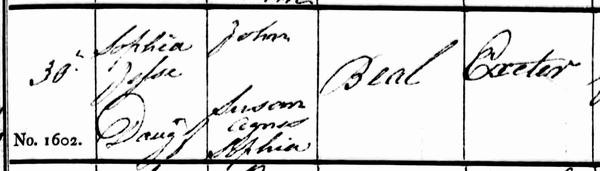 It is not clear why Sophia (Jessica) was baptised at Southwark, when the BEAL family was resident in Exeter. We know that Susan's sister Fanny was living with Robert MARTIN in The Strand, London (before she eloped with John SHERIDAN in 1831). John BEAL was posted to HMS Sparrowhawk on 11 June 1829, so if he was at sea soon after, he was away when his daughter was baptised and he may have been at sea when she was born. Perhaps Susan travelled to London to visit her sister and to have her daughter baptised with her family as witnesses.