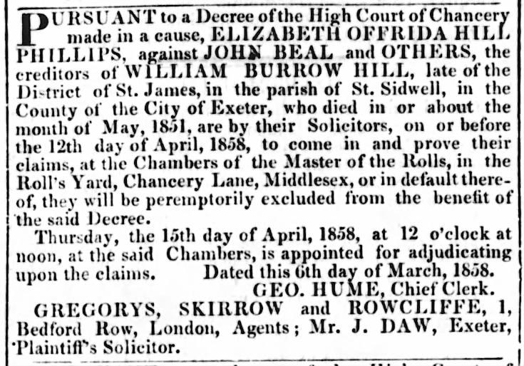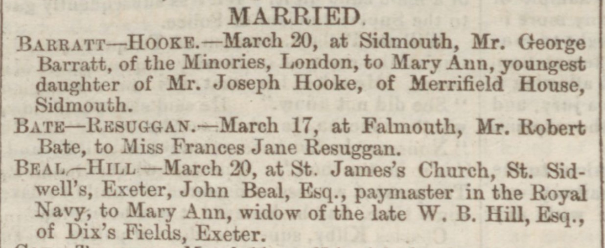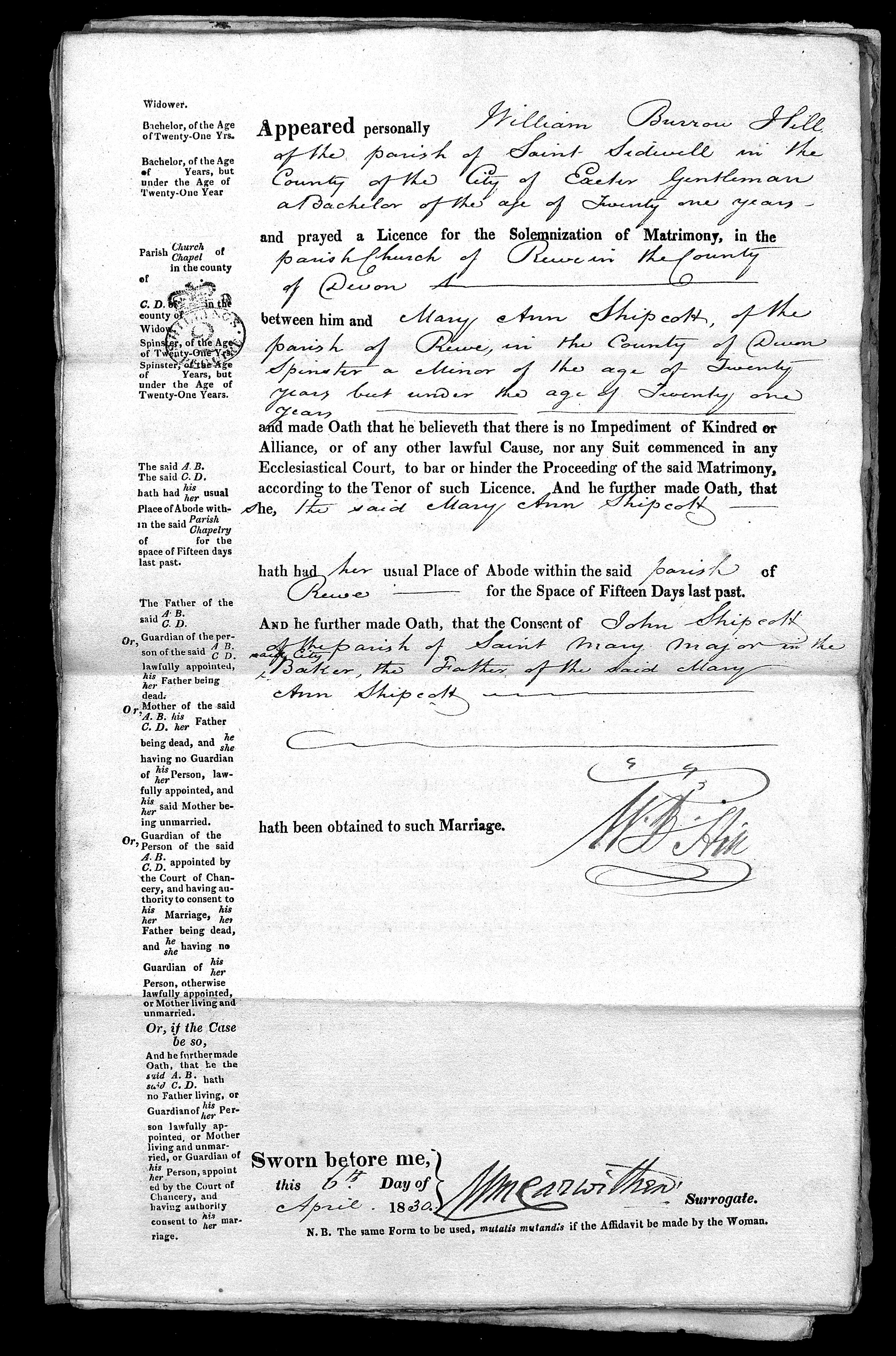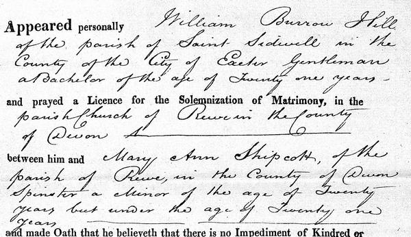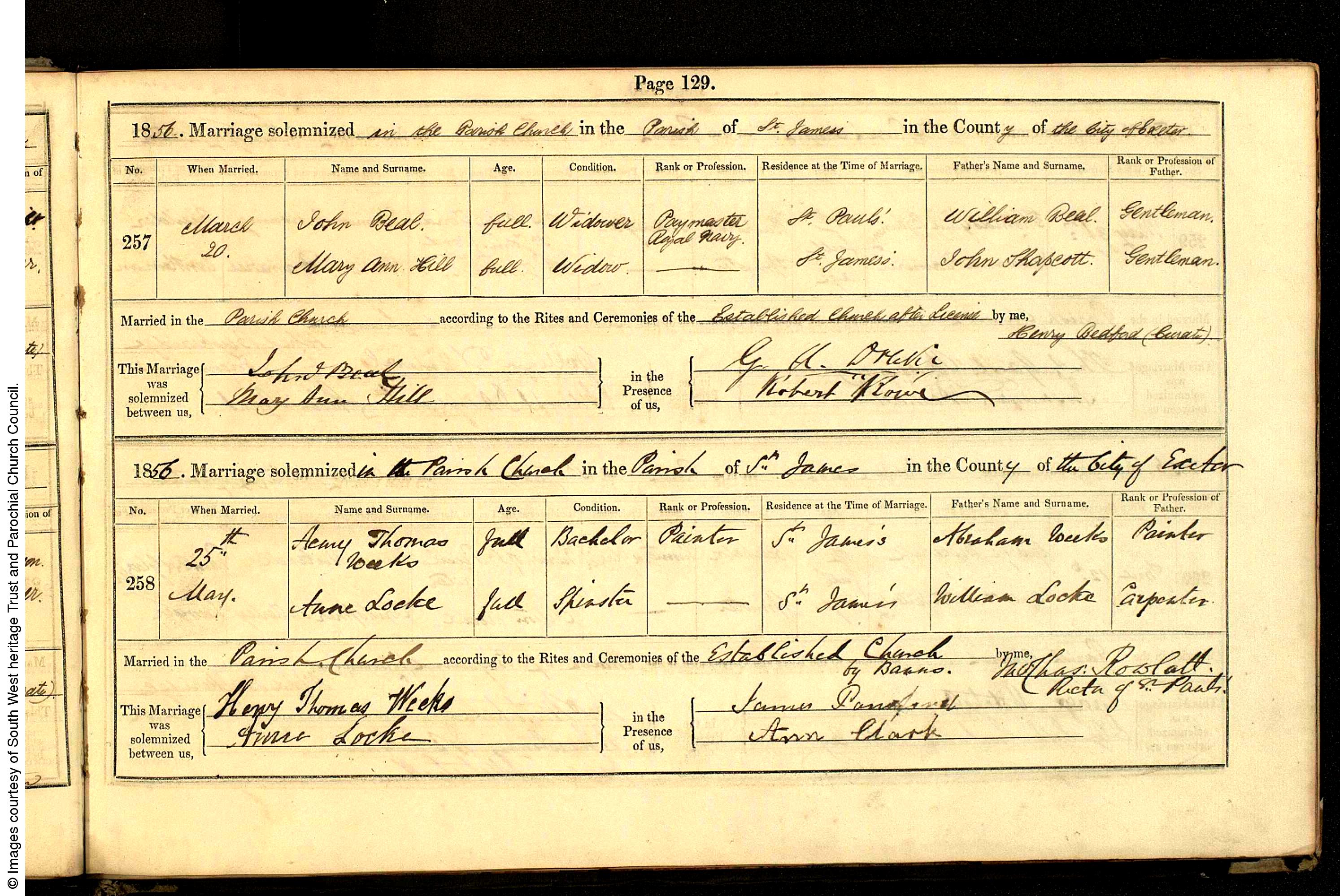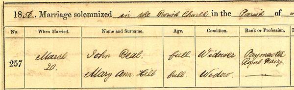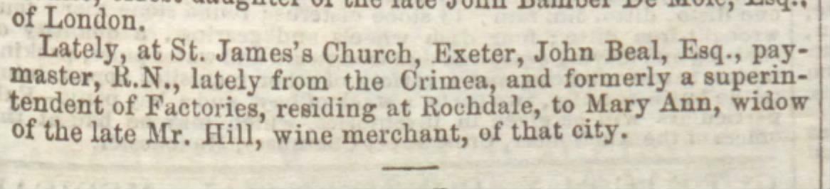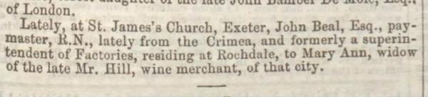 Marriage to Mary Ann HILLAs his wife Susan had died in 1852, John was now a widower, but not for long. On 20 March 1856, shortly after his return from Crimea, John married Mary Ann HILL a widow. She had been married to William Burrow HILL a wine and spitit dealer from Exeter.
