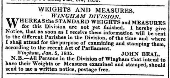 Half pay and a new careerJohn BEAL was paid off from the Sparrowhawk on 12 March 1831. He was aged about 34 to 38 and his time with the Royal Navy was effectively over. The Napoleonic and other wars had ended so the King laid up most of his warships. Officers were either pensioned off, or the more fortunate were sent home on half pay. John BEAL, a purser and strictly not a commissioned officer was on half pay. He returned to his property in Heavitree, Exeter and promptly looked for a new role. It is not clear what role he found, but in January 1835 he was the Inspector of Weights and Measures, notifying the citizens of Wingham, Kent that he would soon be available to certify their measures. This role had come about by a new Act of Parliament in 1834 that clarified two earlier Acts regarding the shape and size of standard measures for weight and capacity. The previous Acts had not been administered effectively so the new Act required all existing measures and new copies to be re-validated under the authority of the Auditor or Comptroller General, or some other Superintending Officer of the Exchequer at Westminster.