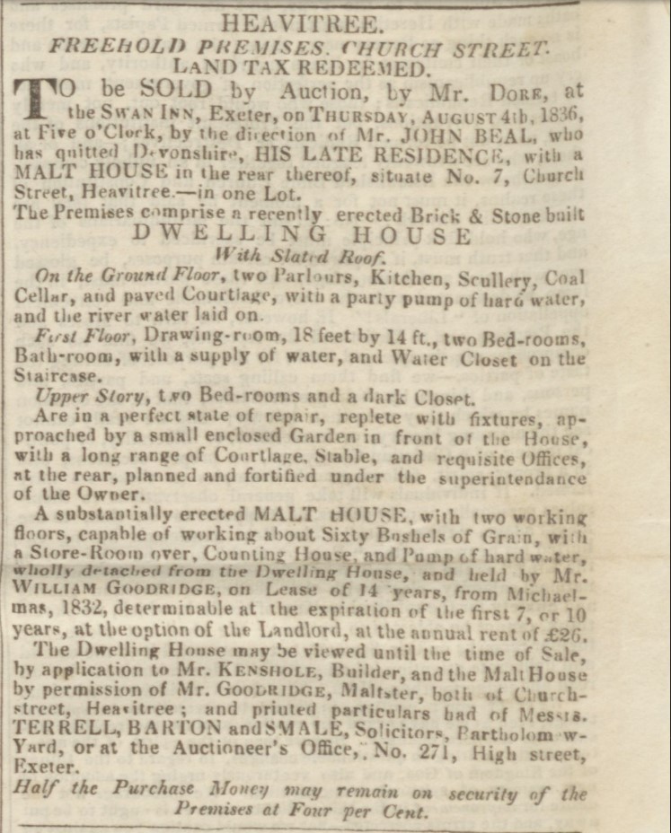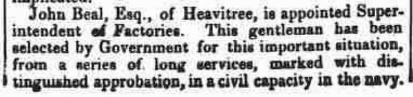 Superintendent of Factories and departure from HeavitreeNot deterred by his failure with the Poor Law auditorship, John BEAL was next apppointed to a key role as a Government Superintendent of Factories for the district of Rochdale in Lancashire. This required his to leave Heavitree in Exeter, and to sell his property there.