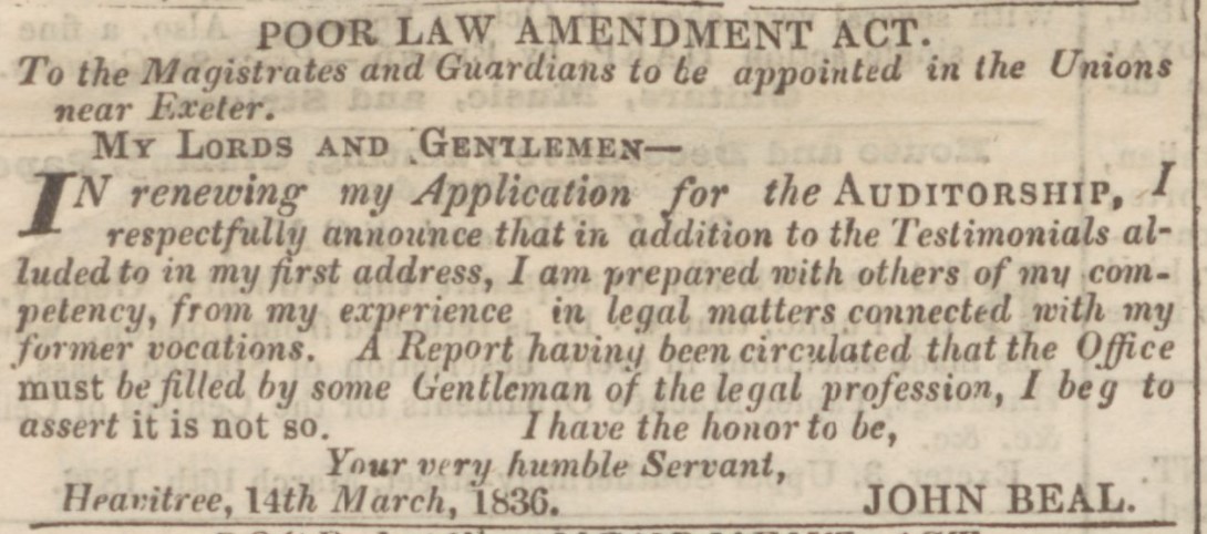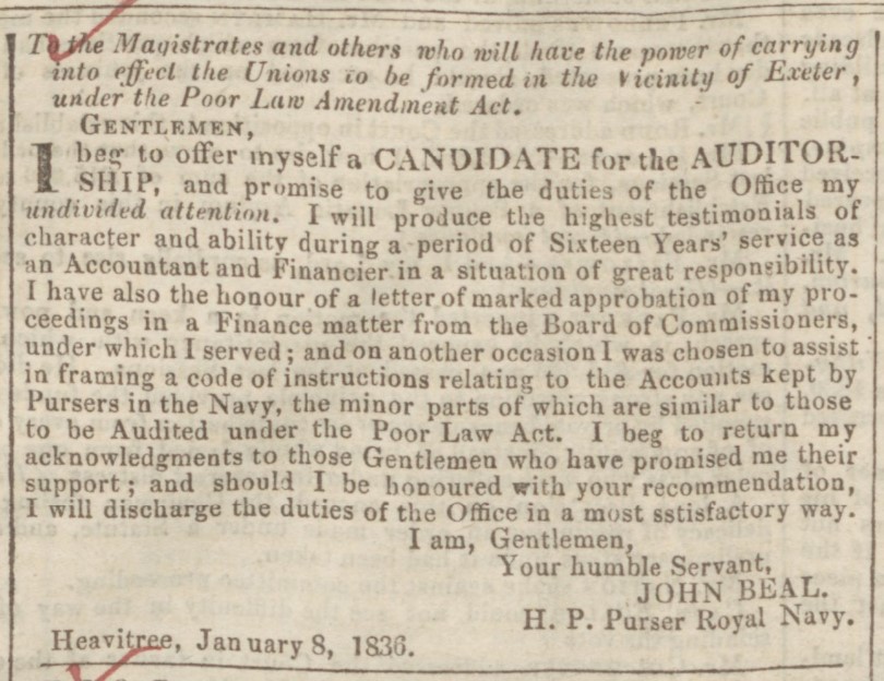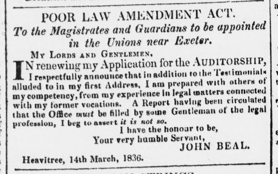 Either the weights and measures role ended or he tired of the travel, for in early 1836 he applied for the newy created position of auditorship of the Poor Law Unions, currently being combined under a new Act. He made several pitches for this role in the papers, but apparently was unsuccessful. It appears the role went to an incumbent from one of the Exeter parishes being united.