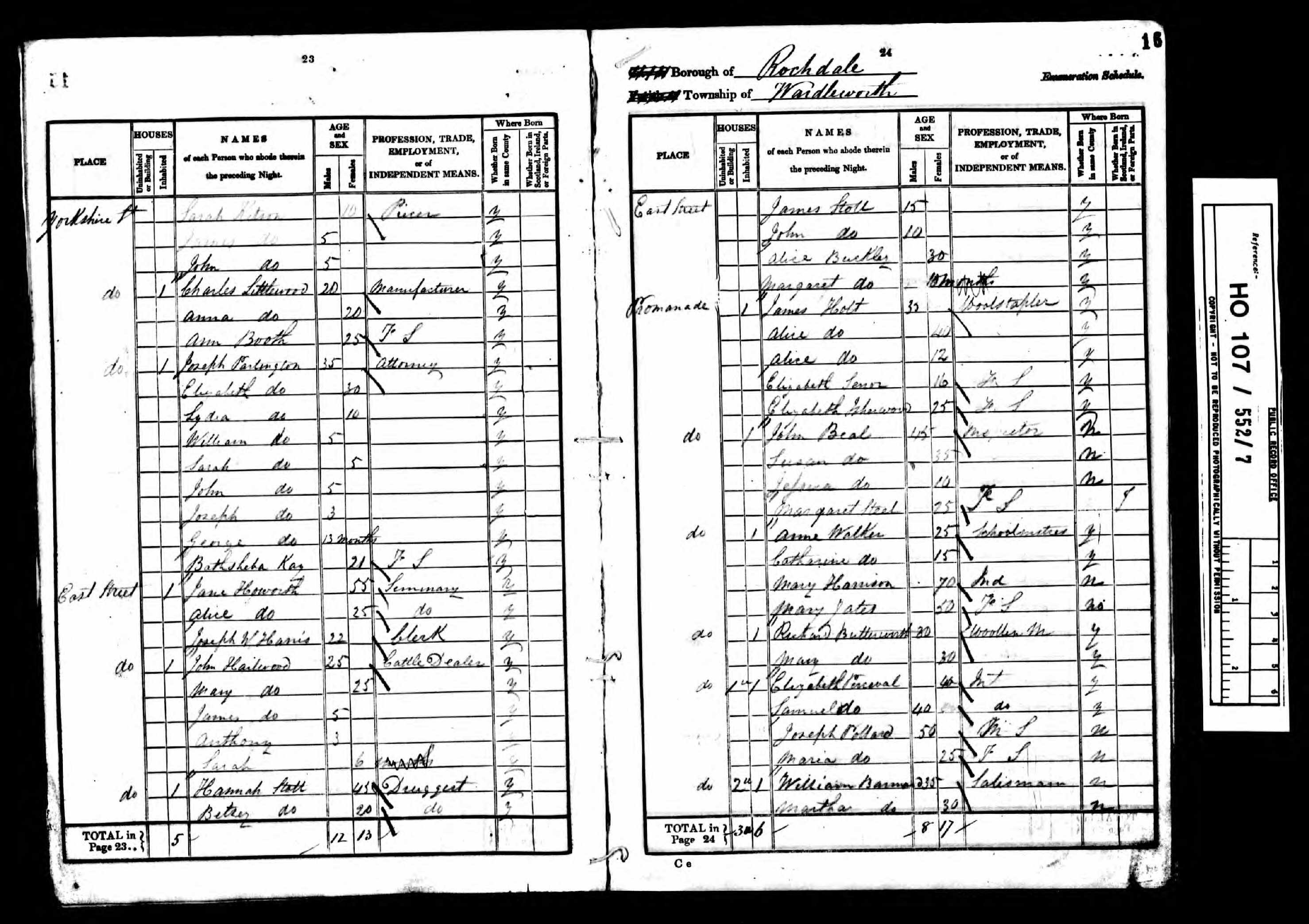 1841 CensusThe appointment of John BEAL as Superintendent enables us to find him in the 1841 census. The family was resident at the small township of Wardleworth, near Rochdale in Lancashire. This location is north of Manchester and a long way from Exeter. This is the census where ages were rounded down to the nearest 5. Jessica for instance would have been 12, but was recorded as 10.