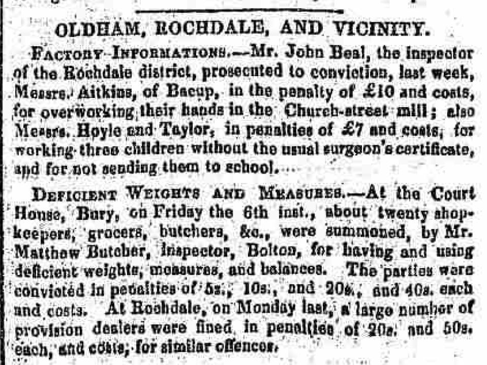 What was John BEAL doing in Rochdale? This 1843 newspaper article explains his role. Noteworthy is the other prosecution in the paper for deficient weights and measures - a role John BEAL had previously held.