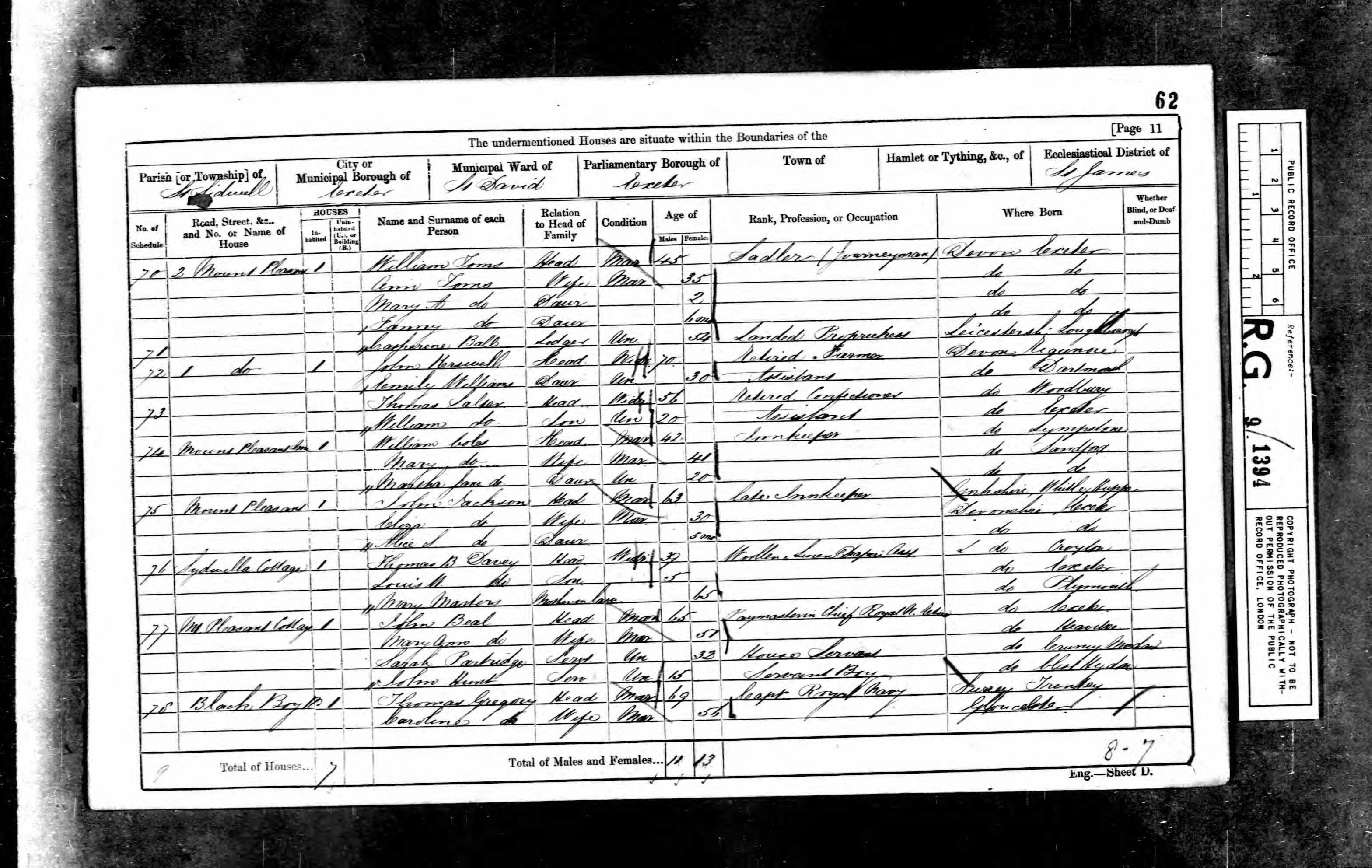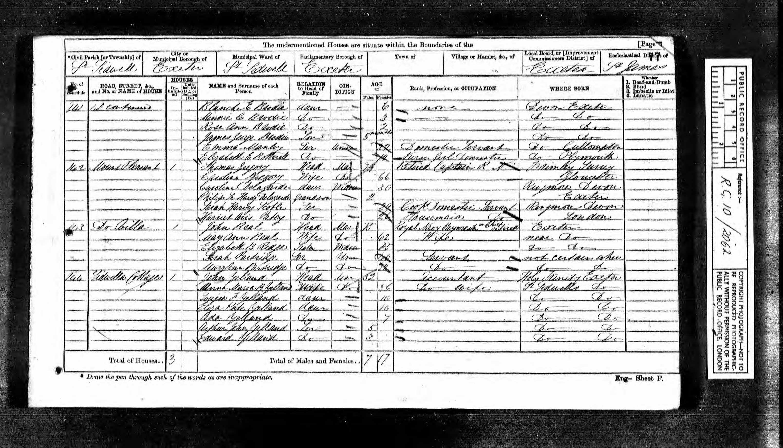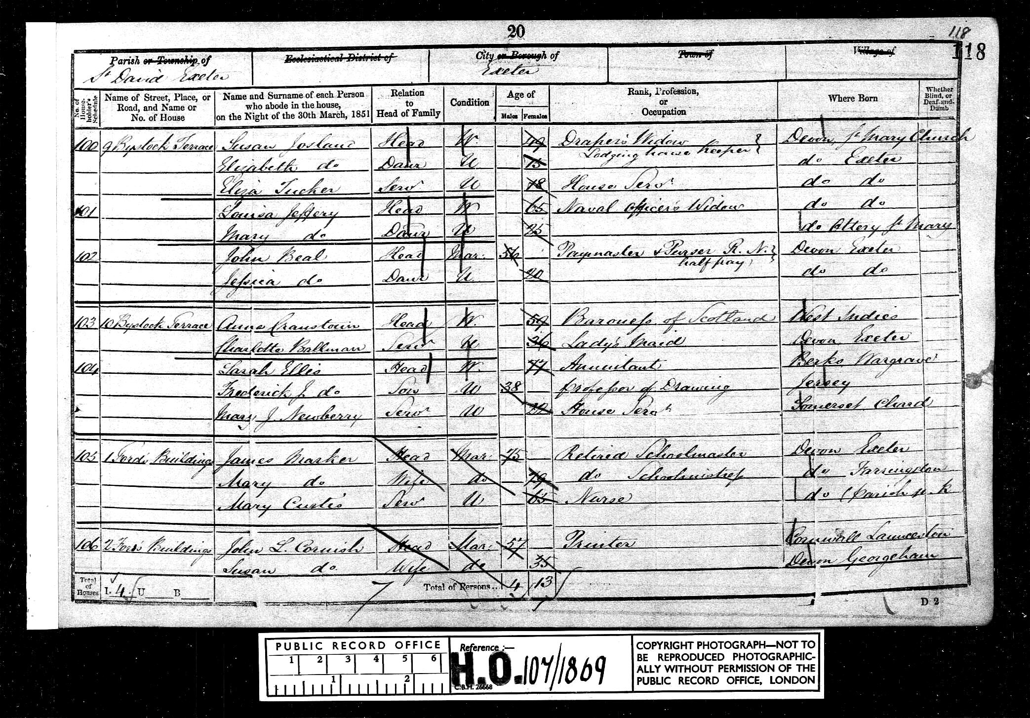 In the 1851 census, John and his daughter Jessica were living at 9 Bystock Terrace, St David, Exeter. He was 56 years old and had reverted back to being the purser in the Navy on half pay. Jessica was shown as age 20 but was in fact only 19.