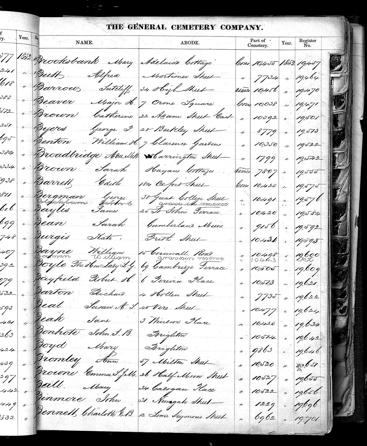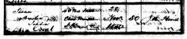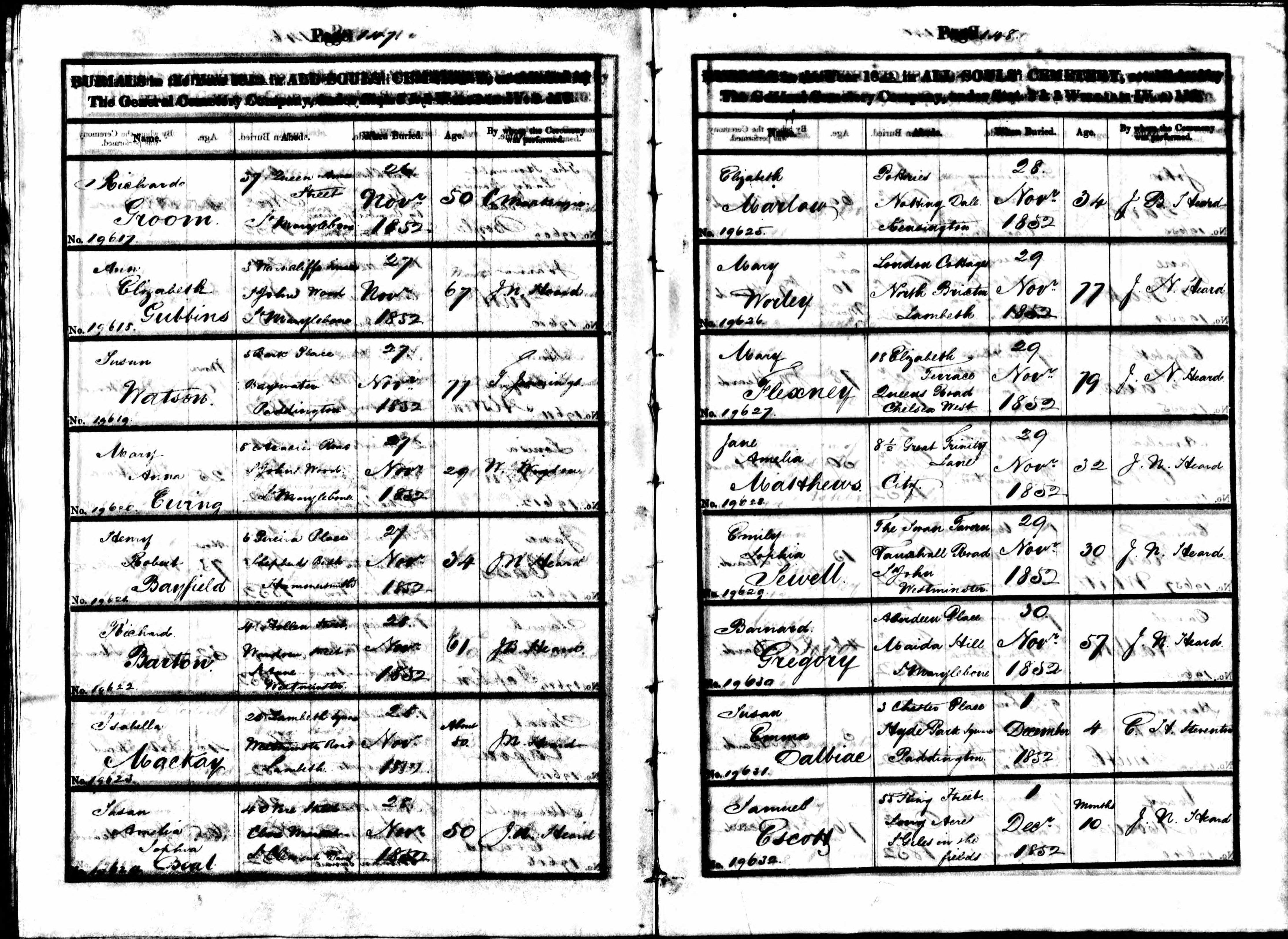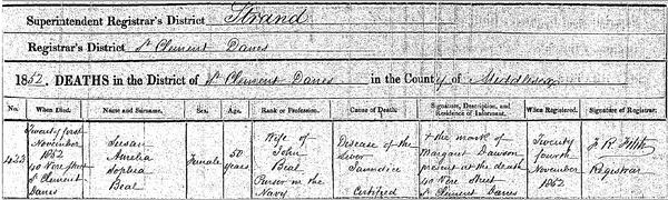 The last we know of Susan is her death on 21 November 1852 at 40 Vere St, St Clement Danes, London. Susan died of liver disease and jaundice. There are many causes of this, including poor diet, haemochromatosis and alcoholism. Susan's burial was recorded in the parish register at All Souls, Kensal Green, Kensington & Chelsea, London. Susan was buried at Kensal Green Cemetery, London. The grave, CONS/10477 has 12 other burials dated 1852 and 1853, suggesting it was a communal or pauper's grave. There is no record of a headstone. Why did Susan die in London, with only the illiterate Margaret Dawson present?