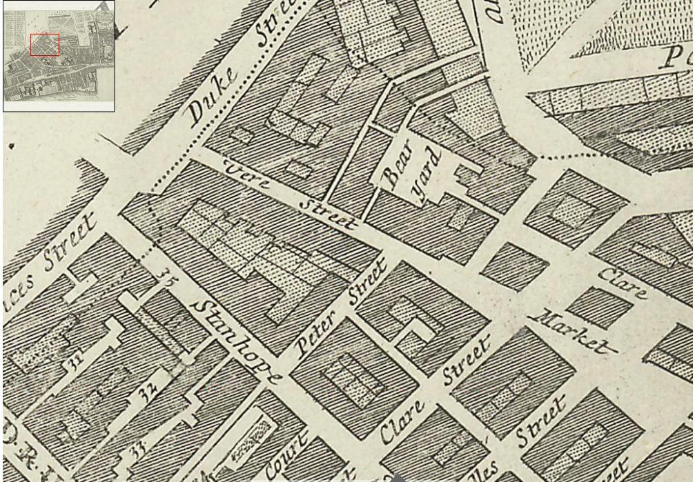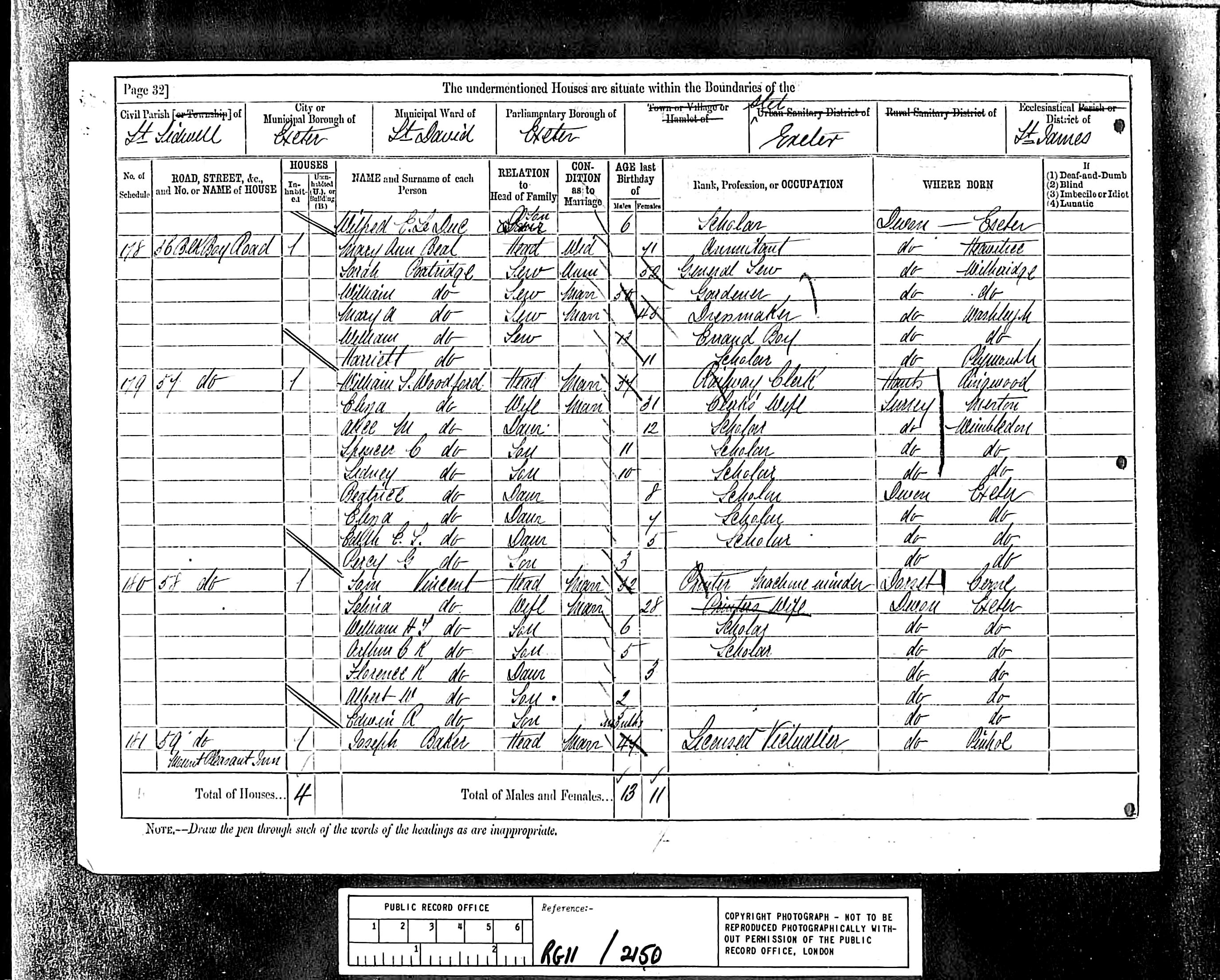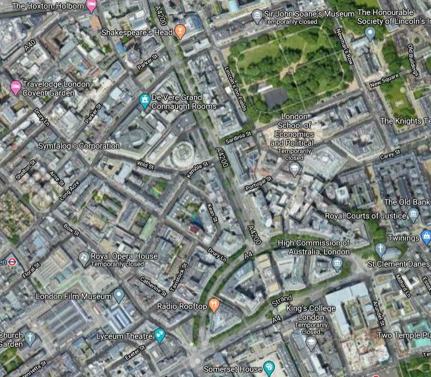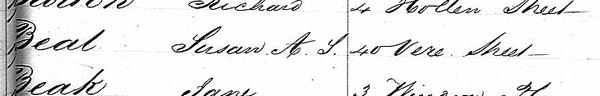 Although long demolished, 40 Vere St was close to the site of the Bulls Head Inn, just to the south-west of Lincoln Inn Fields. In the 1851 census the inn housed the publican and 2 guests. Vere street was part of a run down area of London that included the old Drury Lane and was referred to as Clare Market. Much of the area and its landmarks, such as the Old Curiosity Shop, were immortalized by the famous author Charles Dickens. The area was redeveloped by the London County Council in around 1900 to create the Aldwych and Kingsway, but this was not before 41 and 42 Vere St collapsed in 1874, leaving 40 Vere St uninhabitable. Vere St was replaced by the London School of Economics. This area is close to Clerkenwall where Susan's sister-in-law was living in 1851.